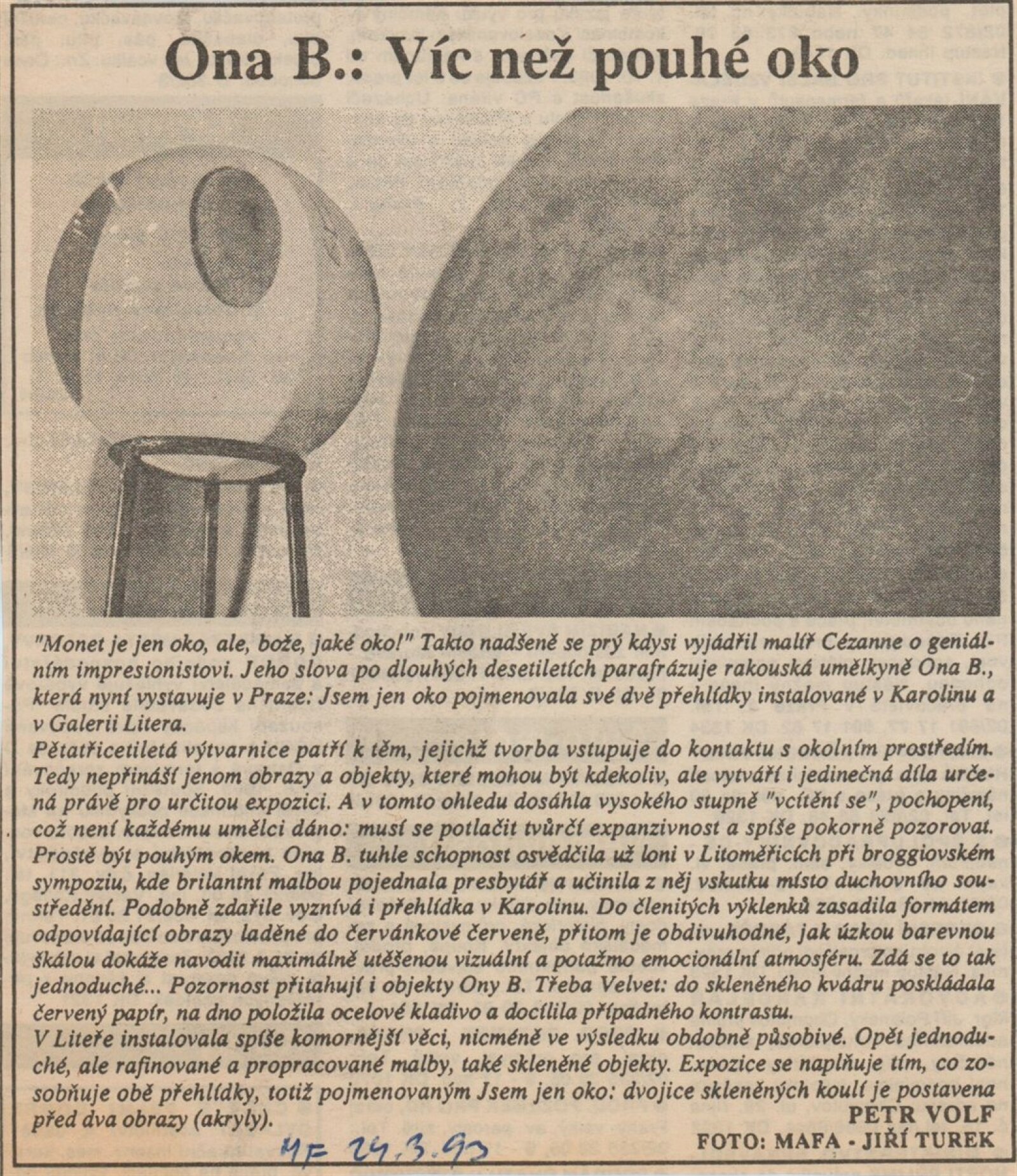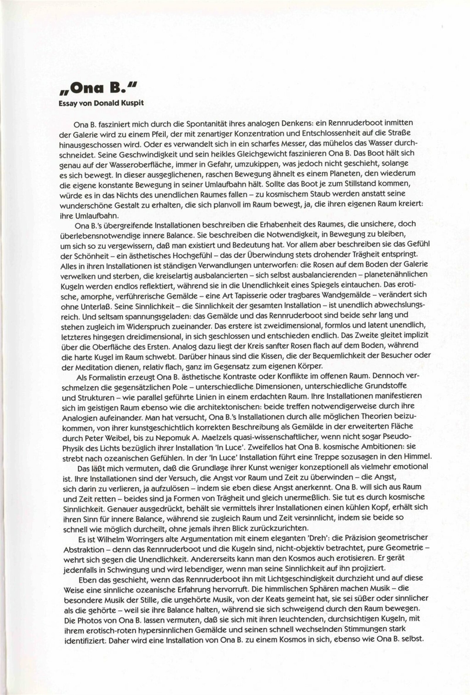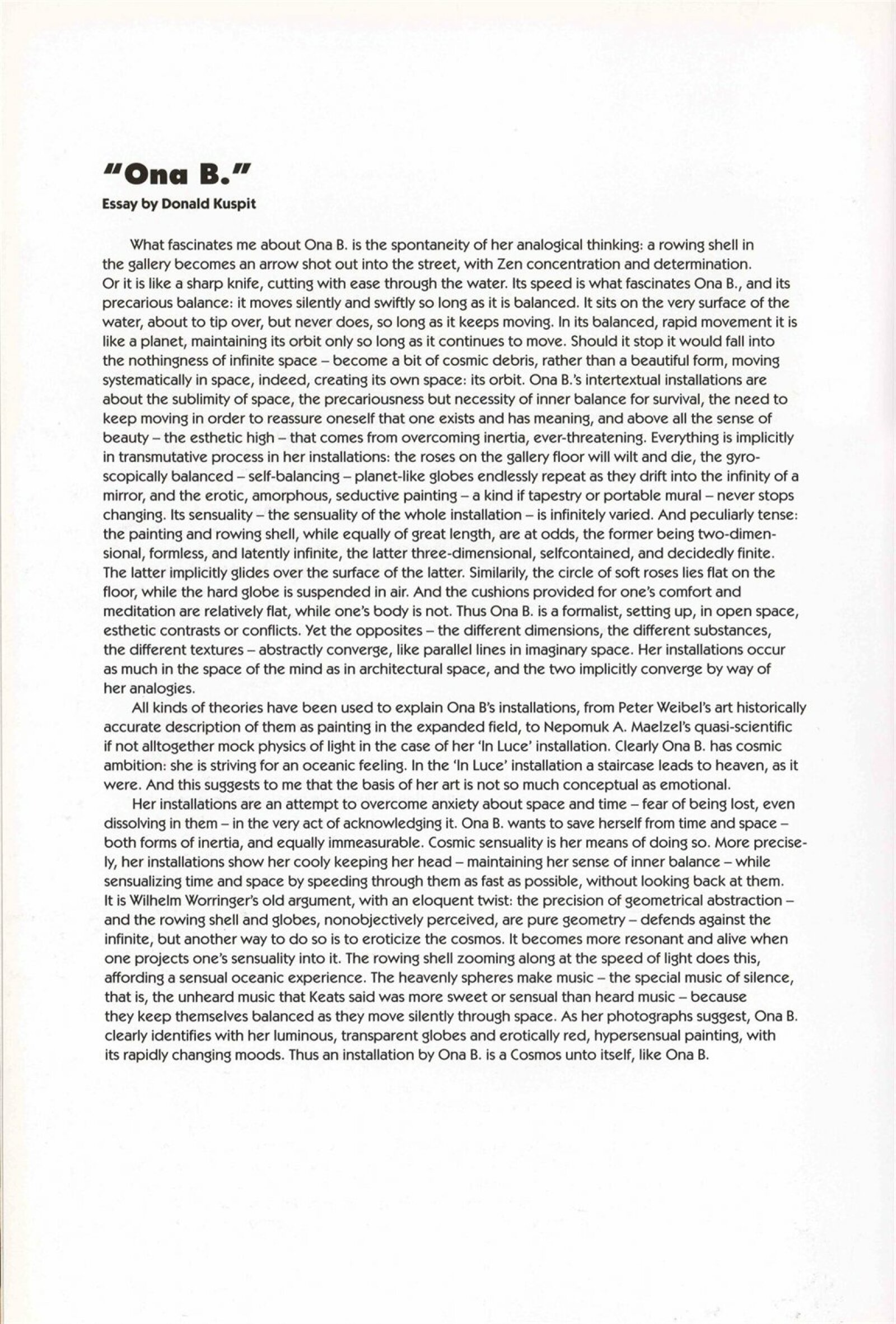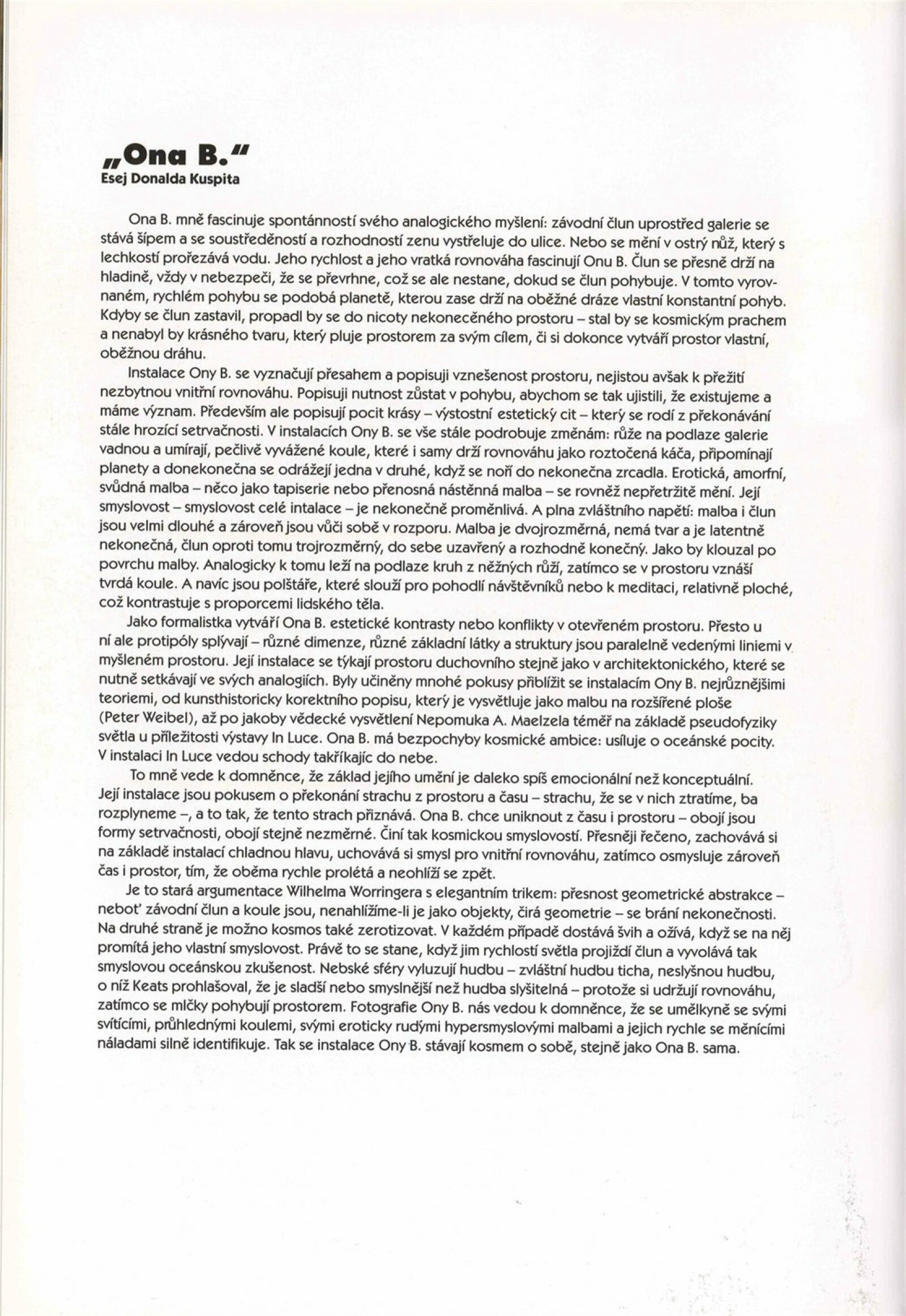 pozvánka na vernisáž a na tiskovou konferenci, katalogy, nátisky katalogu, fotografie výstavy a děl, strojopis pozvánky, text k výstavě (Vránová), text o tvorbě Ona B. - Donald Kuspit, korespondence o realizaci výstavy (J. Jílková, Ona B., Ch. Dollinger, J. Vránová), náklady spojené s výstavou, smlouvy k výstavě, provozní korespondence, recenze v tisku, poznámky, katalogy z jiných výstav umělců (1992-93)