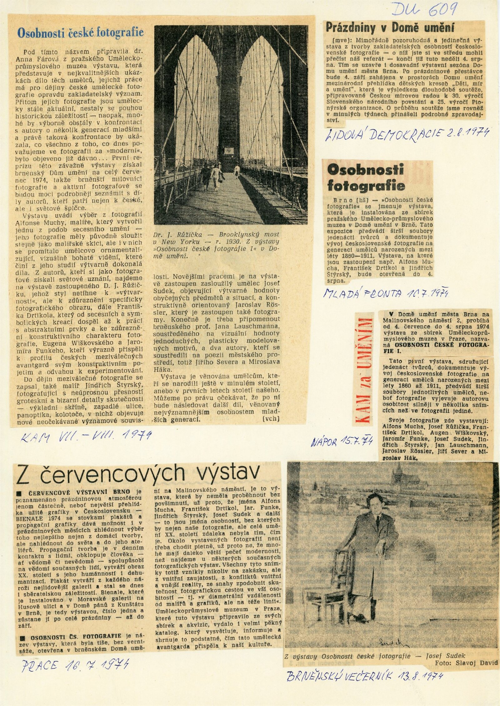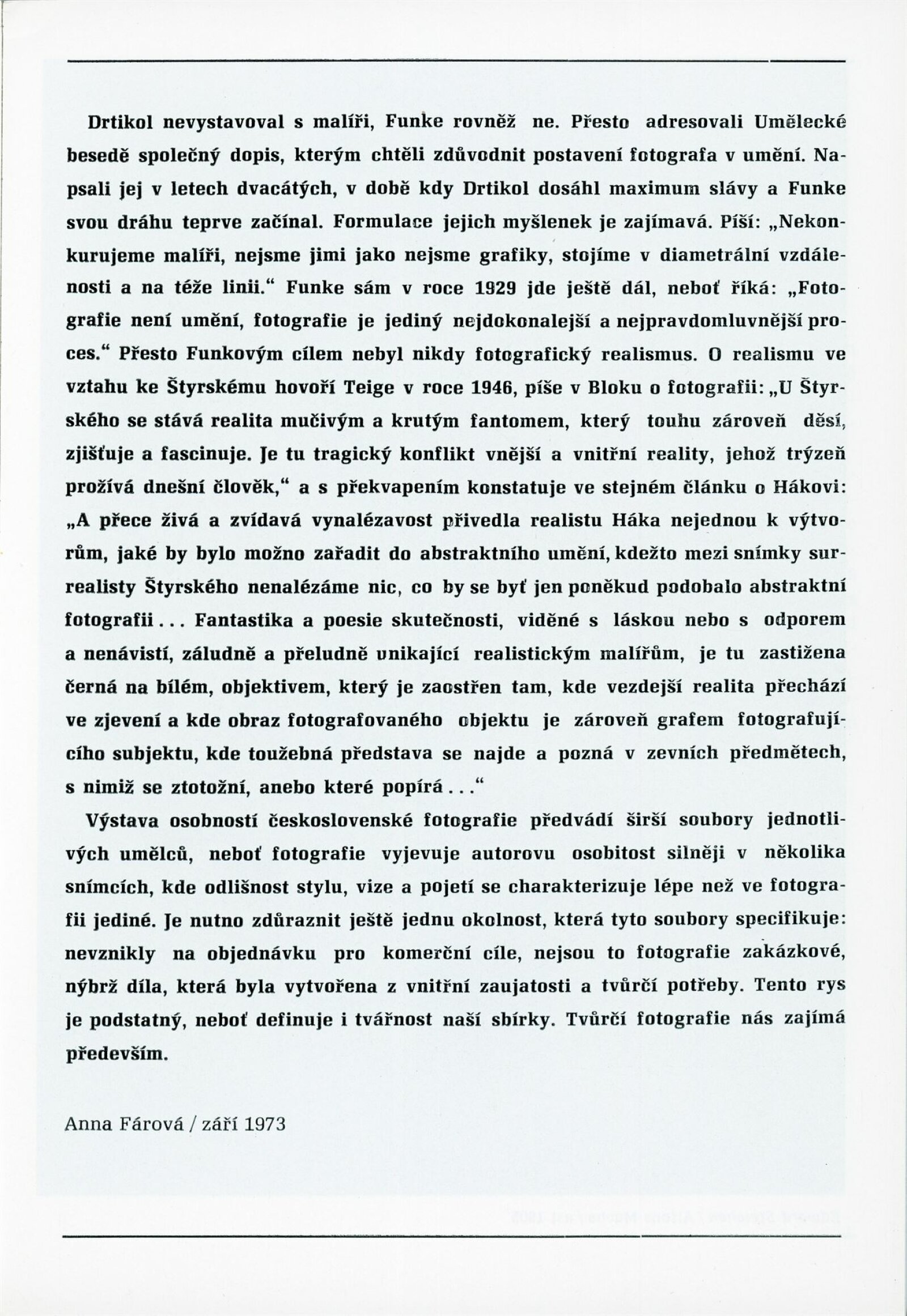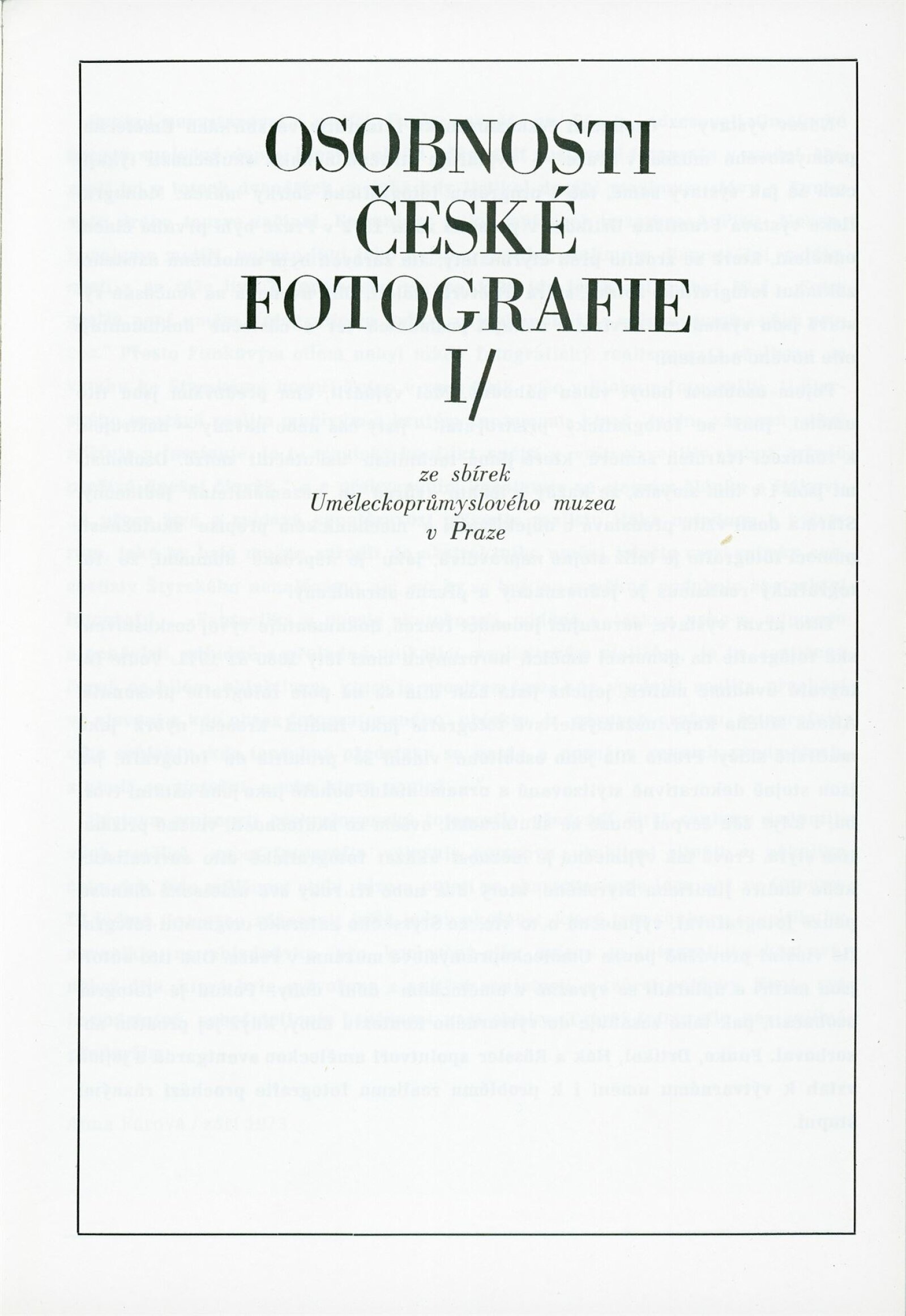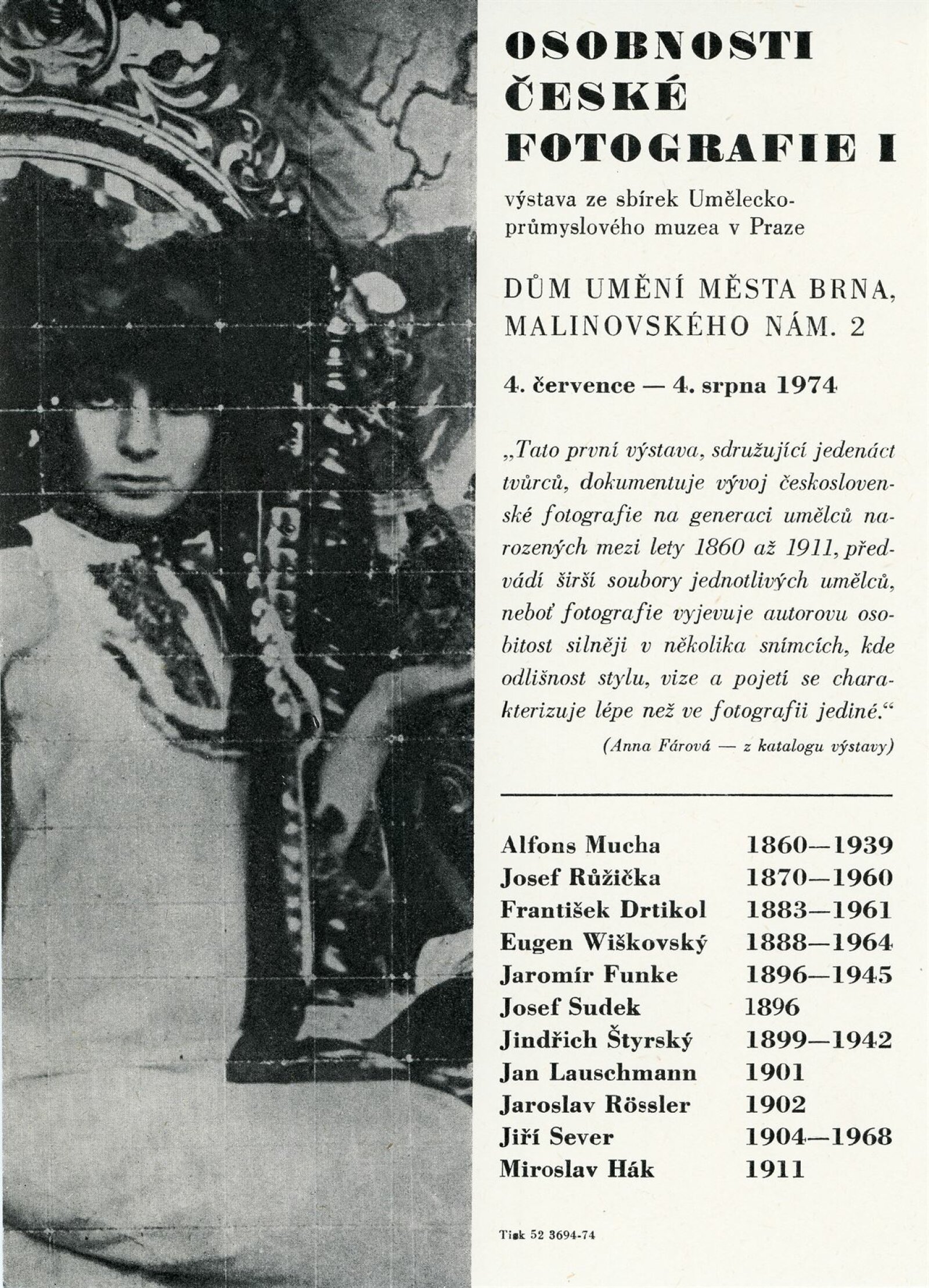 Osobnosti české fotografie I: Dům umění města Brna, 4. 7. – 4. 8. 1974 / Převzatý katalog. Osobnosti české fotografie I ze sbírek Uměleckoprůmyslového muzea v Praze: Uměleckoprůmyslové muzeum, únor–květen 1974 / Text: Anna Fárová. – Praha: Uměleckoprůmyslové muzeum, 1974. – 94 s., obr., seznam vystavených prací 4 s., portréty, DU 609