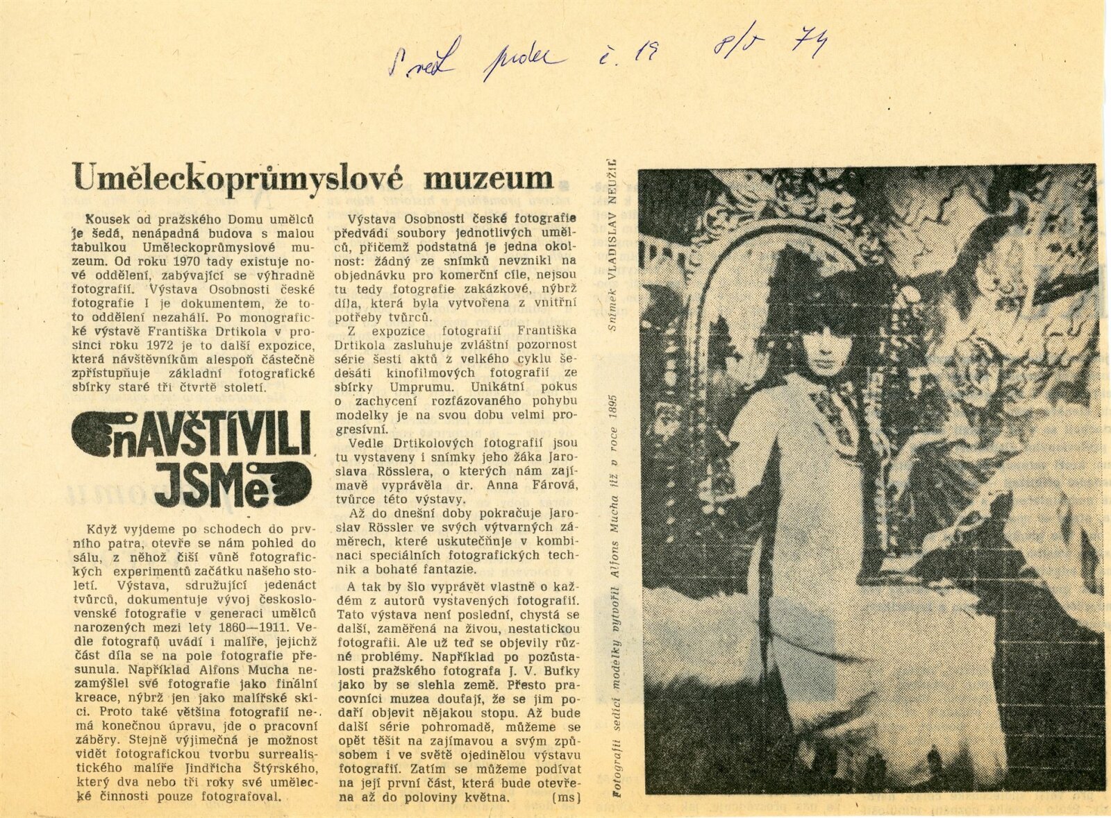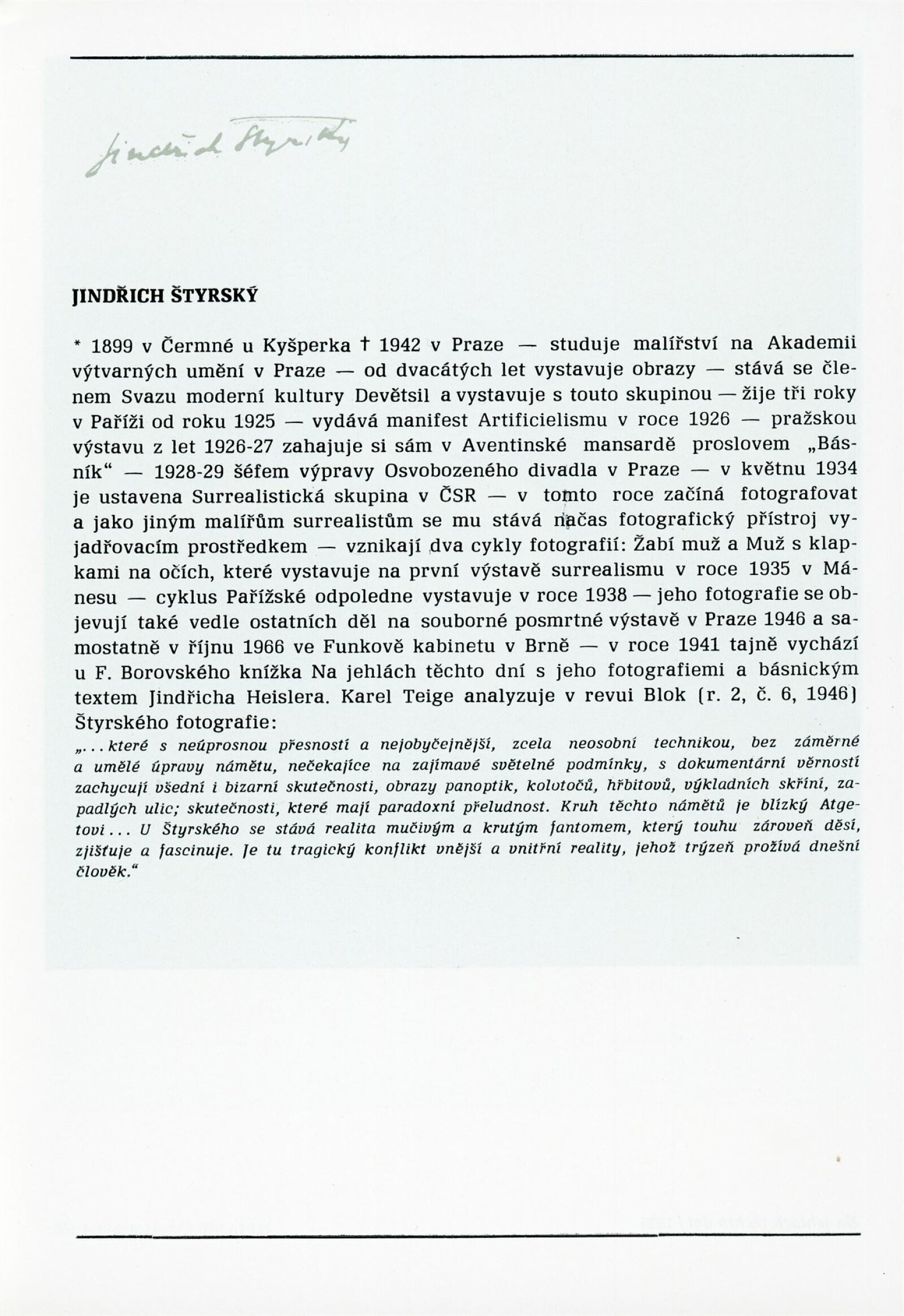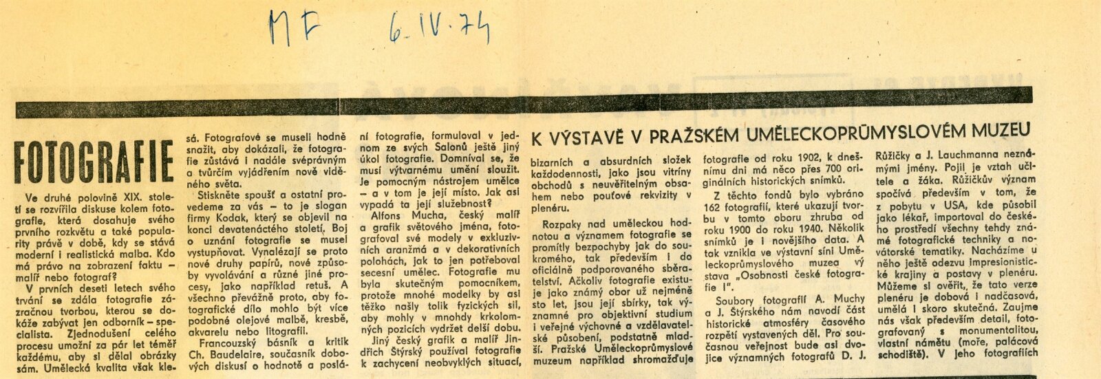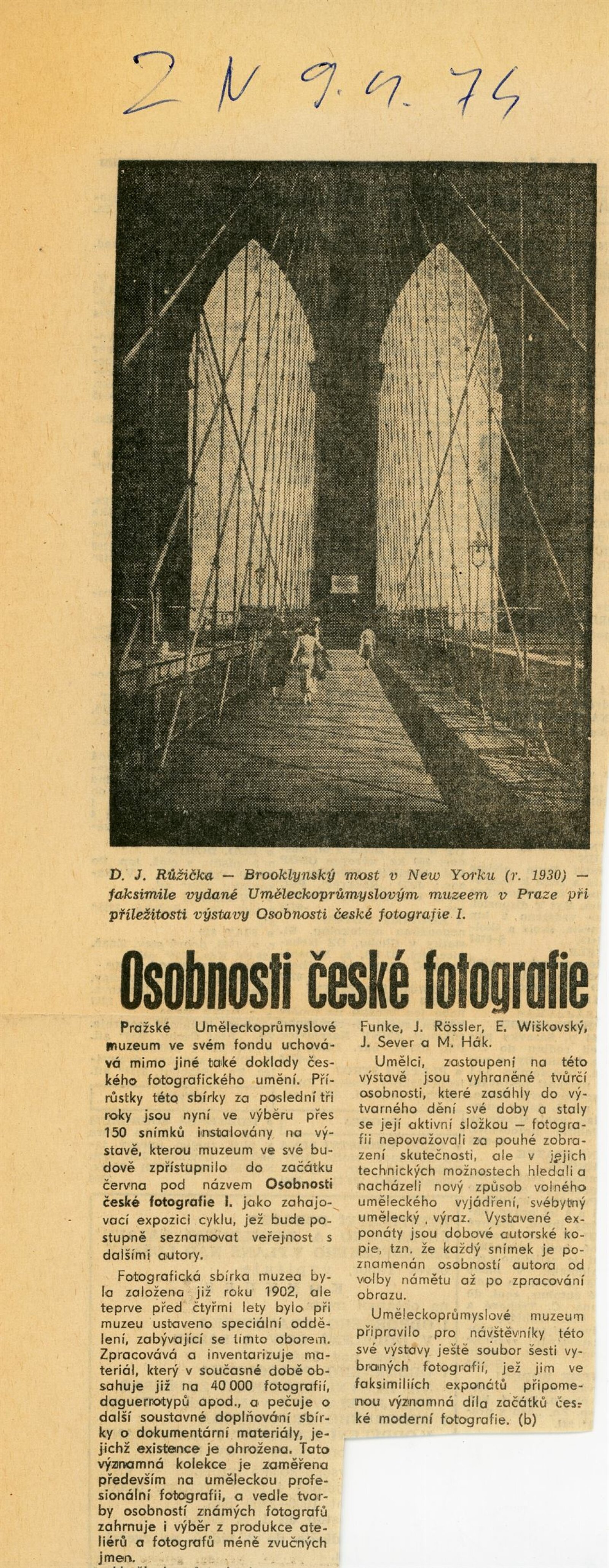 Osobnosti české fotografie I: Dům umění města Brna, 4. 7. – 4. 8. 1974 / Převzatý katalog. Osobnosti české fotografie I ze sbírek Uměleckoprůmyslového muzea v Praze: Uměleckoprůmyslové muzeum, únor–květen 1974 / Text: Anna Fárová. – Praha: Uměleckoprůmyslové muzeum, 1974. – 94 s., obr., seznam vystavených prací 4 s., portréty, DU 609