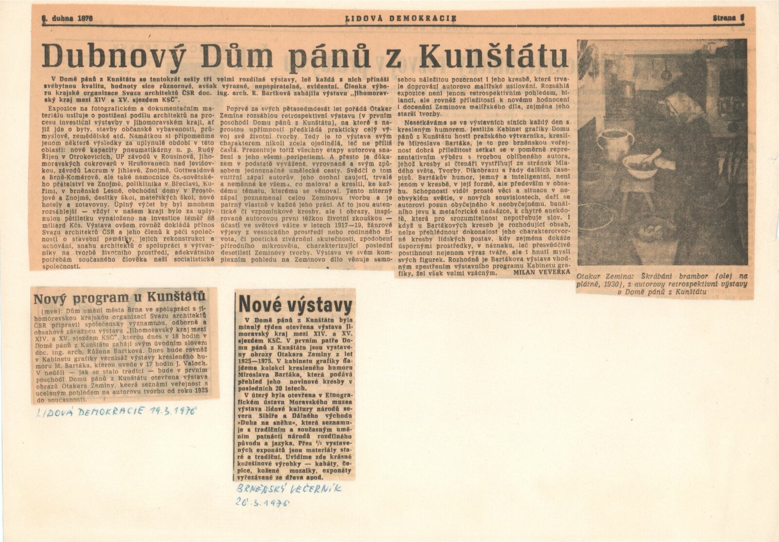 Otakar Zemina. Obrazy z let 1925–1975: Dům umění / Dům pánů z Kunštátu, 21. 3. – 18. 4. 1976 / Text: Nina Dvořáková. – Brno: DUmB, 1976. – 20 s., obr., portrét, životní data, DPK 626. – MZK; MG; MMB