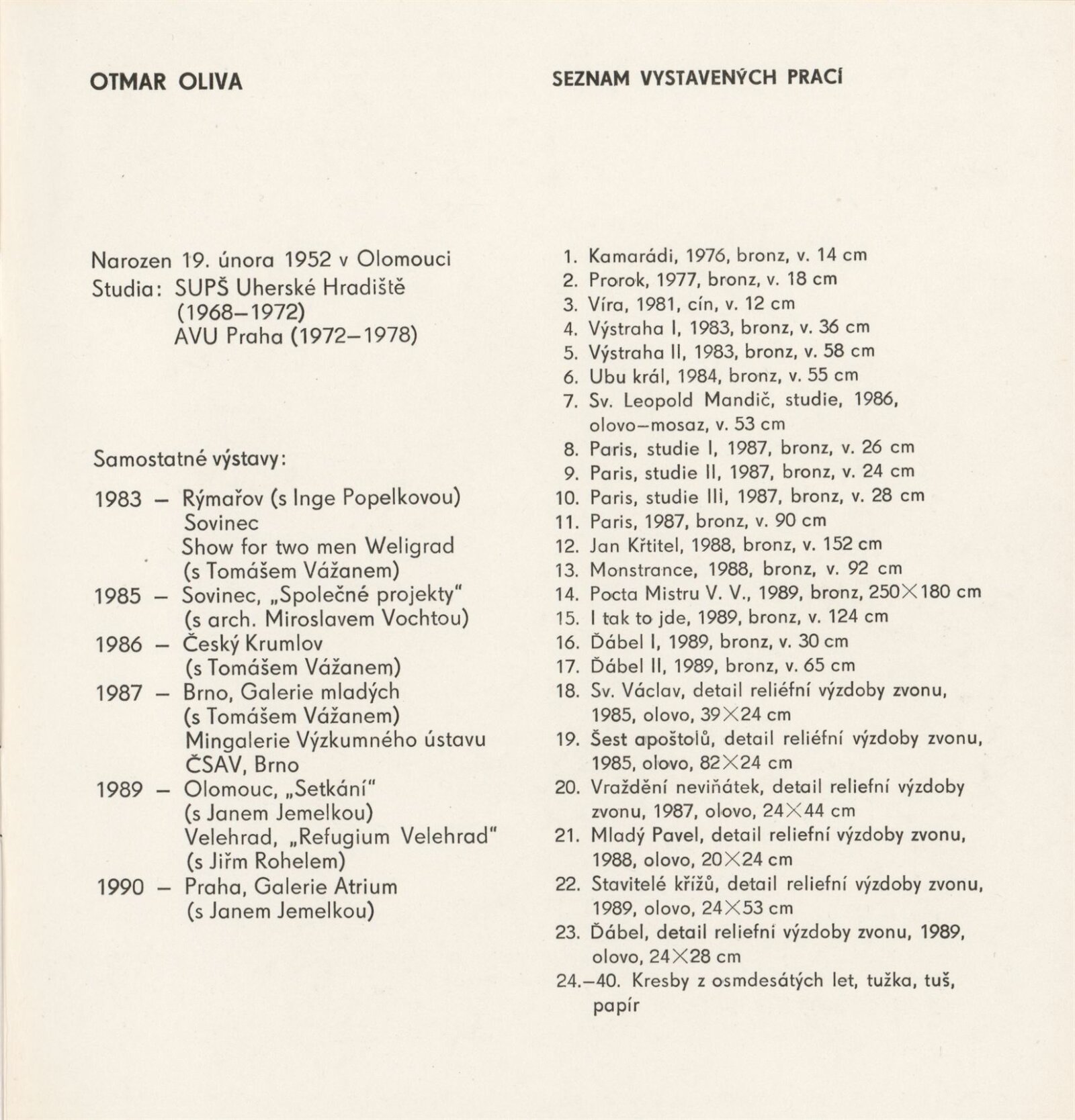 –Otmar Oliva. Sochy: Galerie Stará radnice, Síň Víncence Makovského, přízemí, 17. 4. – 20. 5. 1990 / Text: Jiřina Hockeová. – Brno: DUmB, 1990. – [13] s., obr., Životní data, výstavy, GSR 70. – MZK; MG
