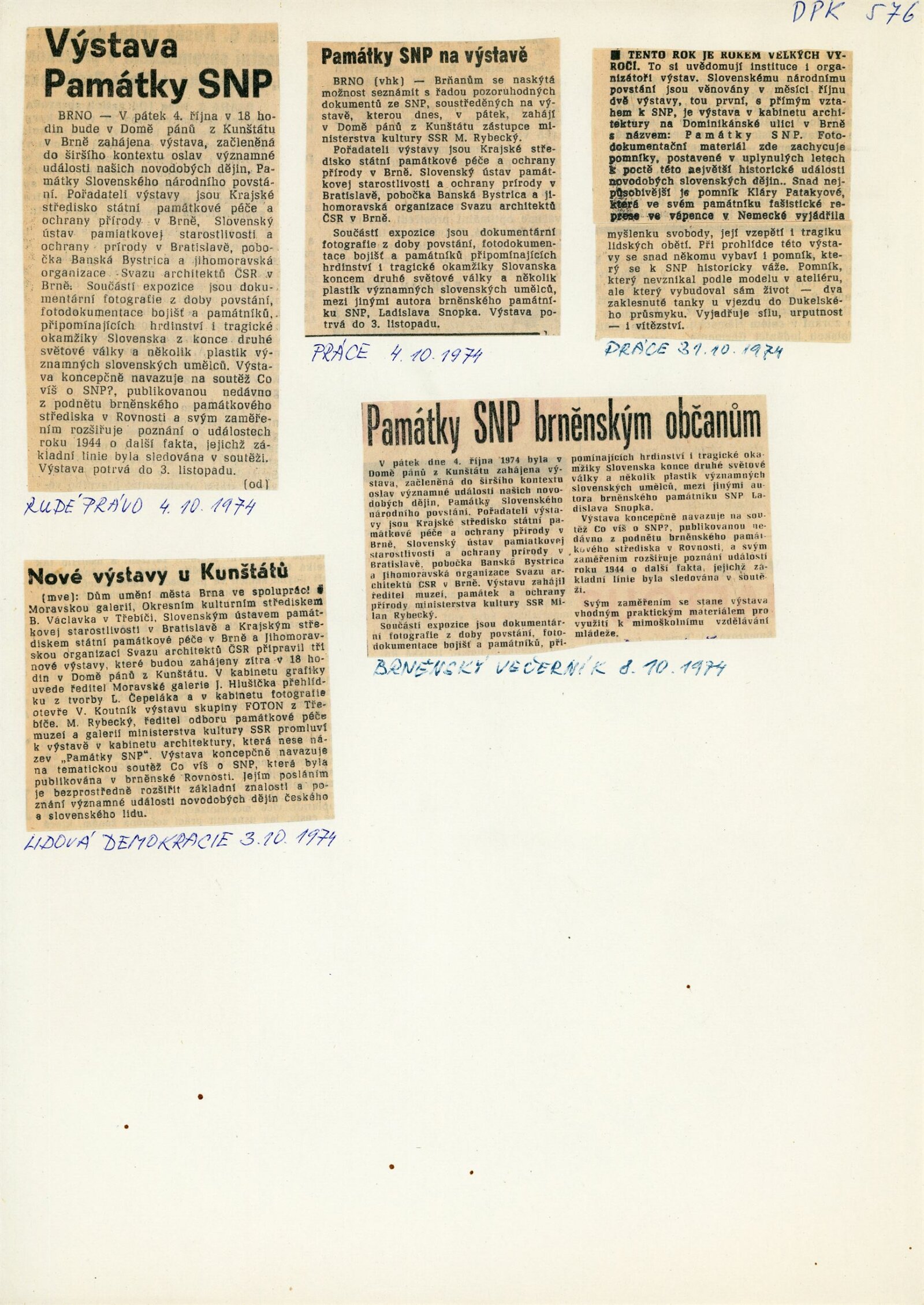 Výstava Památky Slovenského národního povstání: Dům umění / Dům pánů z Kunštátu, Kabinet architektury, 4. 10. – 3. 11. 1974 / Brno: Krajské středisko státní památkové péče a ochrany přírody, 1974. – 4 s., obr., DPK 576