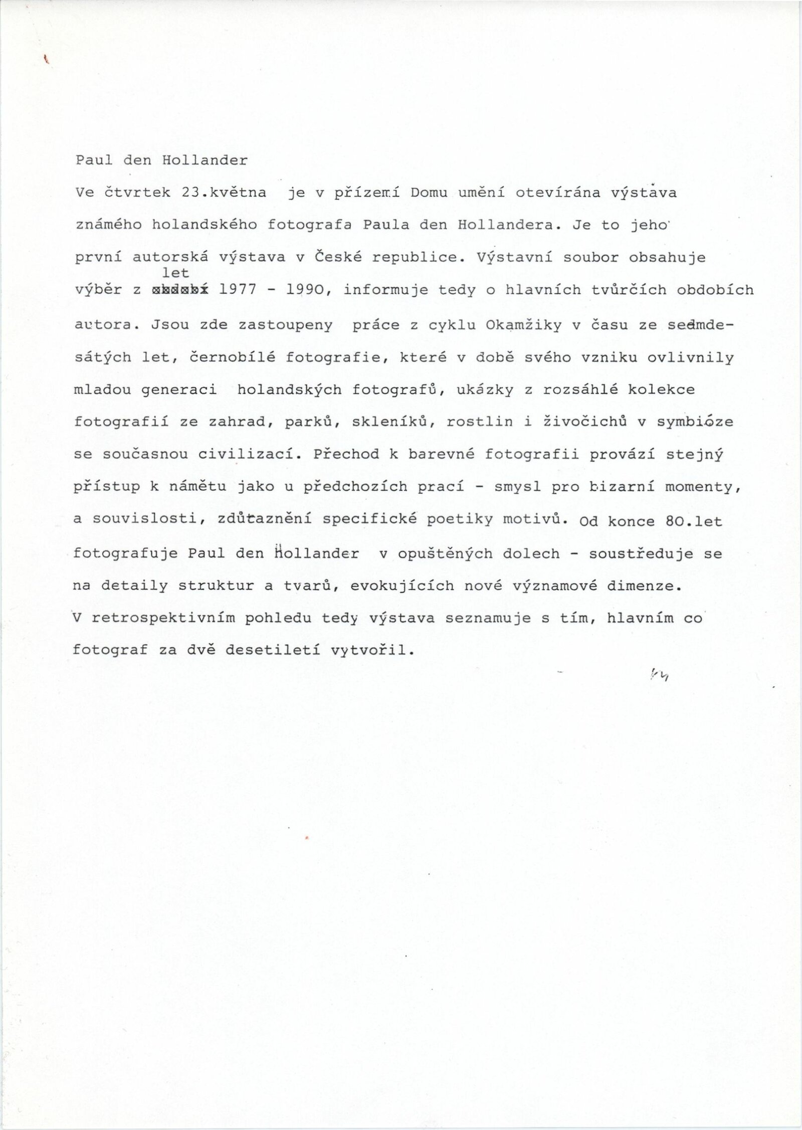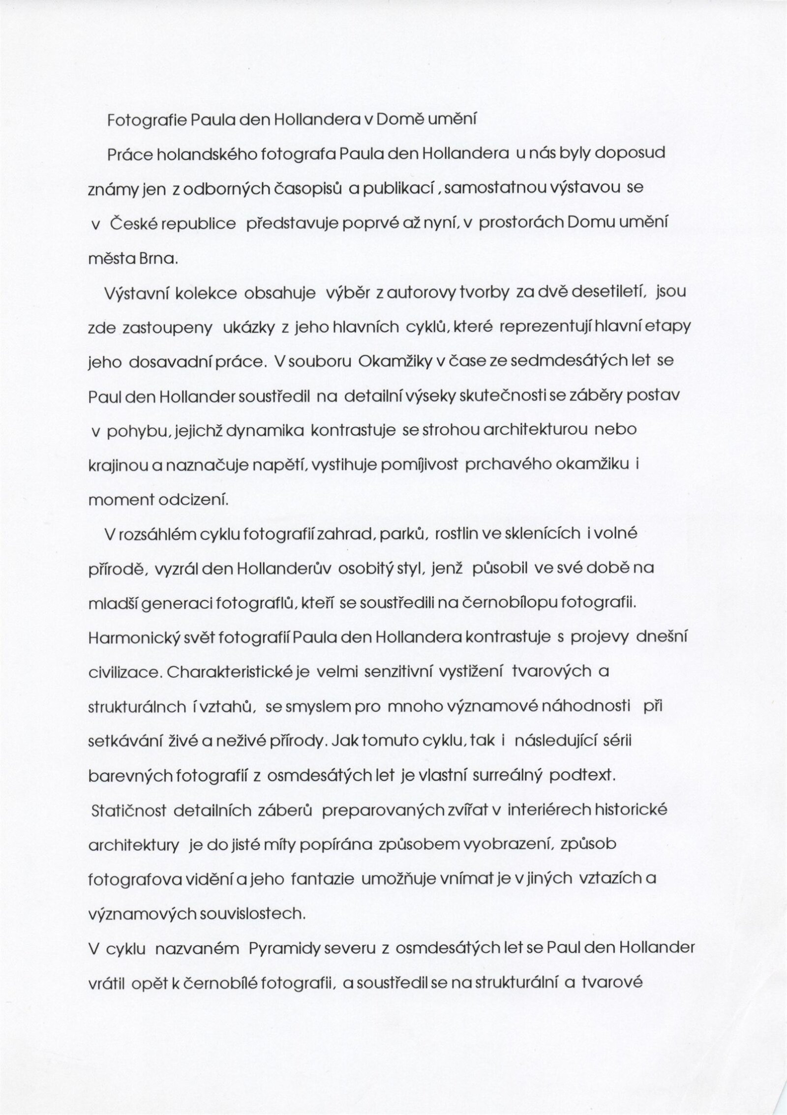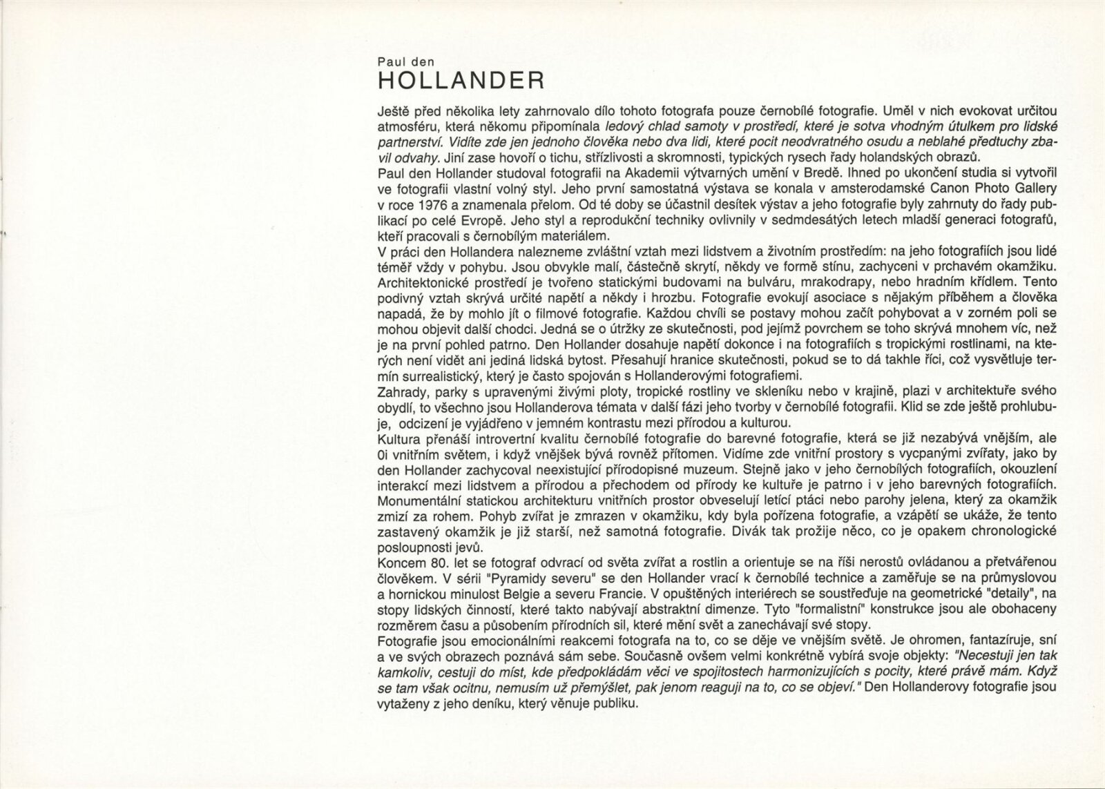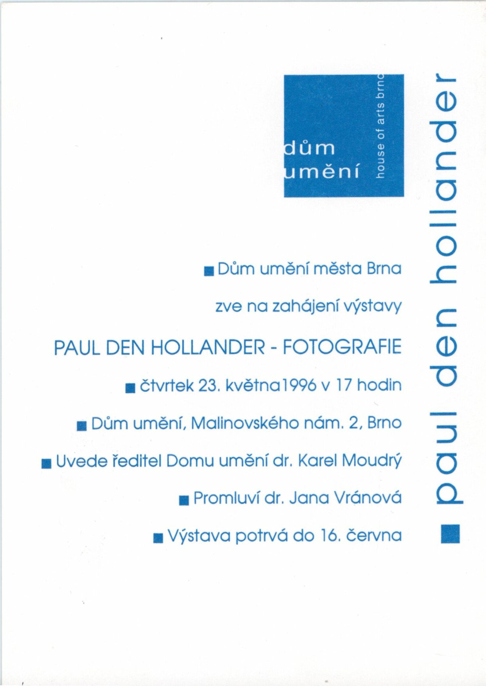 Paul den Hollander. Fotografie: Dům umění města Brna, hala, 23. 5. – 16. 6. 1996 / Text: anonymní. – Brno: DUmB, 1996. – [9] s., obr., životopis, DU 1025. – MZK; MG
