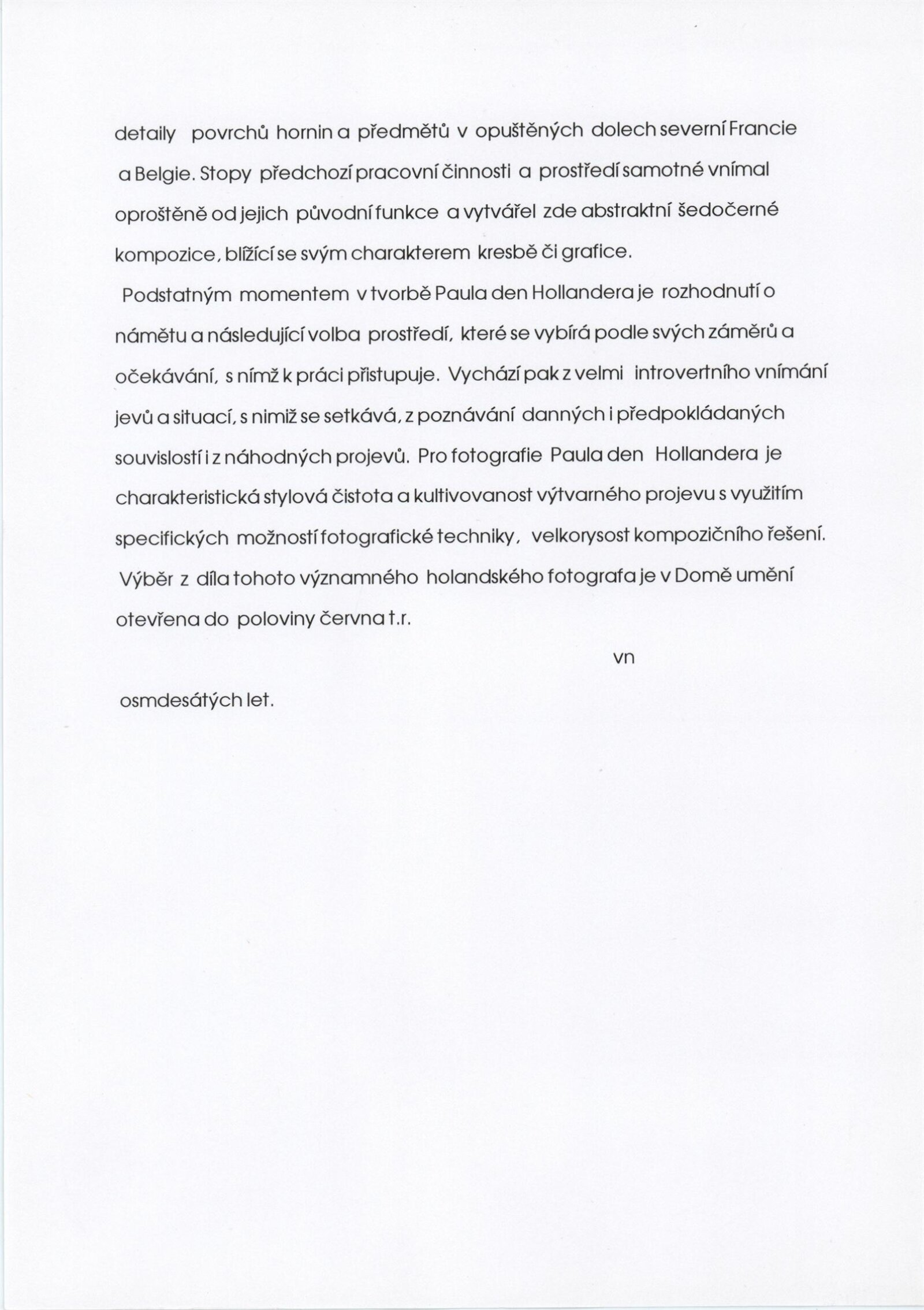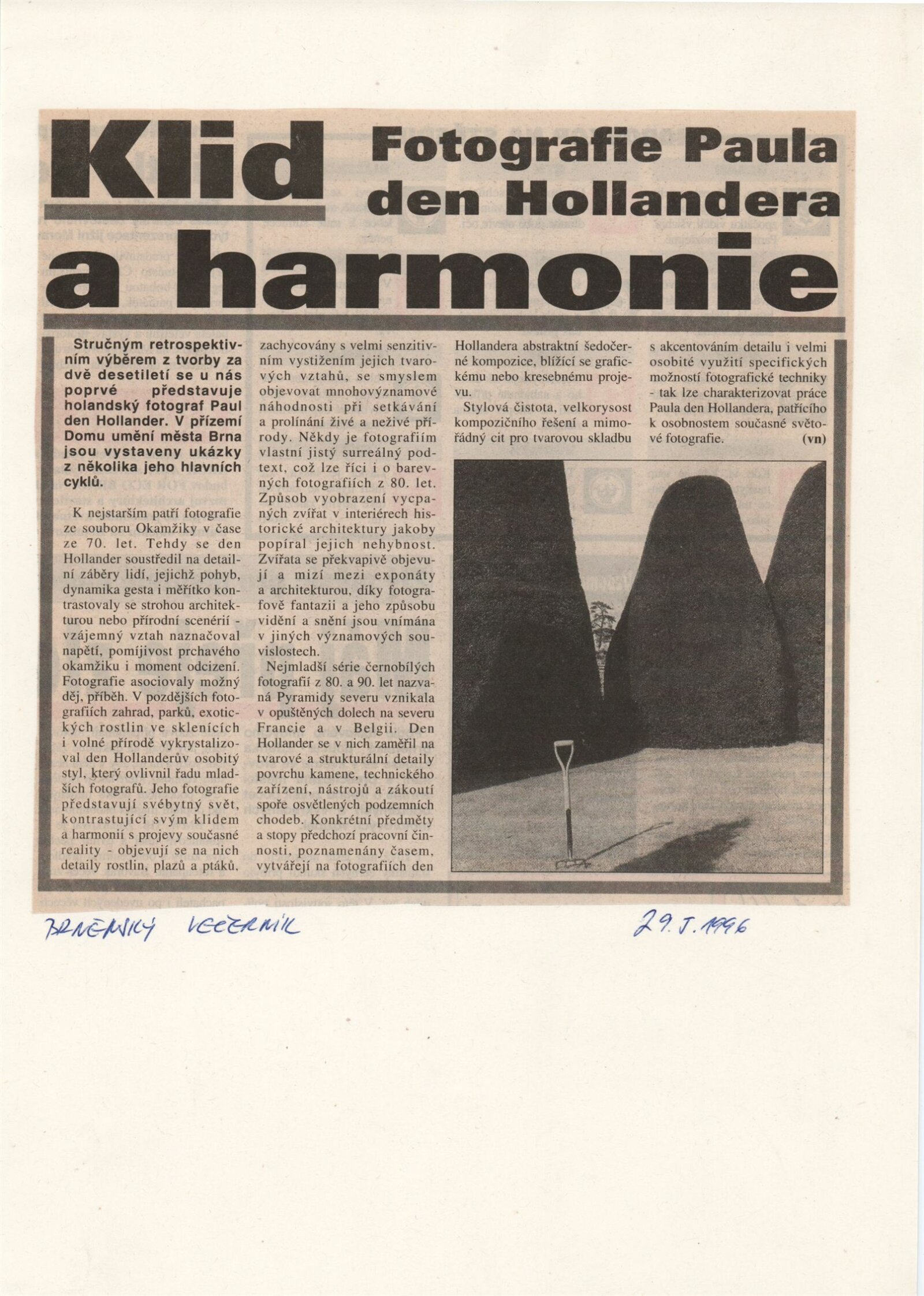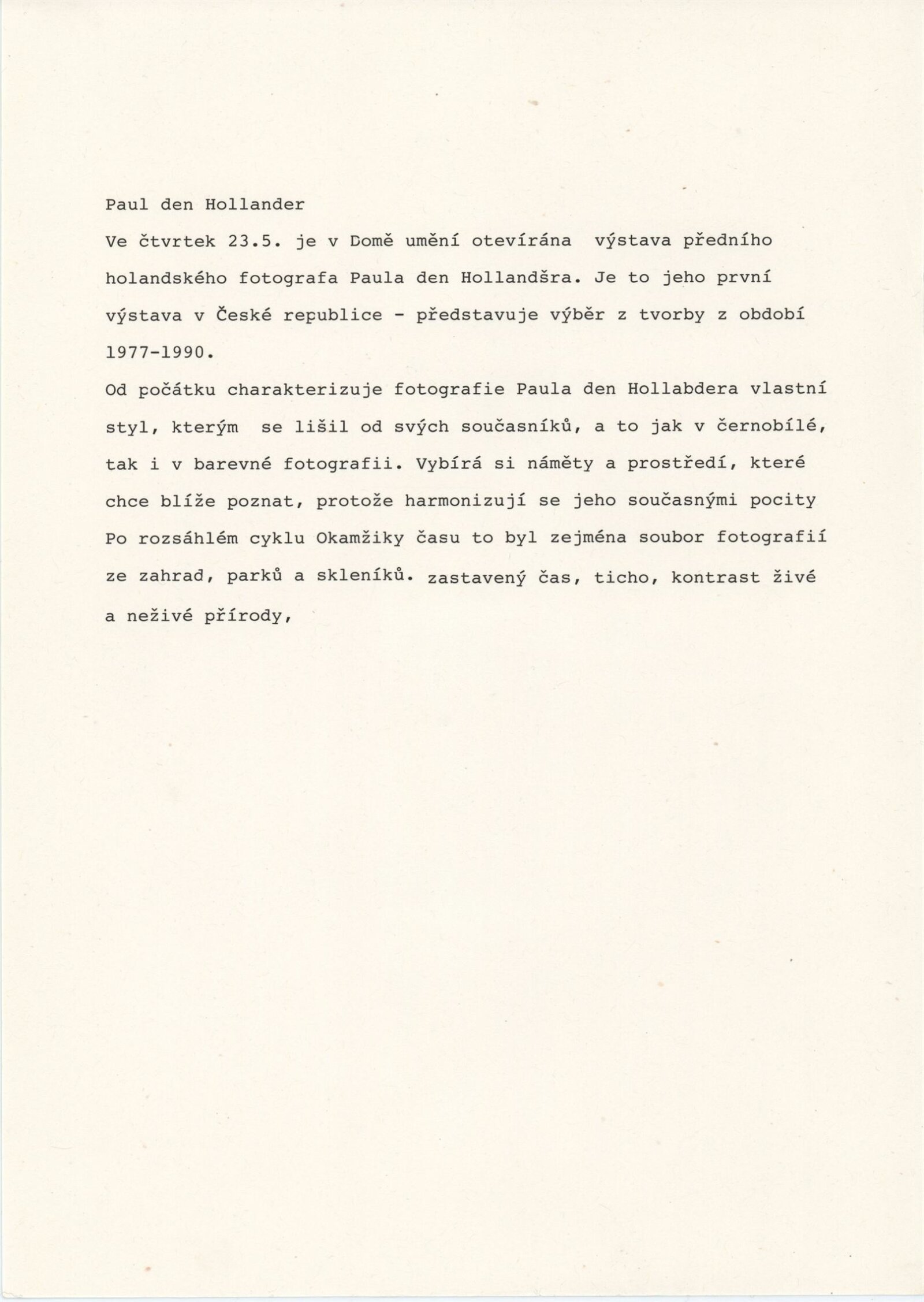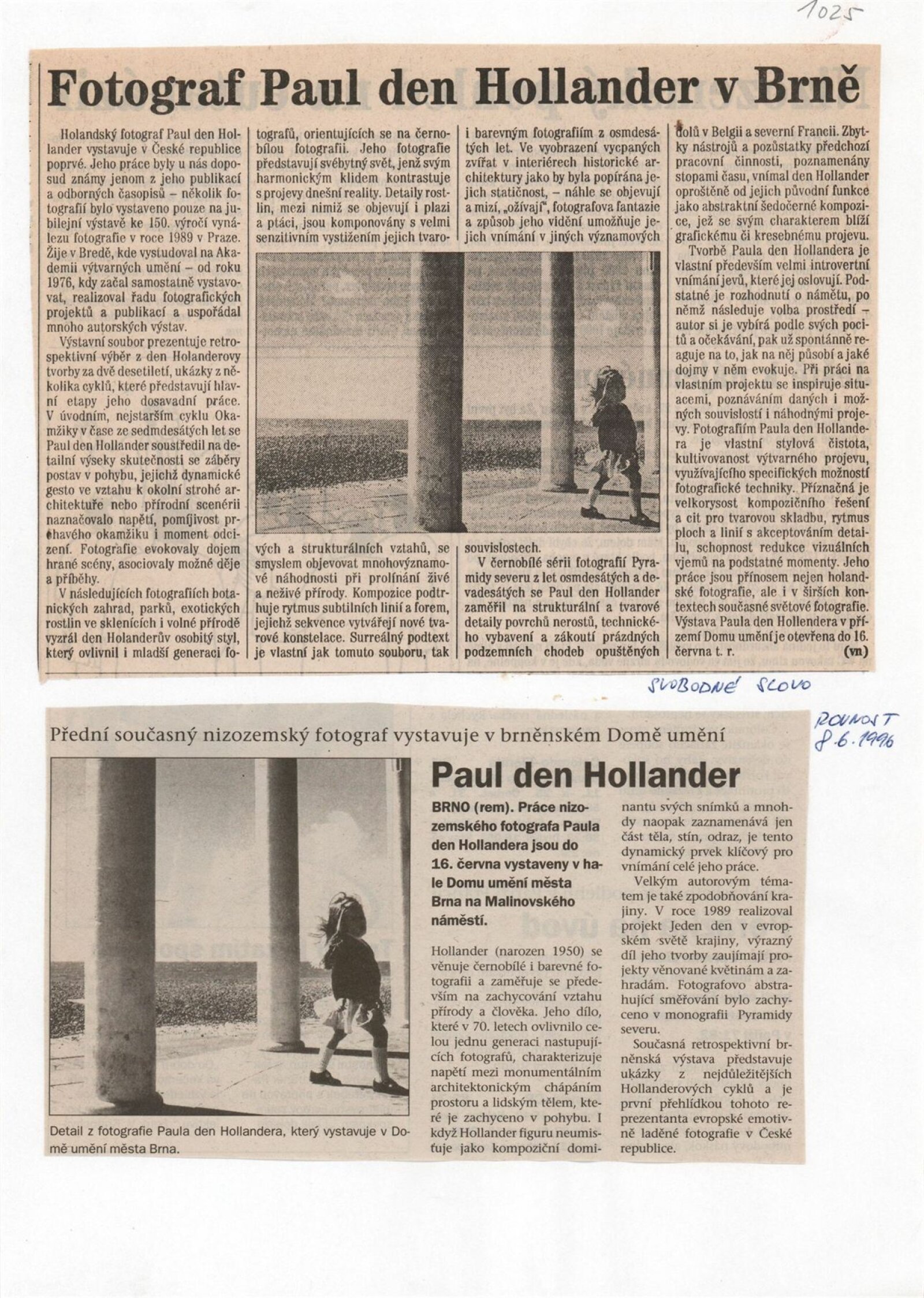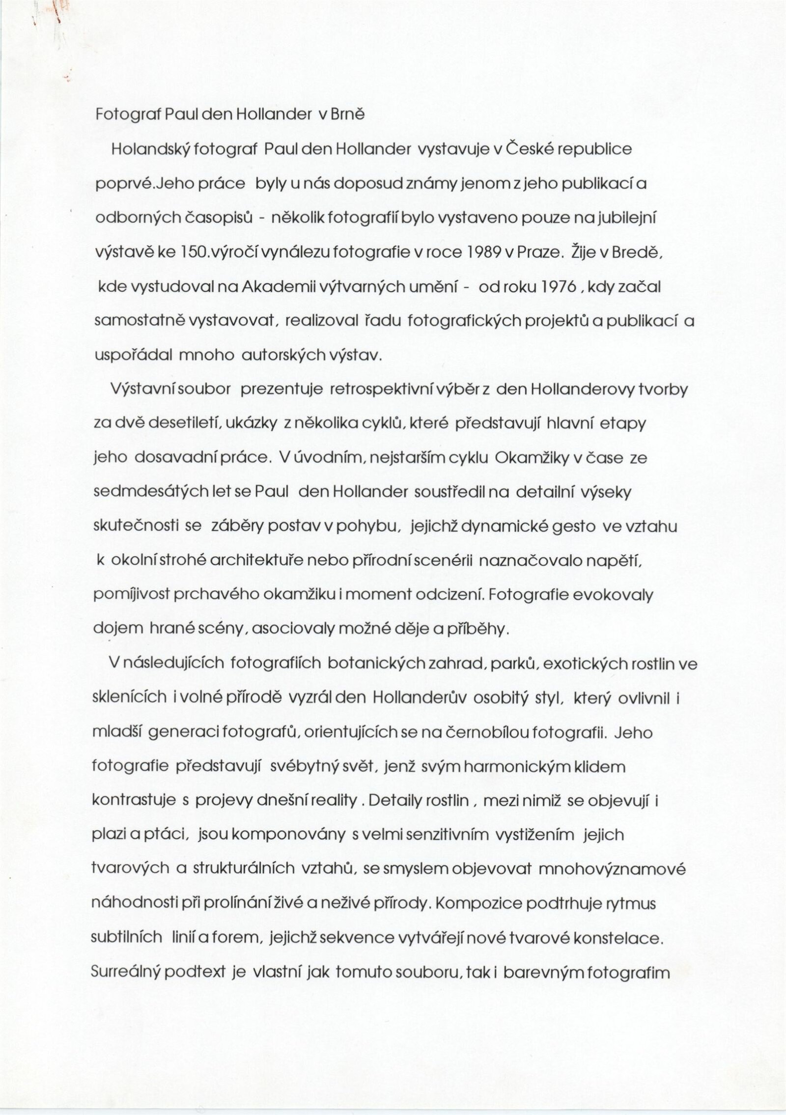 Paul den Hollander. Fotografie: Dům umění města Brna, hala, 23. 5. – 16. 6. 1996 / Text: anonymní. – Brno: DUmB, 1996. – [9] s., obr., životopis, DU 1025. – MZK; MG