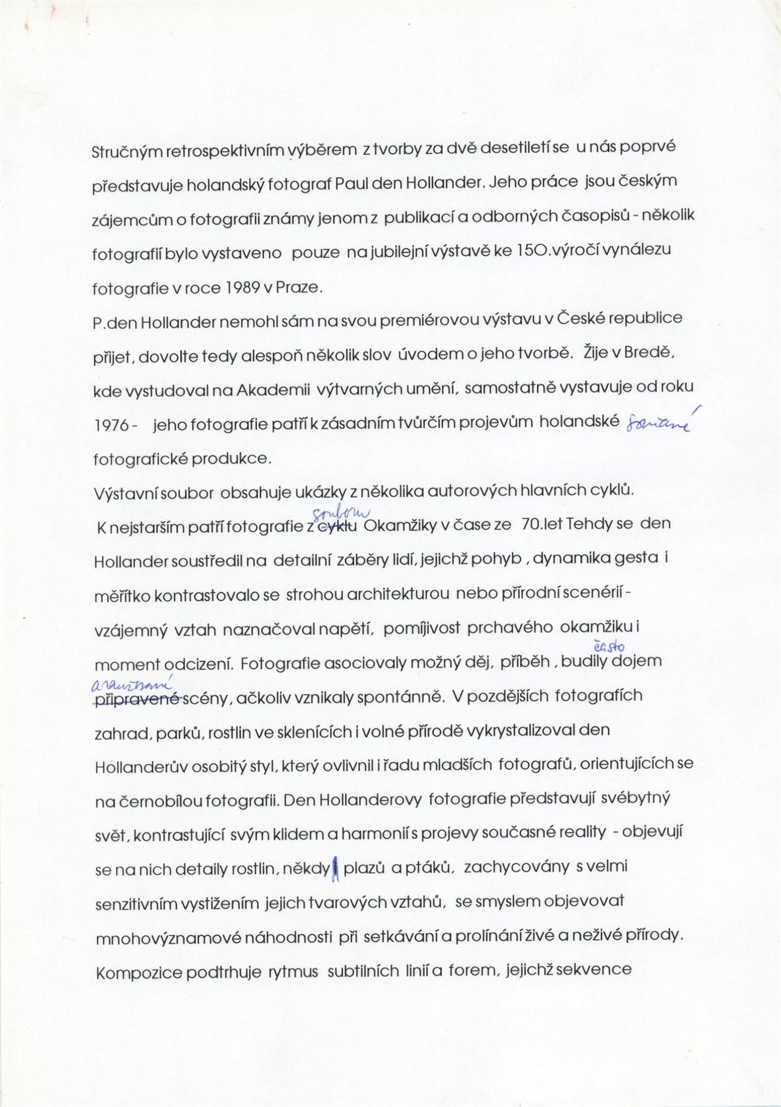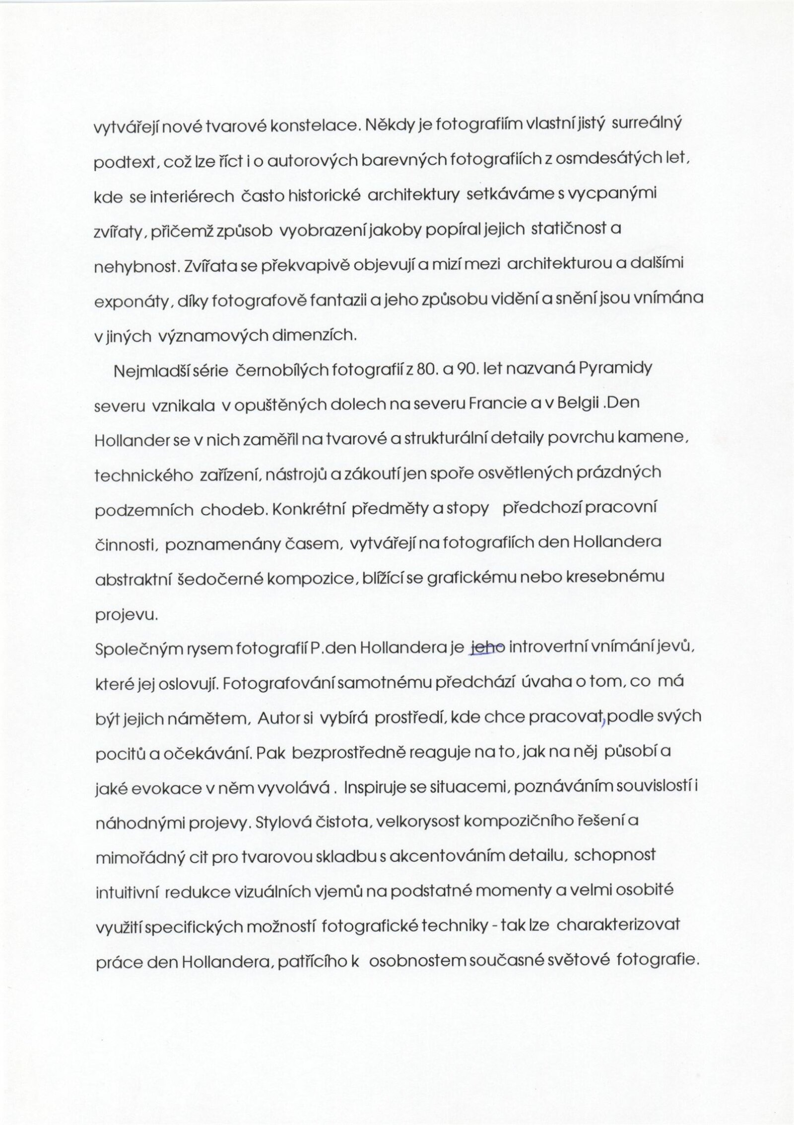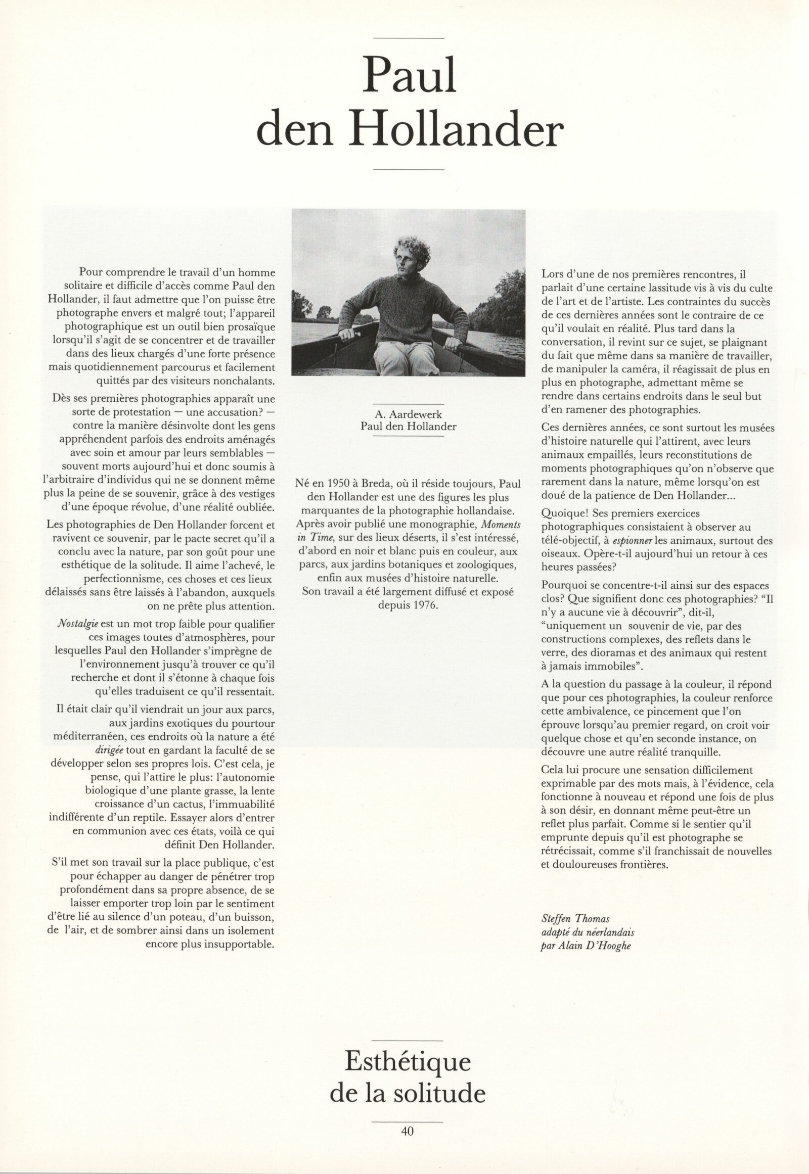 pozvánka, katalog, materiály pro katalog, text o autorovi (Vránová), fotografie instalace výstavy, osobní a provozní korespondence, podací lístky, periodikum Clichés (č. 54 - Steffen Thomas, Paul den Hollander. Esthétique de la solitude, s. 40-47)