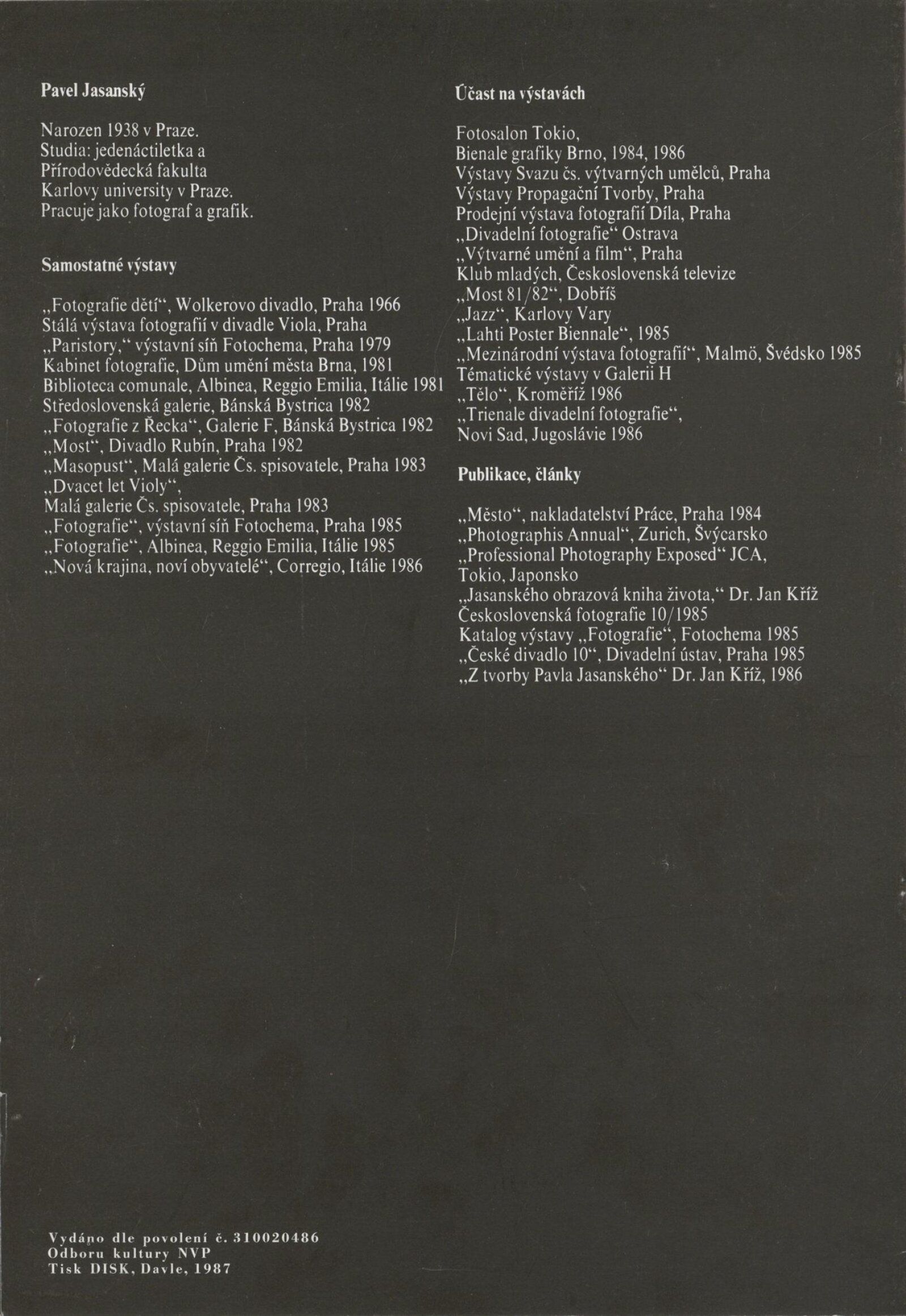 Pavel Jasanský. Nová krajina, noví obyvatelé. Davle, 1987. / Převzatý katalog. Pavel Jasanský. Těla. 1987–1990: Galerie 4, Cheb / Cheb: Galerie 4, 1991. – [18] s., obr., životní data, výstavy, GSR 101