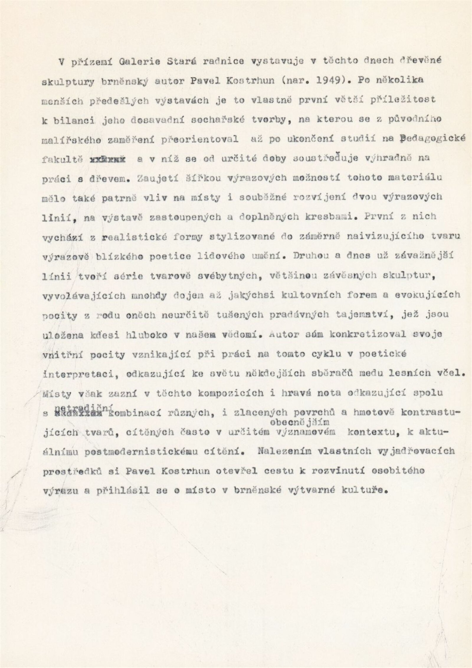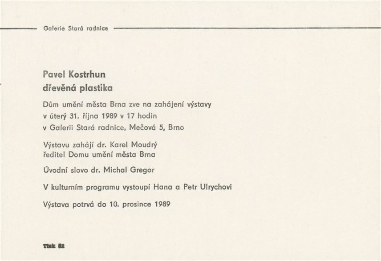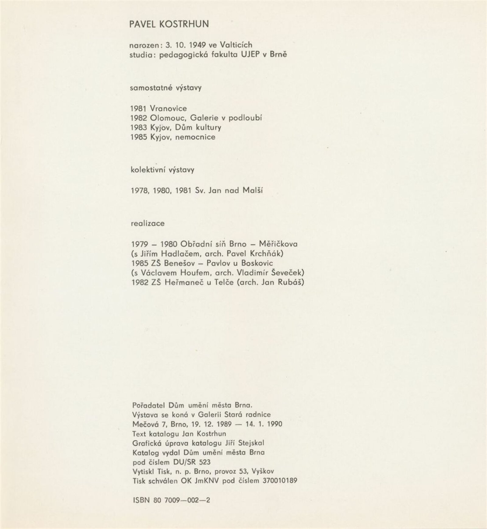 Pavel Kostrhun. Dřevěná plastika: Galerie Stará radnice, Kabinet architektury, 31. 10. – 3. 12. 1989 / Text: Jan Kostrhun. – Brno: DUmB, 1989. – [13] s., obr., životní data, výstavy, realizace, GSR 57. – MZK; MG; MMB