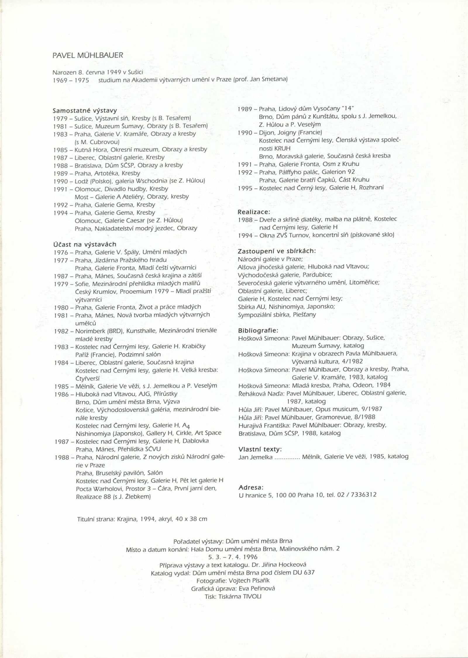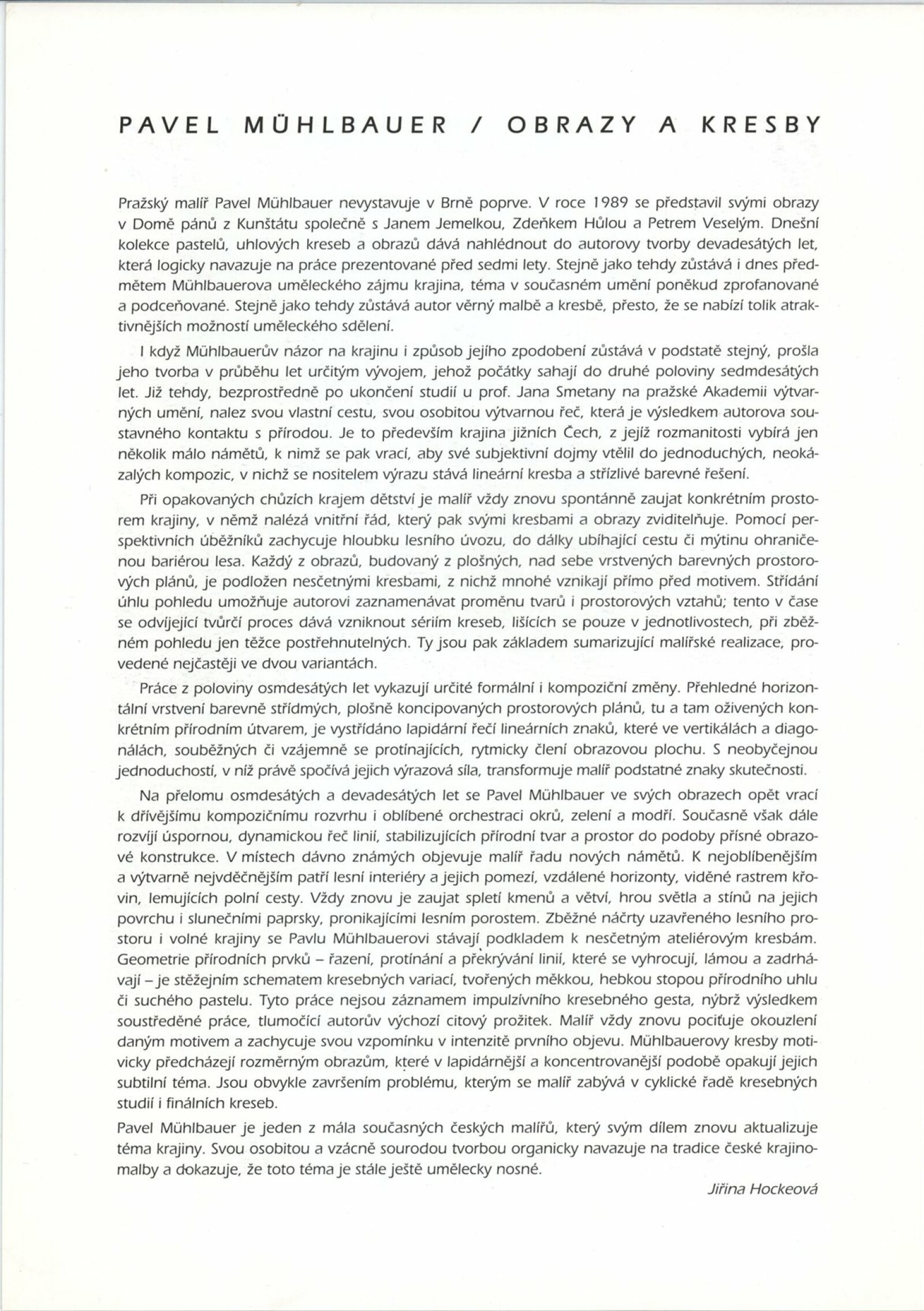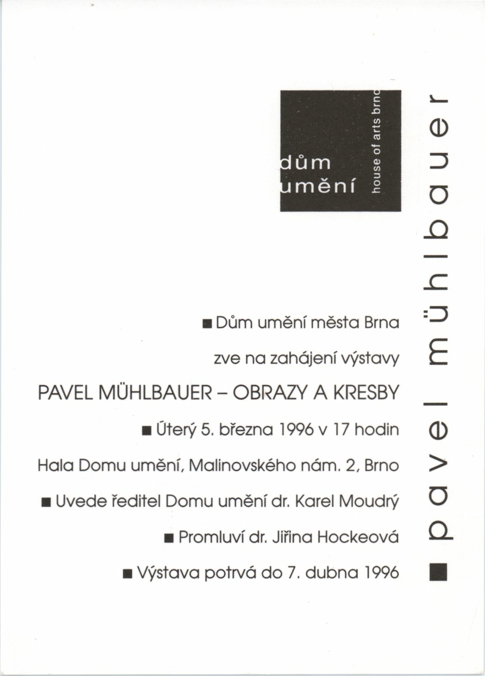 Pavel Mühlbauer. Obrazy a kresby: hala Domu umění města Brna 5. 3. – 7. 4. 1996 / Text Jiřina Hockeová. - Brno: DUmB, - 1 skládačka (6 s., obr.) Životní data, výstavy, realizace, zastoupení ve sbírkách, bibliografie DU 1018; MZK; MG