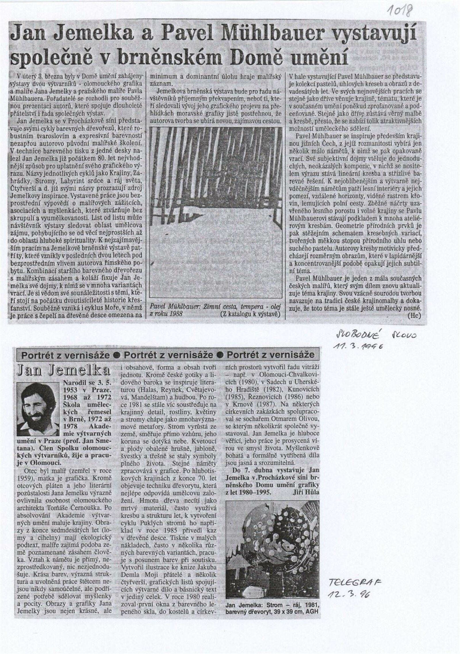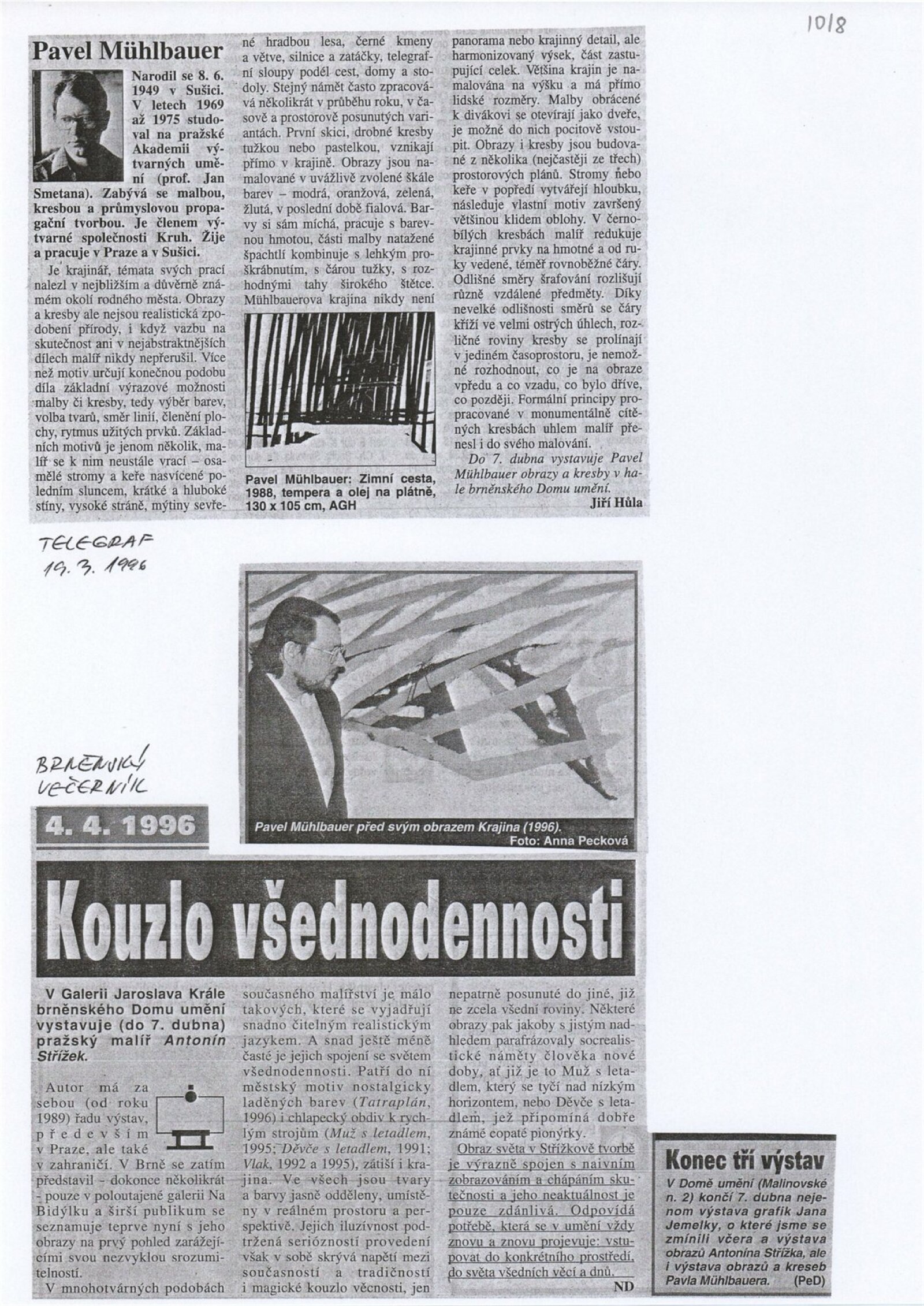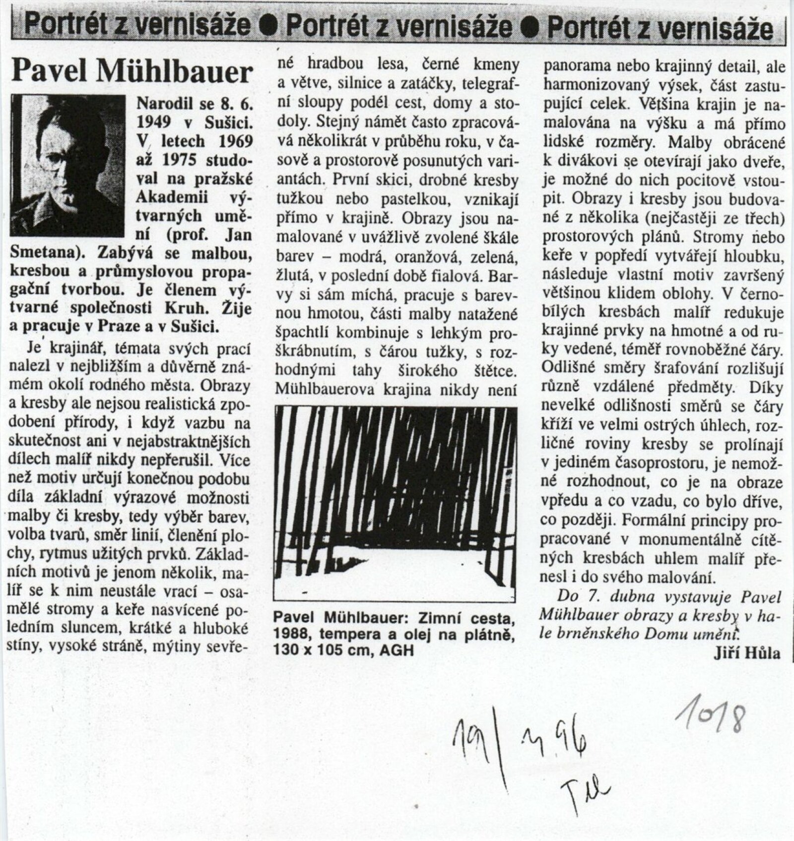 Pavel Mühlbauer. Obrazy a kresby: hala Domu umění města Brna 5. 3. – 7. 4. 1996 / Text Jiřina Hockeová. - Brno: DUmB, - 1 skládačka (6 s., obr.) Životní data, výstavy, realizace, zastoupení ve sbírkách, bibliografie DU 1018; MZK; MG