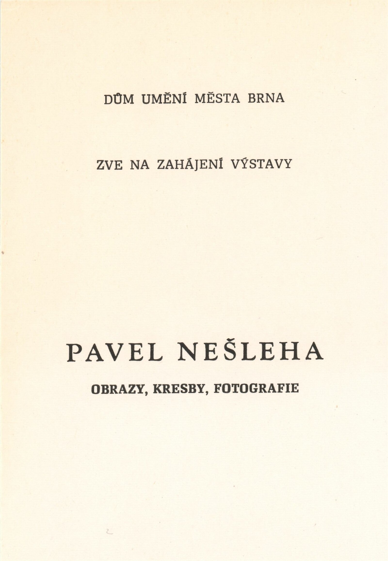 Pavel Nešleha. Obrazy, kresby, fotografie: Dům umění / Dům pánů z Kunštátu, 25. 2. – 31. 3. 1986 / Text: Jiří Valoch. – Brno: DUmB, 1986. – [24] s., obr., životní data, výstavy, realizace, ceny, zastoupení ve sbírkách, DPK 866. – MZK; MG; MMB