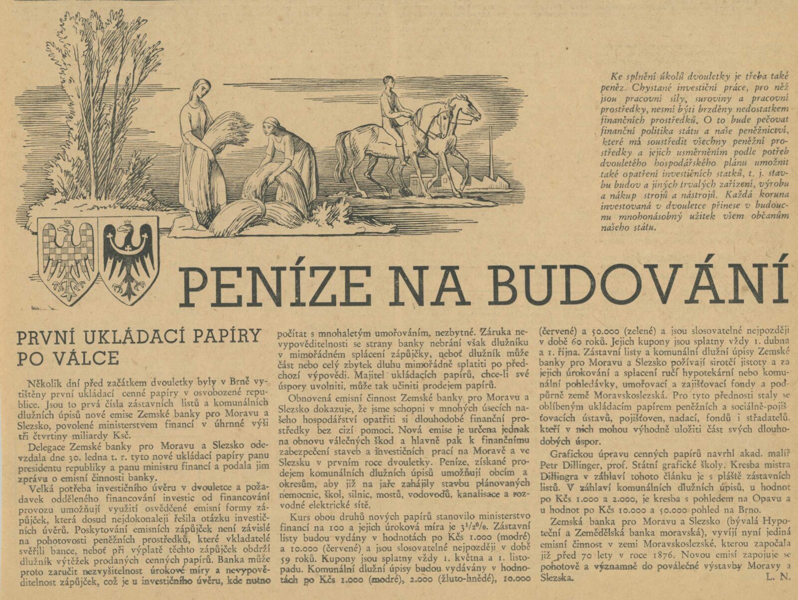 Peníze na budování. Návrhy dluhopisů a jiných cenných papírů Zemské banky: Dům umění, Síň Jaroslava Krále, 21. 2. – 9. 3. 1947 / Brno: Zemská banka pro Moravu a Slezsko, 1947. – 4 s., DU 36