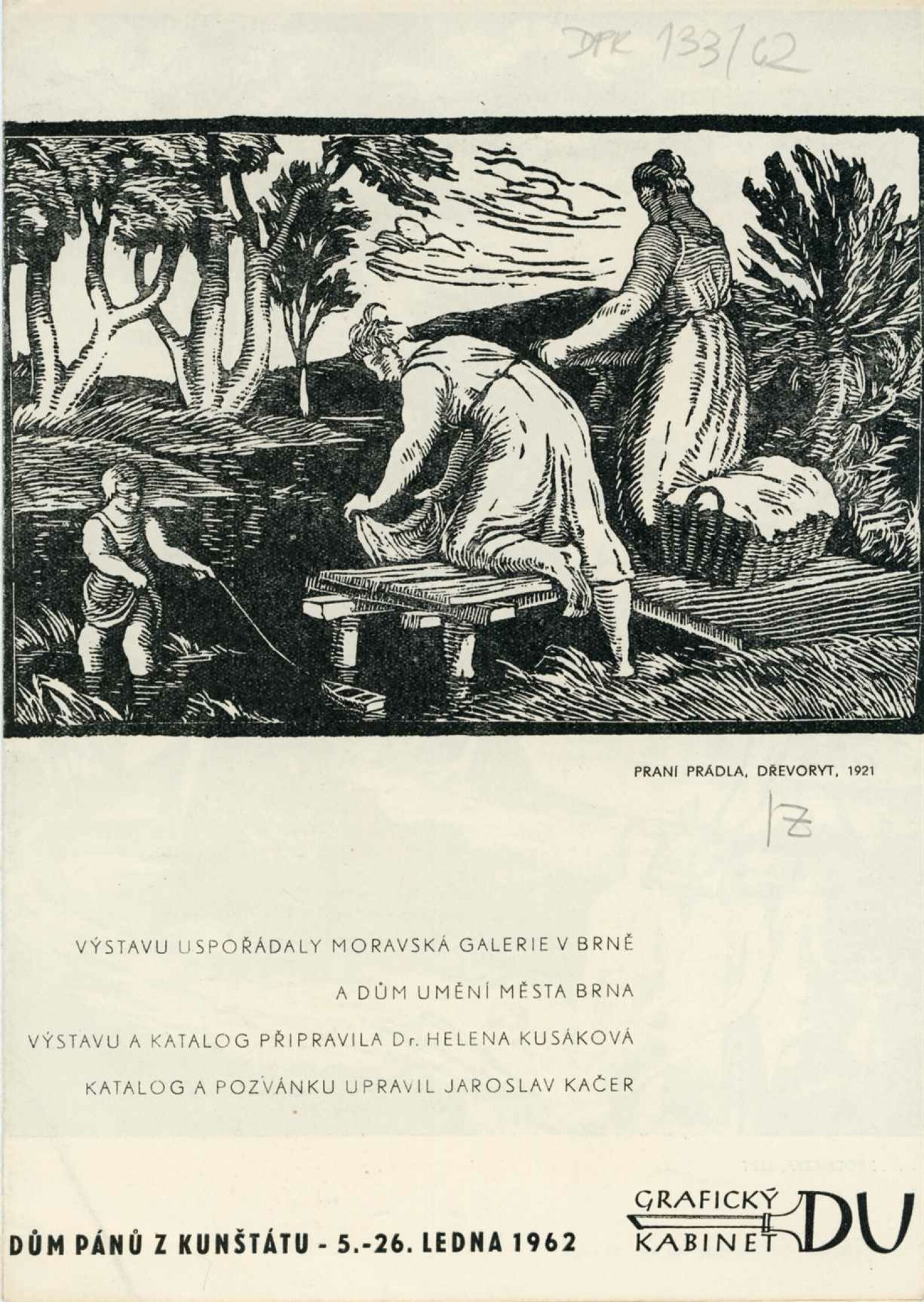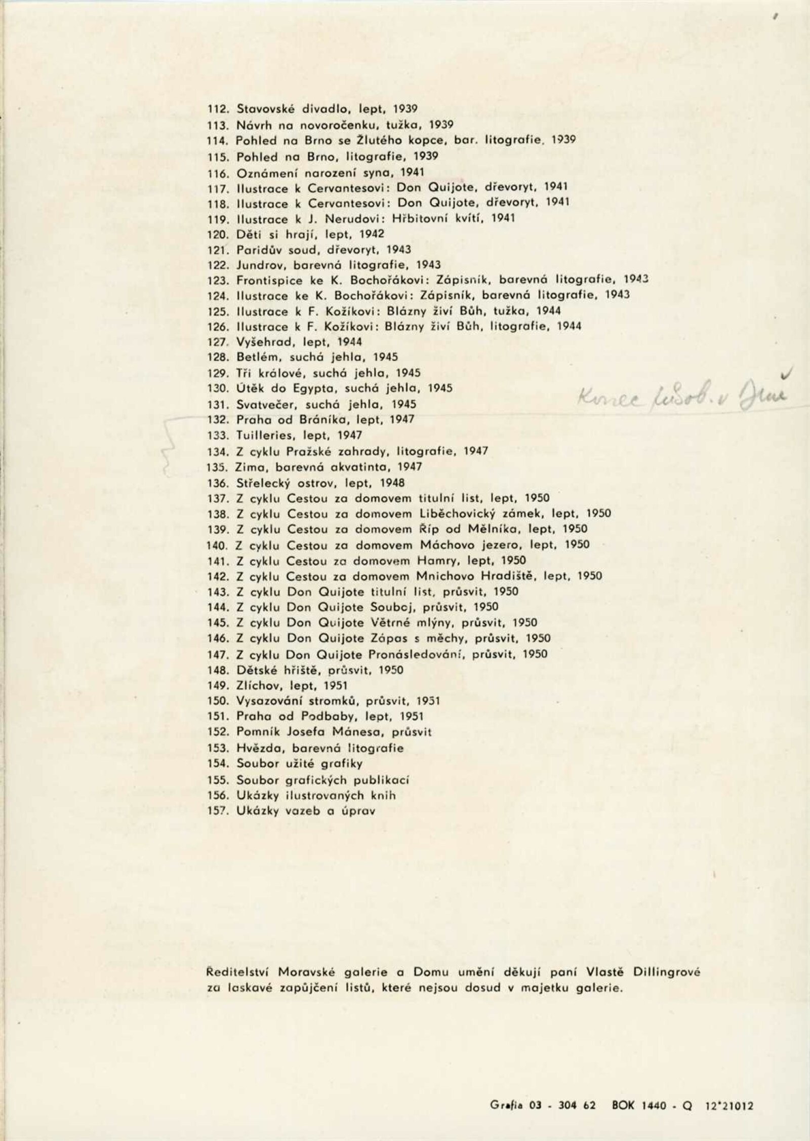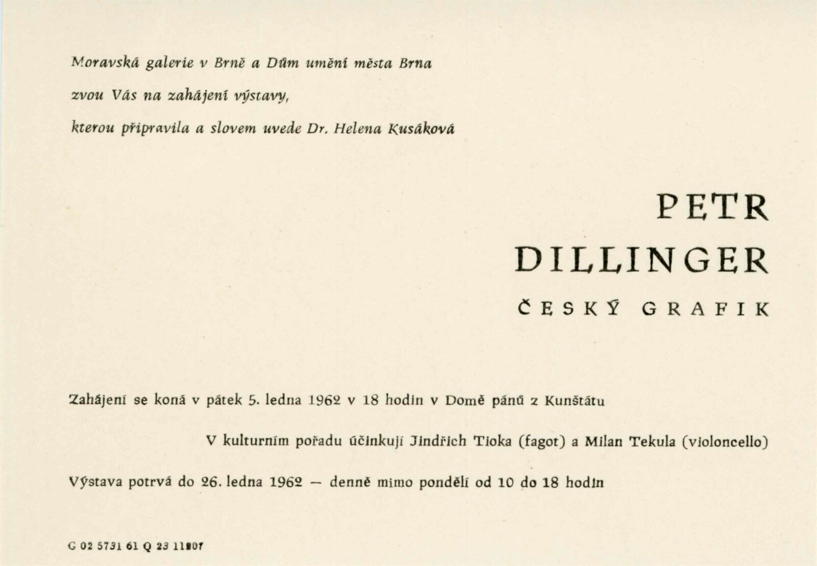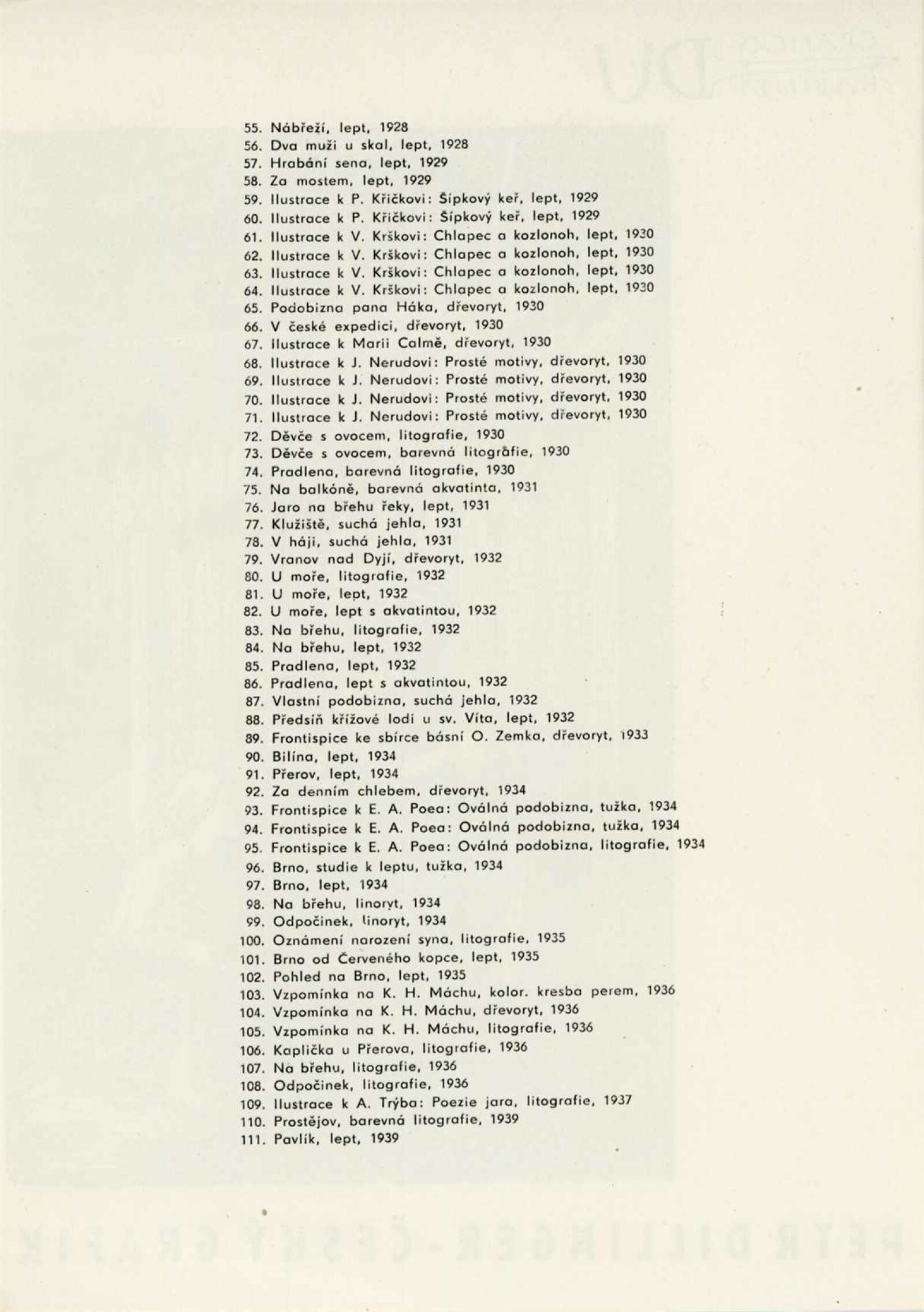 Petr Dillinger. Český grafik: Dům umění města Brna / Dům pánů z Kunštátu, 29. výstava Kabinetu grafiky, 5. 1. – 26. 1. 1962 / Text: Helena Kusáková. – Brno: DUmB, 1962. – skládačka, 8 s., obr., DPK 133. – MG; MMB