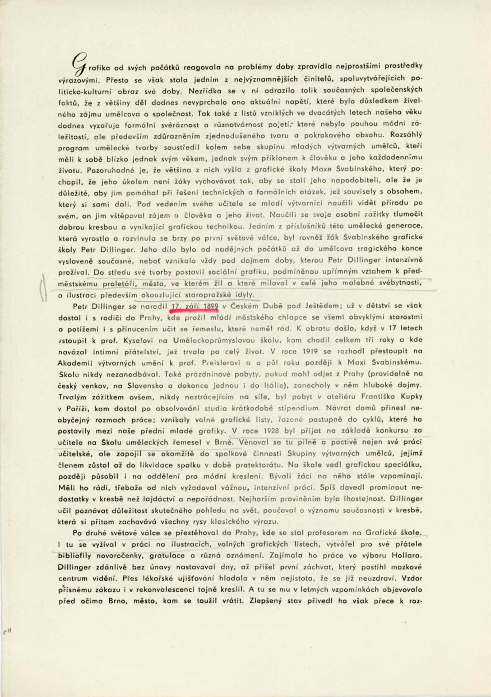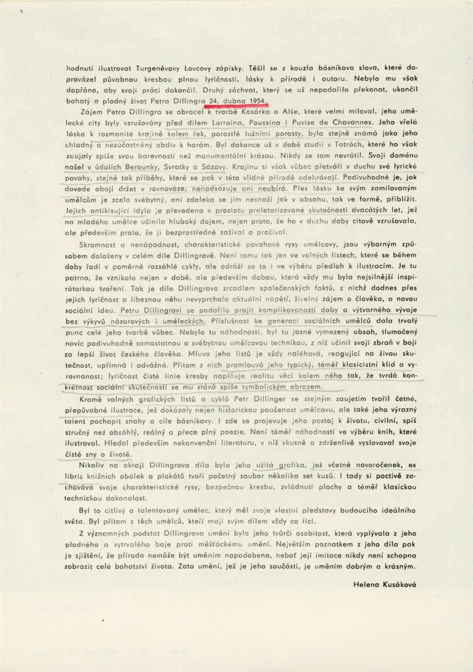 pozvánka, katalog, karta k výstavě, korespondence (Helena Kusáková, pí Dillingerová), recenze v tisku, katalog výstavy (Petra Dillingera v Kabinetu umění – text Jaroslav B. Svrček)