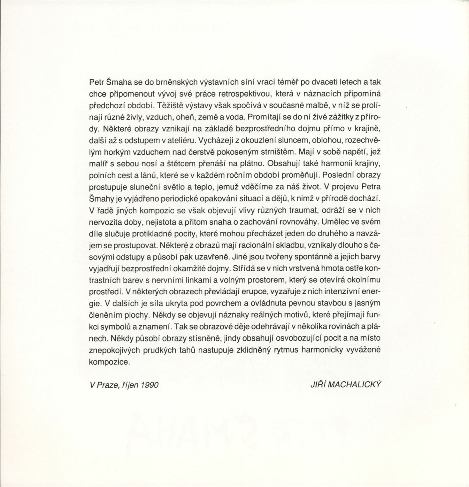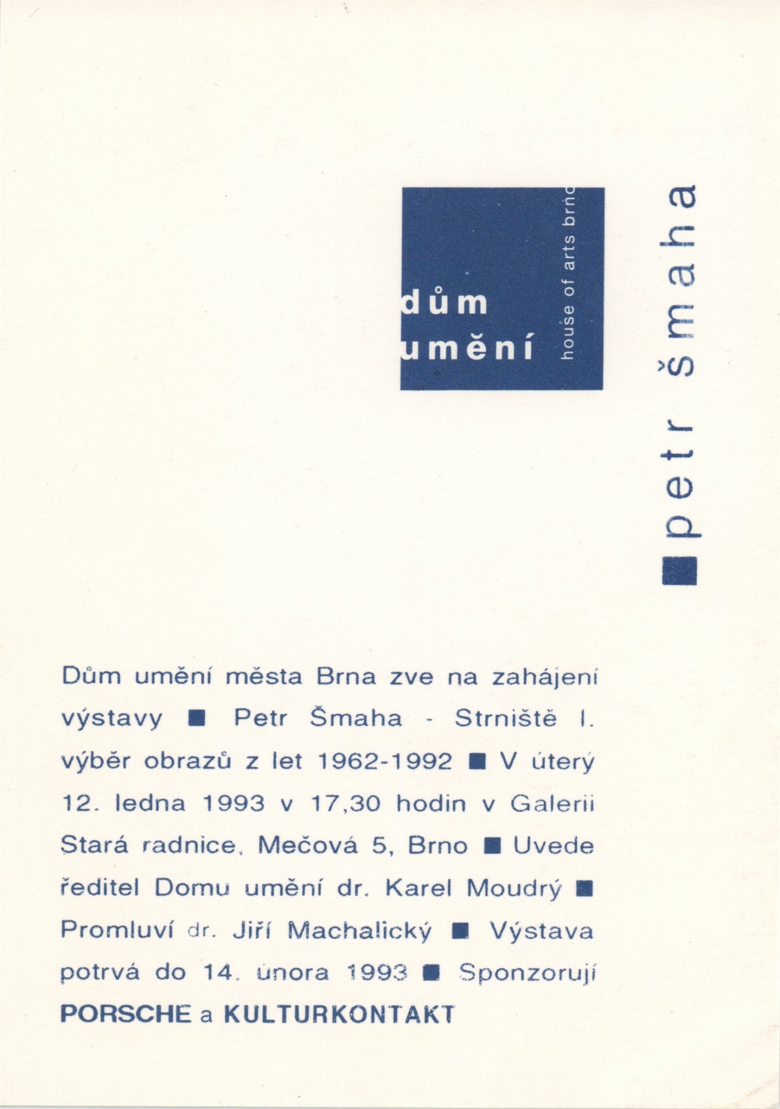Petr Šmaha. Obrazy: Galerie Stará radnice 12. 1. – 14. 2. 1993 / Texty Jiří Machalický, autor. - Brno: DUmB, - 1 skládačka (6 s., obr.) + Obrazy "Strniště I." [1] s. Životní data, výstavy GSR 138; MZK; MG