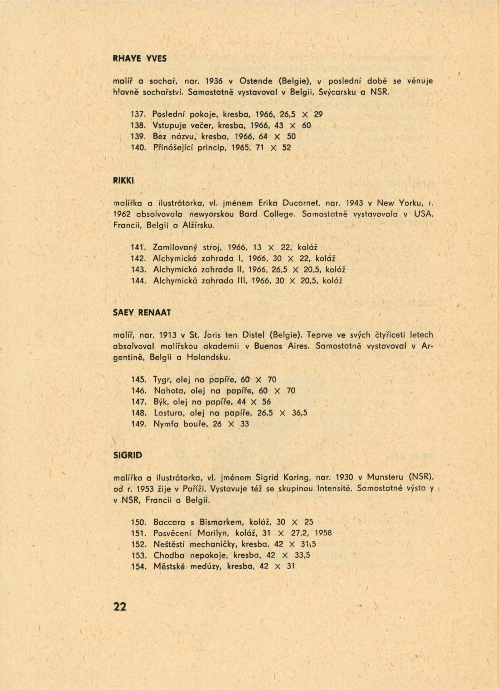 Jac Boonen, Max Bucaille, Ithel Colquhoun, Richard Dandoy, Georgette de Groote-Tanghe, Victor Delhez, Marijan Dentoni, Diana, Guy Ducornet, Albert Dupuis, Jean-Jacques Gailliard, Robert Geenens, Elisabeth Geurden, Piero Gnesi, Carlo Guarnieri, Rudolf Haus, Jacqueline Hondermarcq, Luigi Johannis, Alexis Keunen, Helmut Leherb, Milvia Maglione, Jean Martin-Bontoux, Robert Navez, Aubin Pasque, Robert Perniaux, Helmut Plontke, Jeanne Portenart, Caspar Walter Rauh, Reva Rémy, Yves Rhaye, Rikki, Renaat Saey, Sigrid, Armand Simon, Willy Smitz, Clizia Viola, Marian Wenzel, Napoleone Moltrasio, Michele Pavel