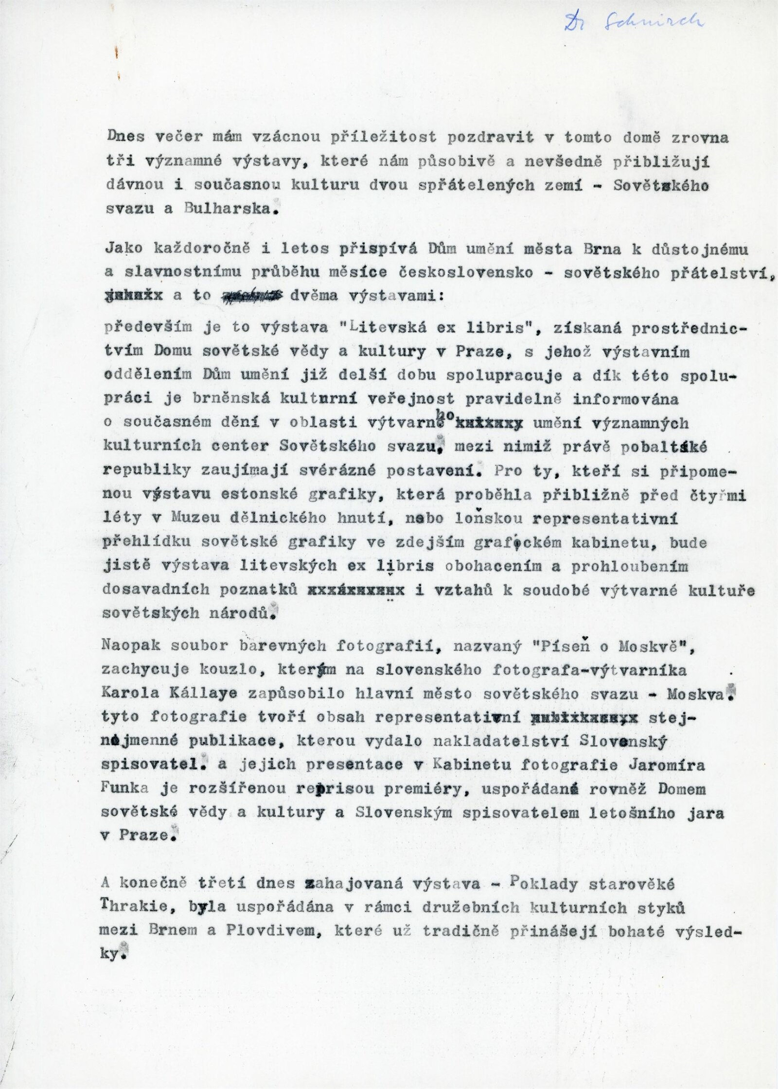 pozvánka, katalog (AJ, FJ, RJ), fotografie instalace výstavy, strojopis úvodního slova k výstavě (Milan Schnirch), rukopis textu o výstavě, dopisy (OK NVmB / R. Tálský), provozní korespondence, návrh programu bulharské kulturní delegace, výstavní smlouva, žádost o povolení výstavy, recenze v tisku, turistický leták Bulharsko