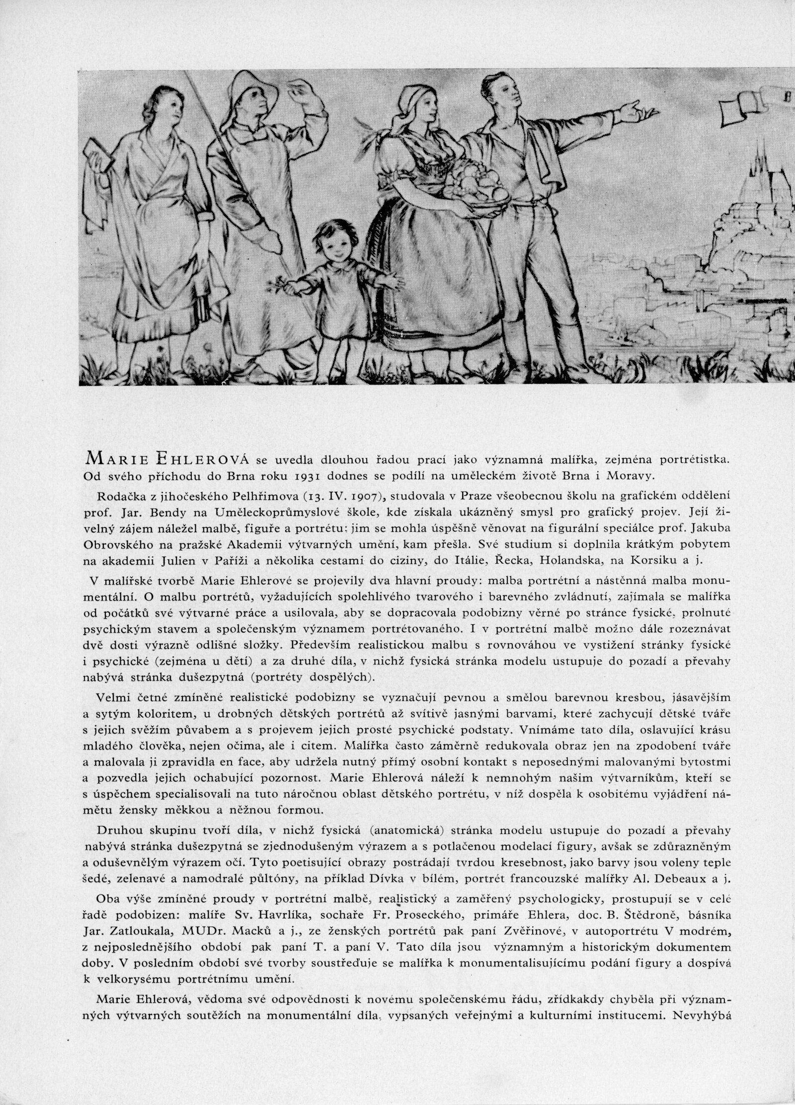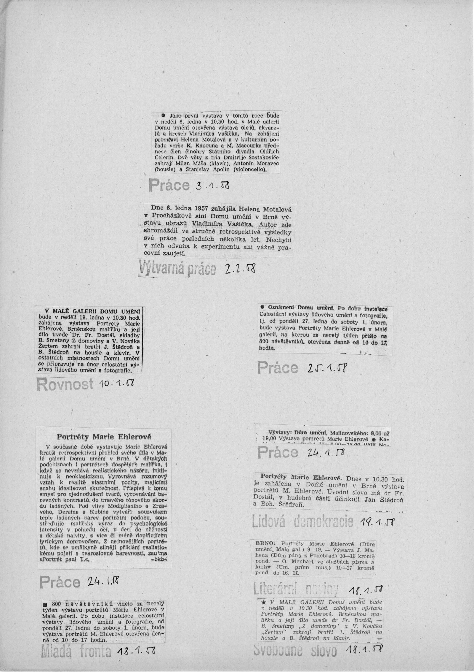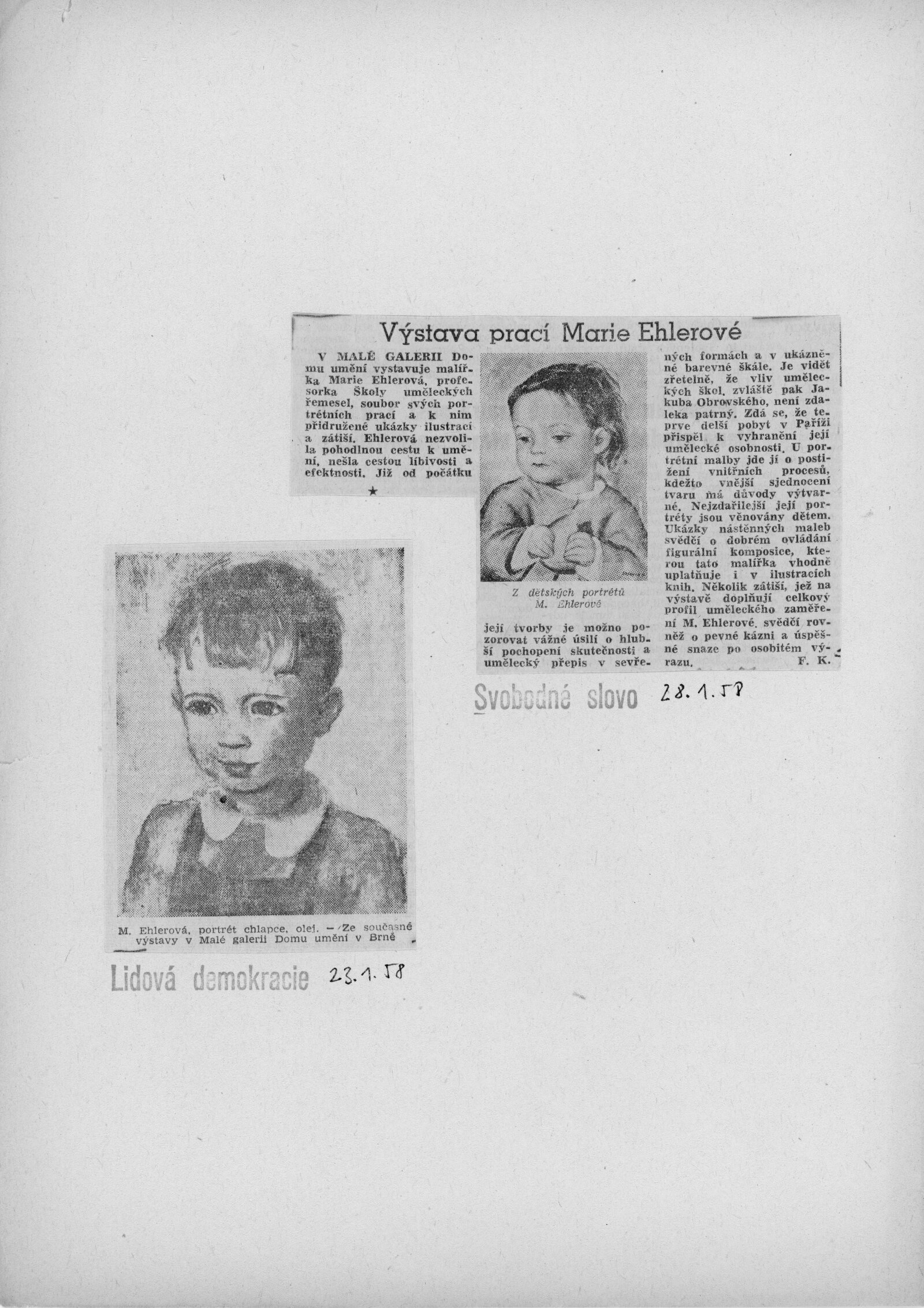 Portréty Marie Ehlerové: Dům umění, 19. 1. – 13. 2. 1958 / Text: František Dostál. – Brno: DUmB, 1958. – 4 s., obr., DU 303. – MZK; MG; MMB