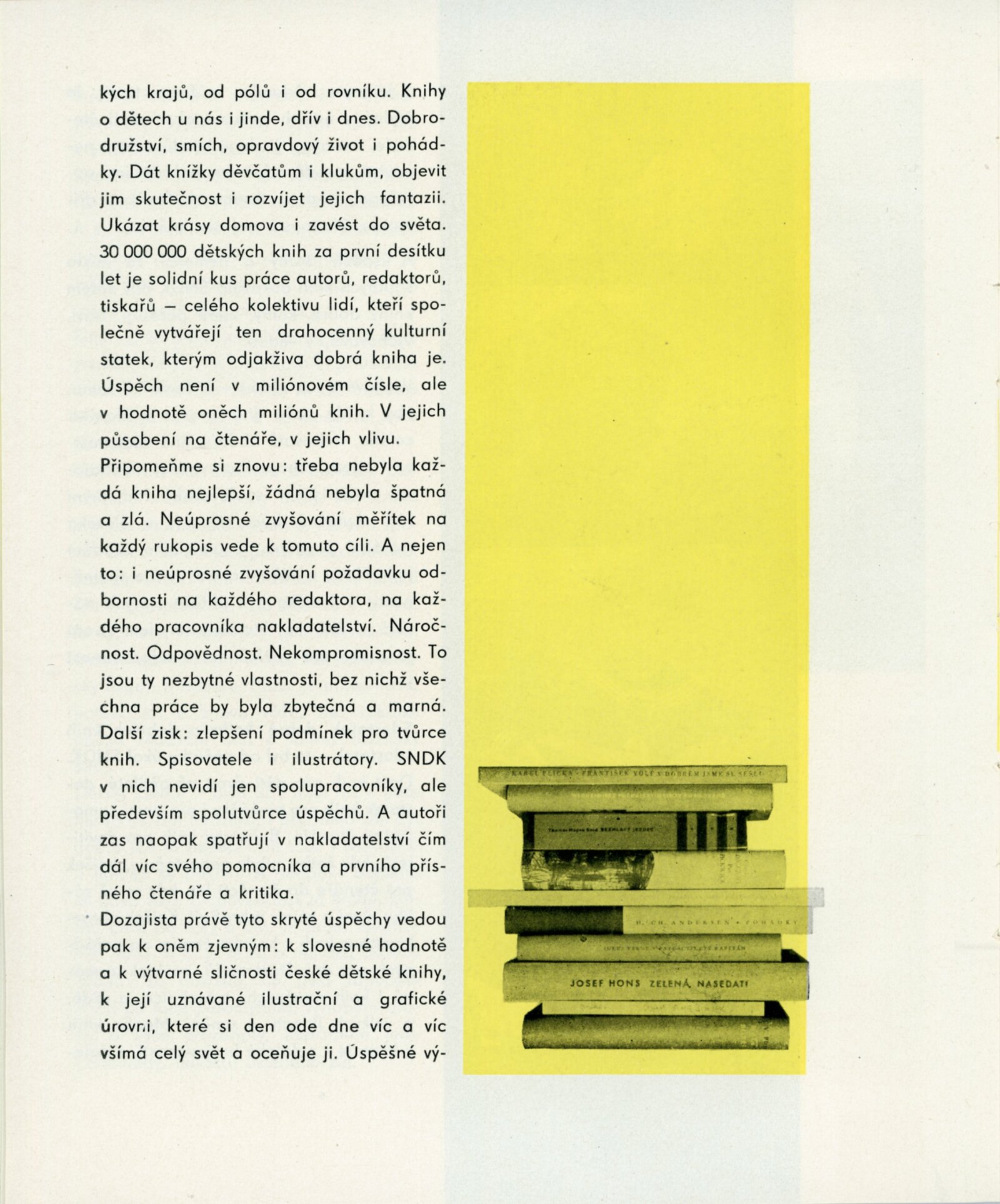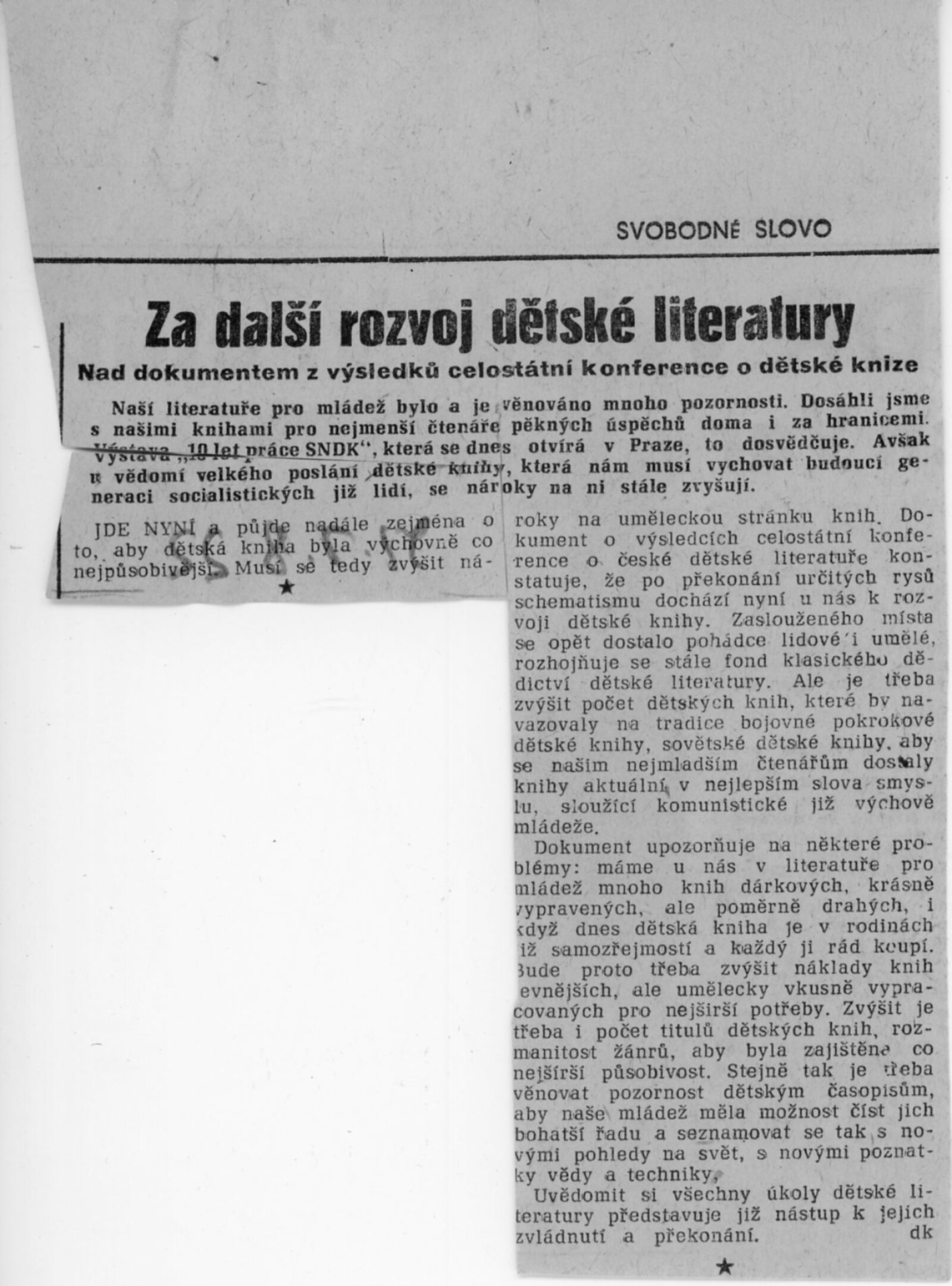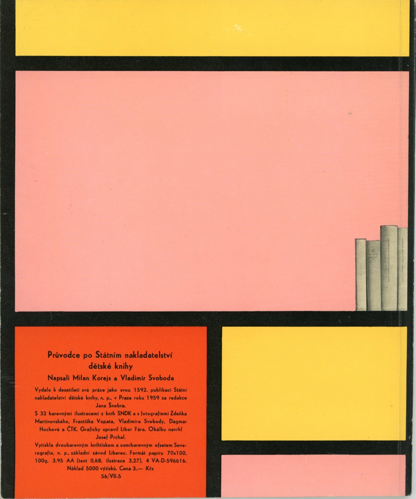 Přehlídka desetileté práce SNDK. Trnkovy loutky: Dům umění města Brna, 18. 10. – 22. 11. 1959. / K výstavě vydány příležitostné publikace. – DU 347–350: Milan Korejs – Vladimír Svoboda, Průvodce po Státním nakladatelství dětské knihy, Praha: SNDK, np., 1959. – 56 s., obr. Zamyšlení a sen nad dětskou knihou. K 10. výročí založení Státního nakladatelství dětské knihy. – Praha: SNDK, 1959. – 4 s., báseň Jan Noha