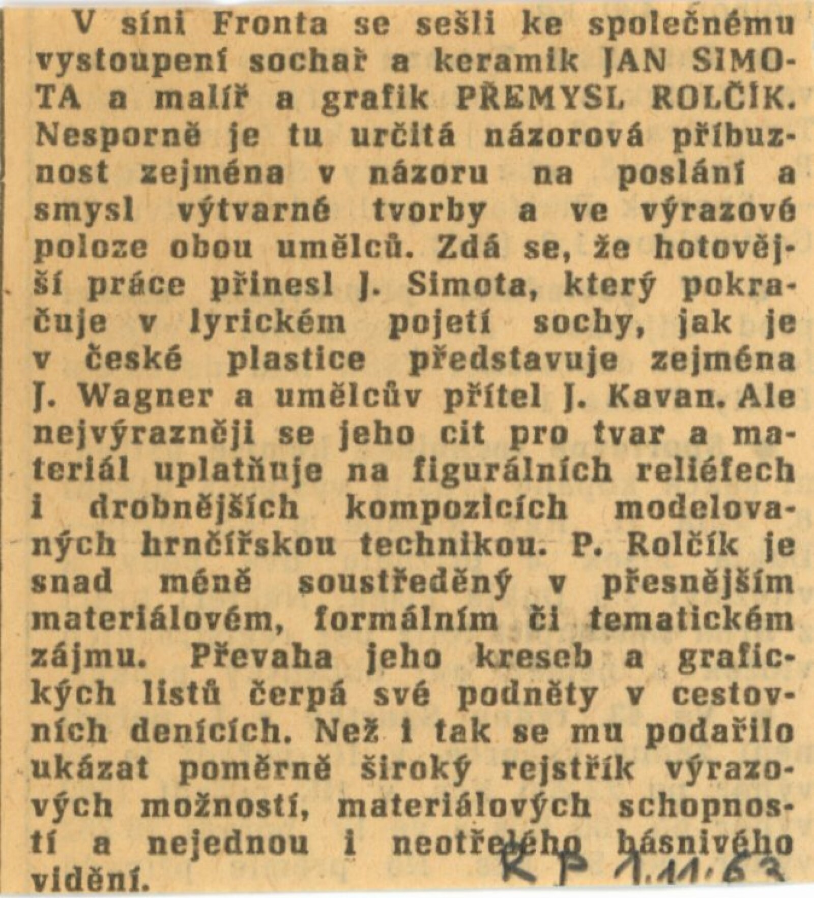 společná pozvánka DPK 213–215, katalog, strojopis textu pro katalog, návrh katalogu, fotografie děl, korespondence (Přemysl Rolčík), recenze v tisku, katalog – společná výstava s J. Simotou (Praha, 1963)