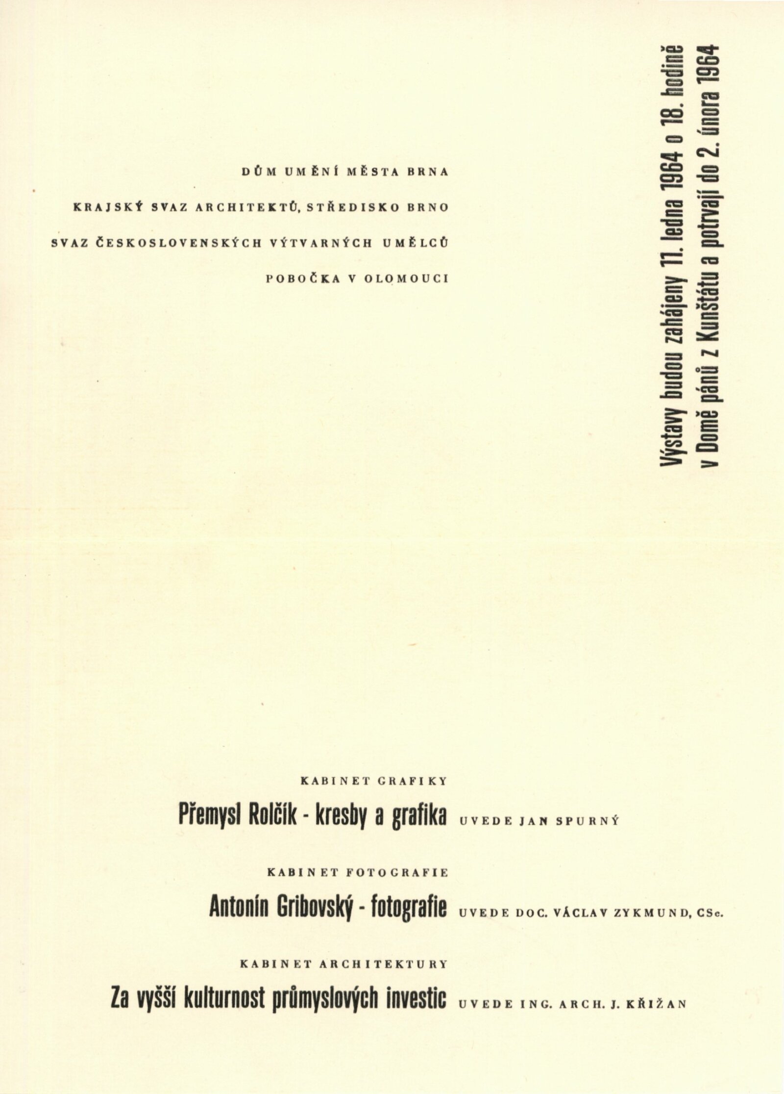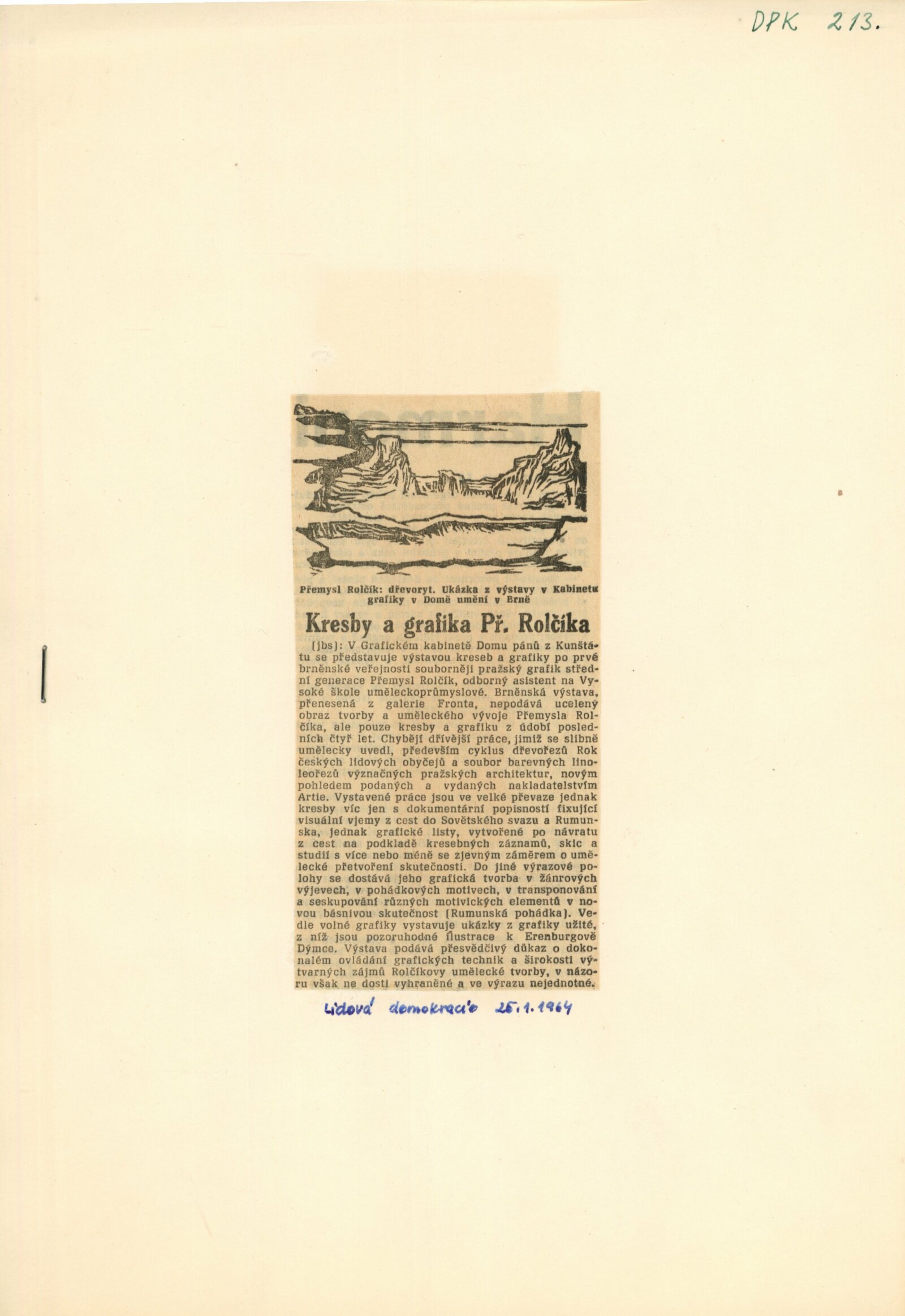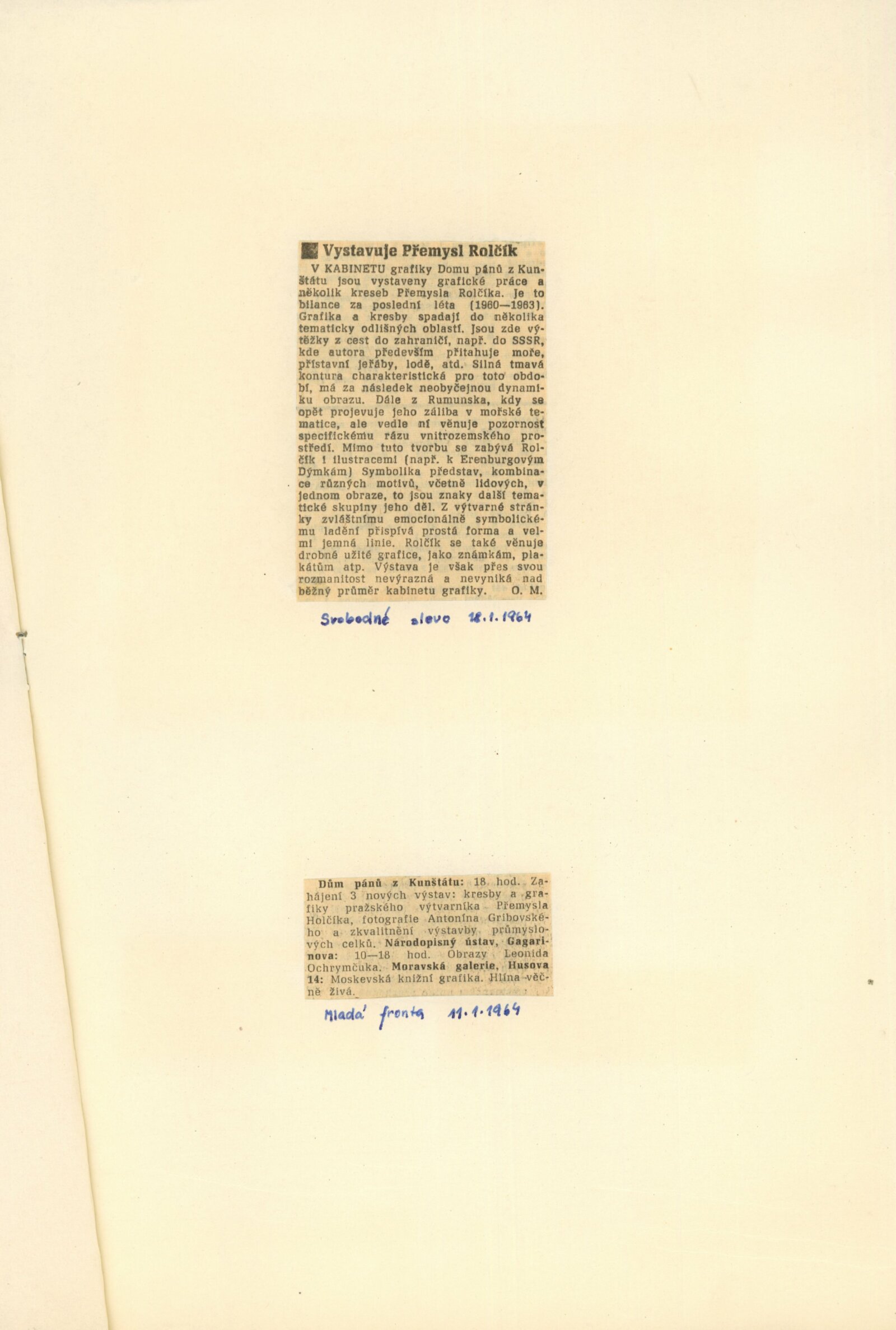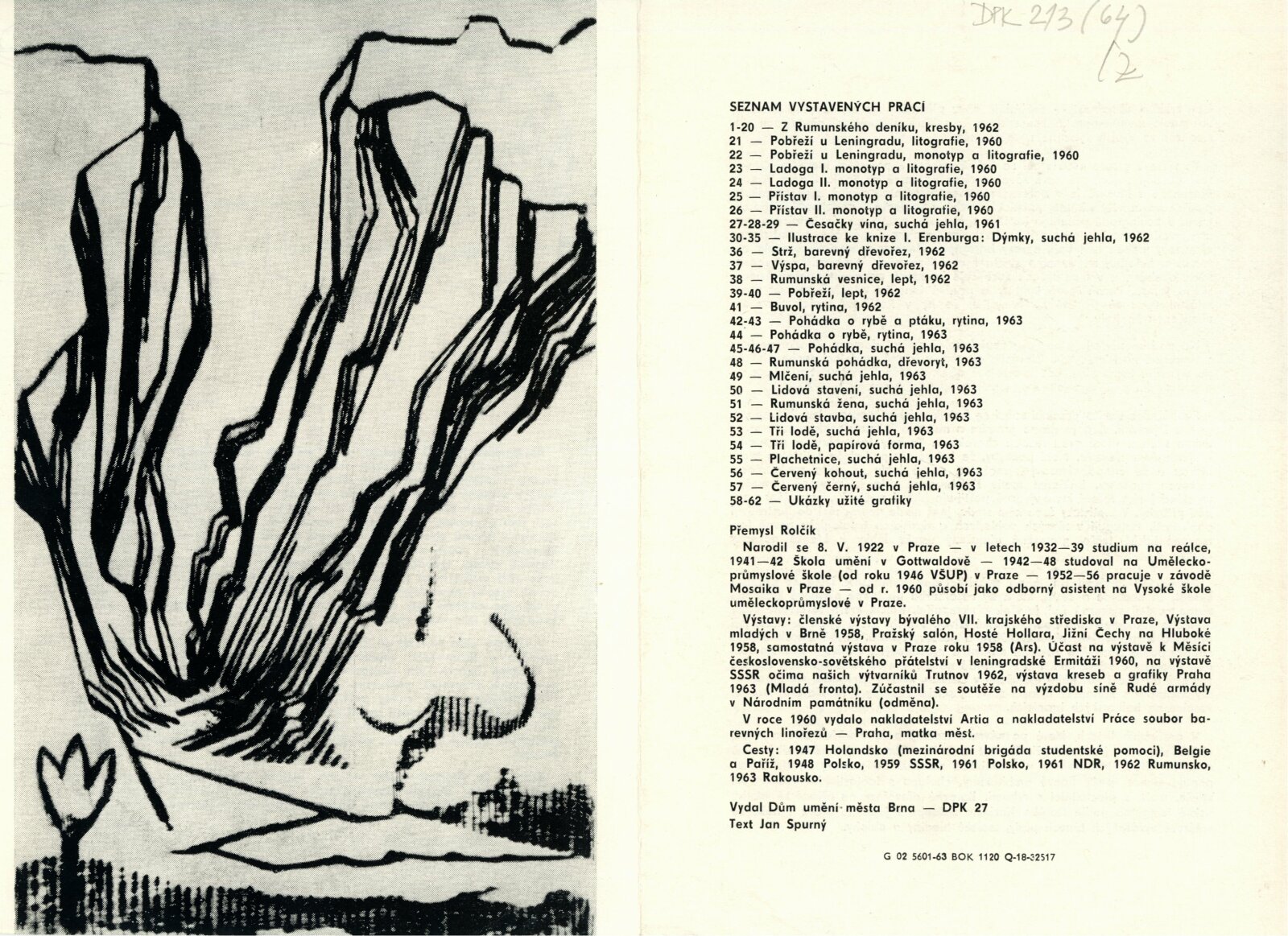 Přemysl Rolčík. Kresby a grafika: Dům umění města Brna / Dům pánů z Kunštátu, Kabinet grafiky, 11. 1. – 2. 2. 1964 / Text: Jan Spurný. – Brno: DUmB, 1964. – skládačka, 6 s., obr., DPK 213. – MZK; MG; MMB