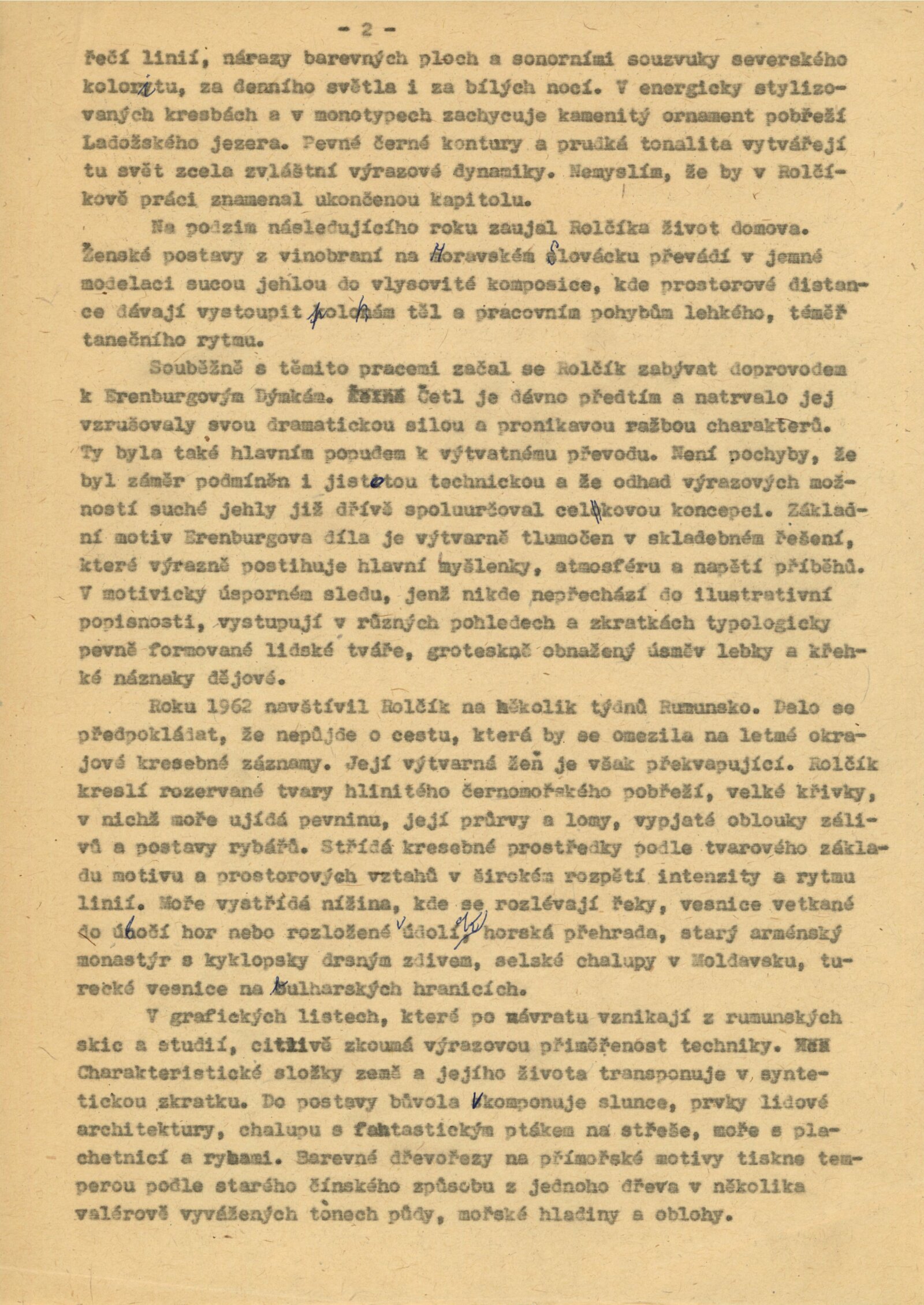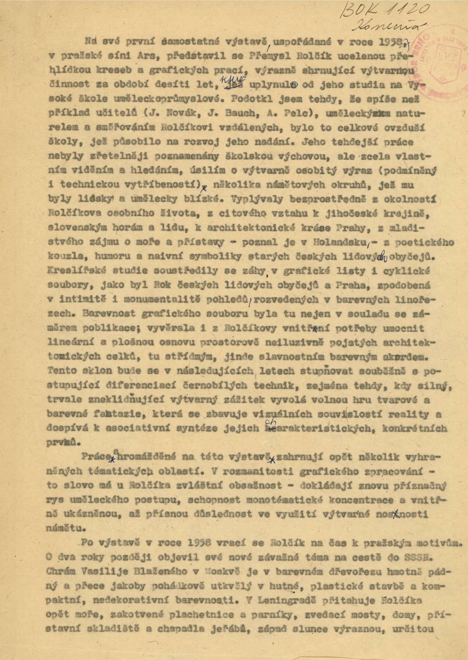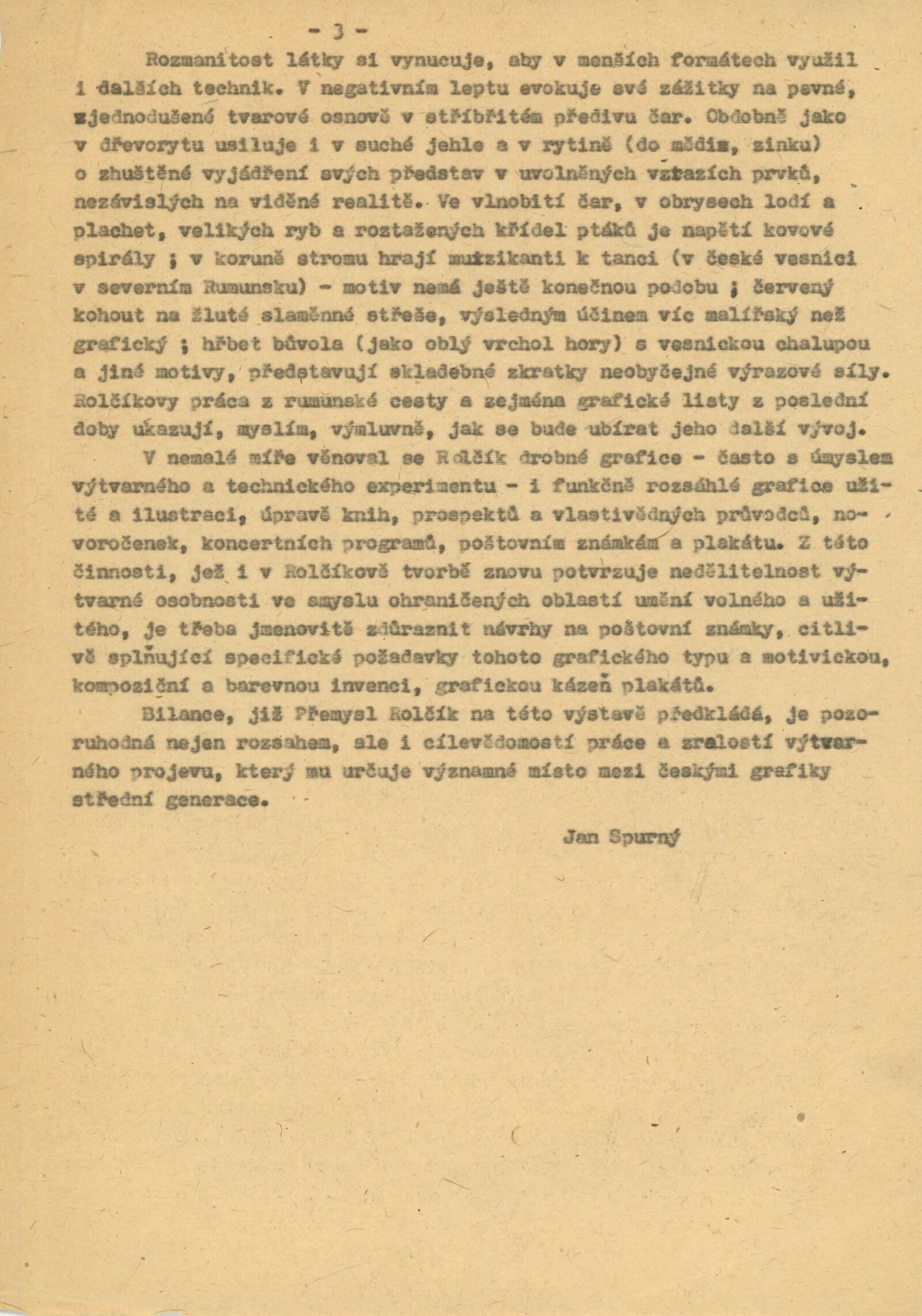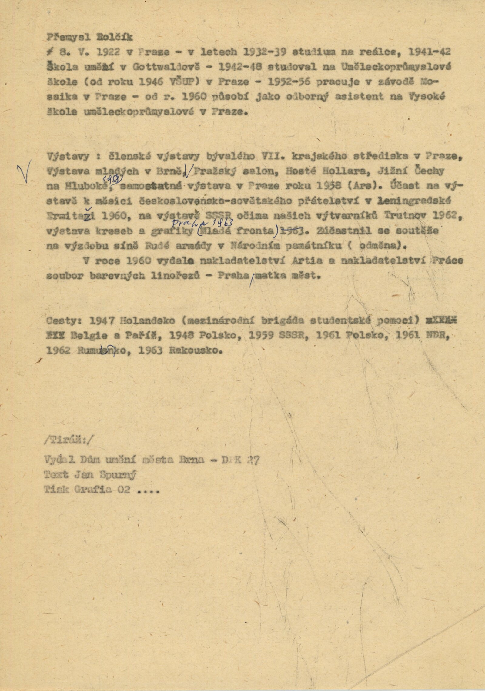 Přemysl Rolčík. Kresby a grafika: Dům umění města Brna / Dům pánů z Kunštátu, Kabinet grafiky, 11. 1. – 2. 2. 1964 / Text: Jan Spurný. – Brno: DUmB, 1964. – skládačka, 6 s., obr., DPK 213. – MZK; MG; MMB