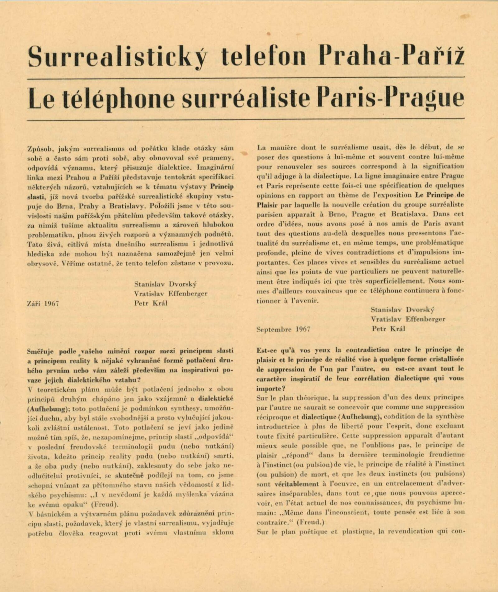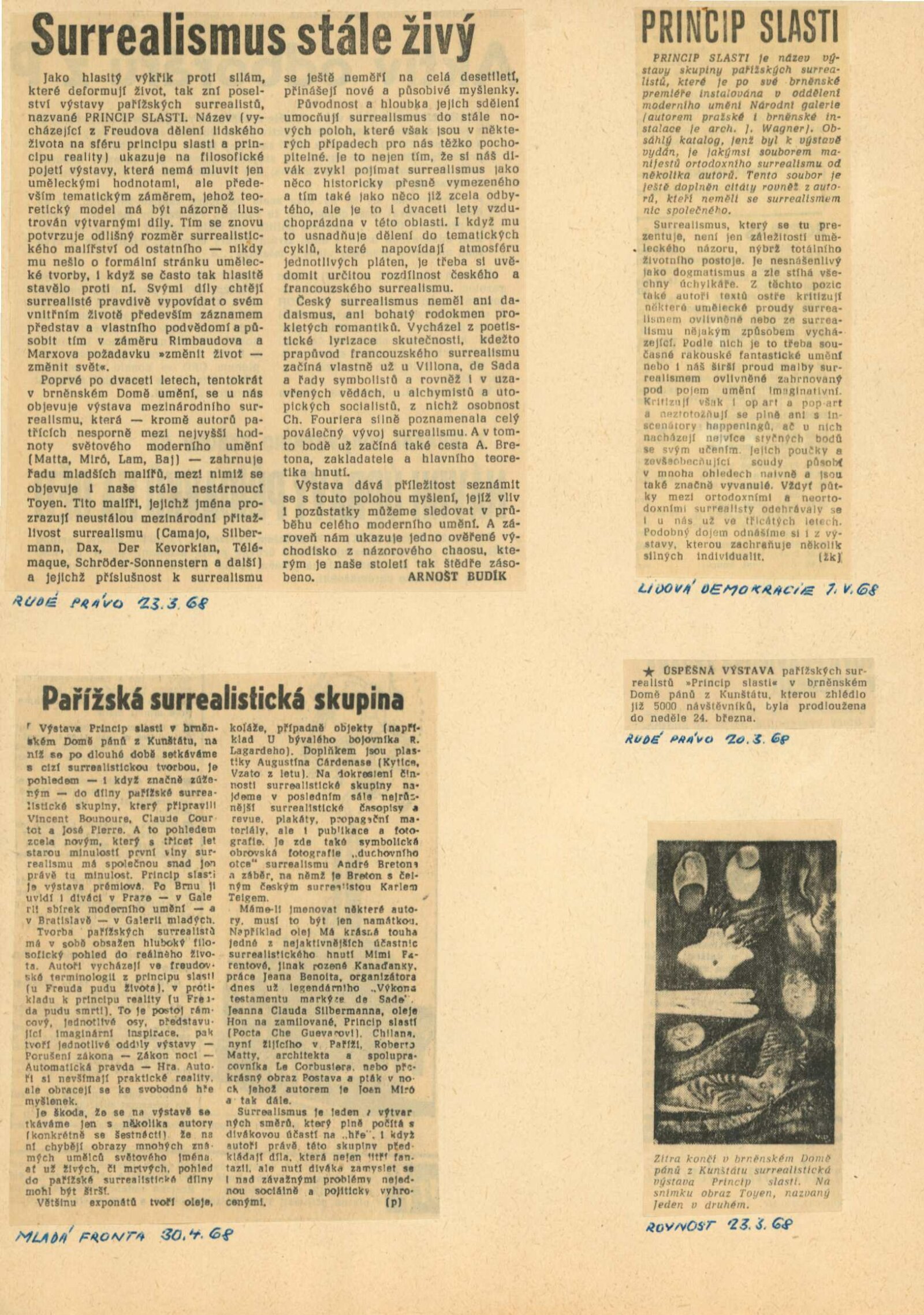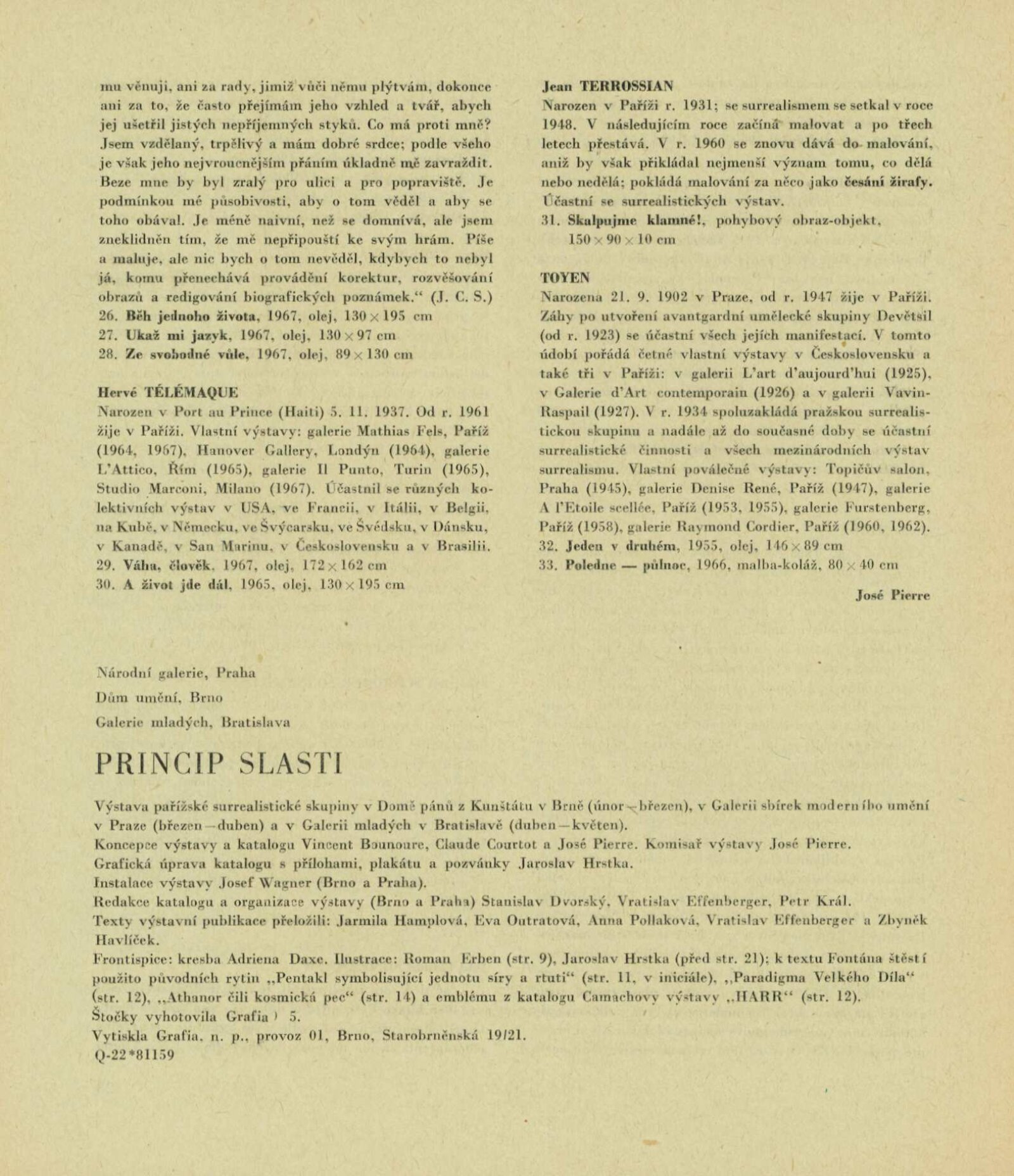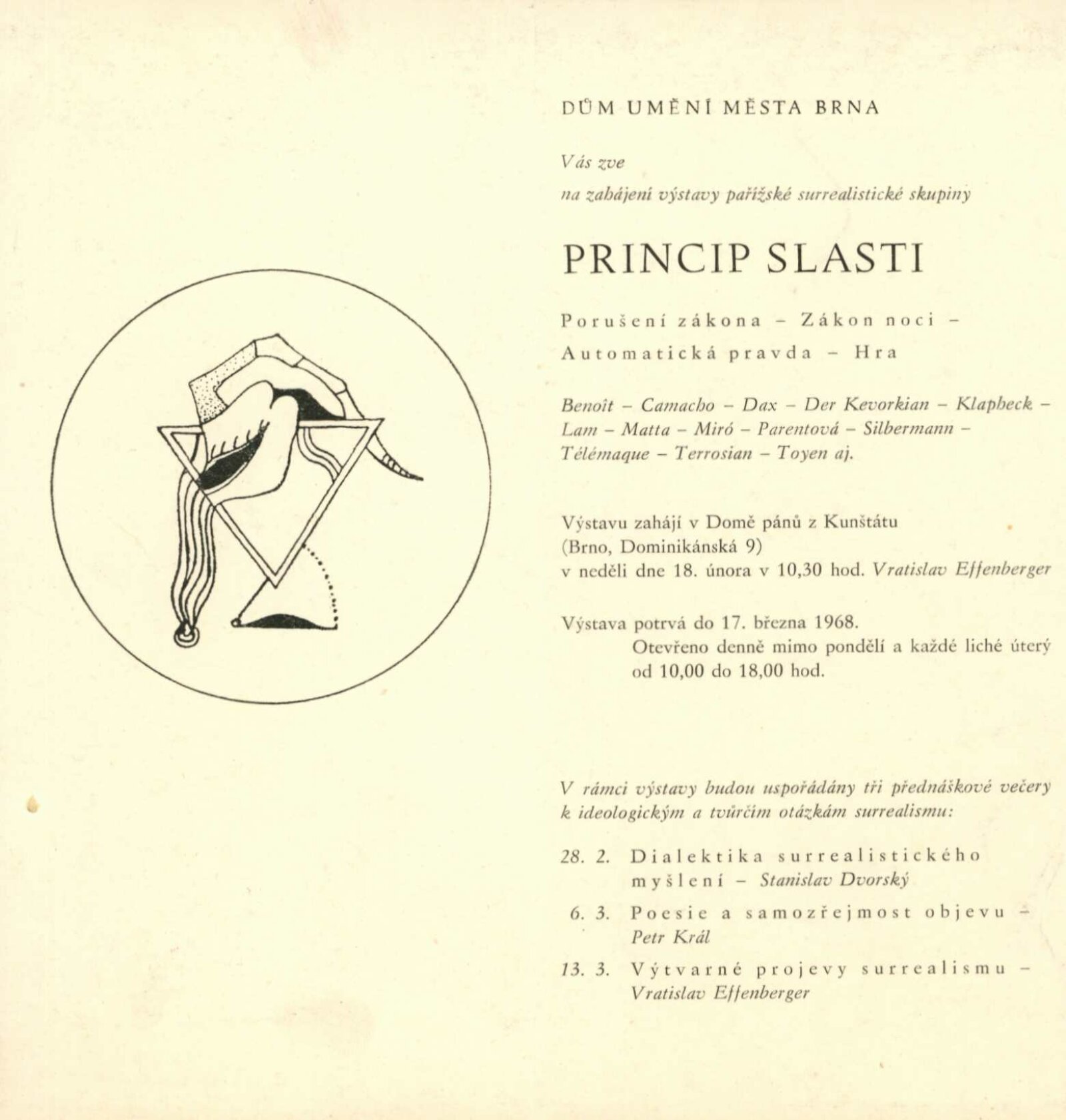 Princip slasti. Výstava pařížské surrealistické skupiny: Dům umění města Brna / Dům pánů z Kunštátu, 18. 2. – 17. 3. 1968 / Společný katalog. Princip slasti. Surrealismus: Brno, Praha, Bratislava únor–květen 1968 / Texty: Claude Courtot, Vincenc Bounoure, Philippe Audoin, José Pierre. – B. m. n. – 23 s., 26 s. obr. příl., surrealistický telefon Praha – Paříž 11 s., francouzské texty 11 s., DPK 371. – MZK; MG
