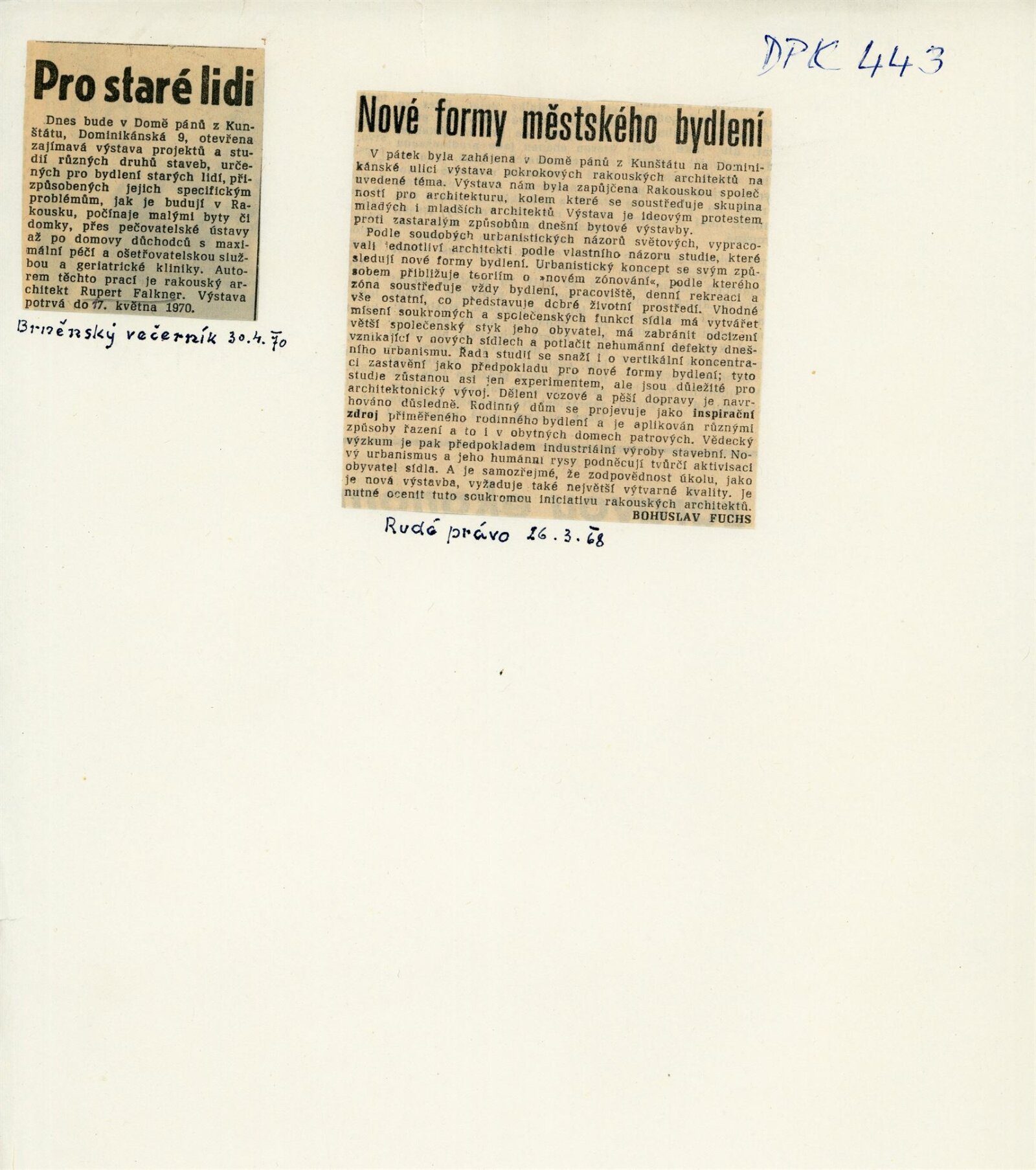 informační zpráva o výstavě v DU, pozvánka na diskuzi s autorem (za Měst. Svaz architektů Brno Ivan Ruller), korespondence (DU, Rupert Falkner, Bohuslav Fuchs, SA Brno), recenze v tisku