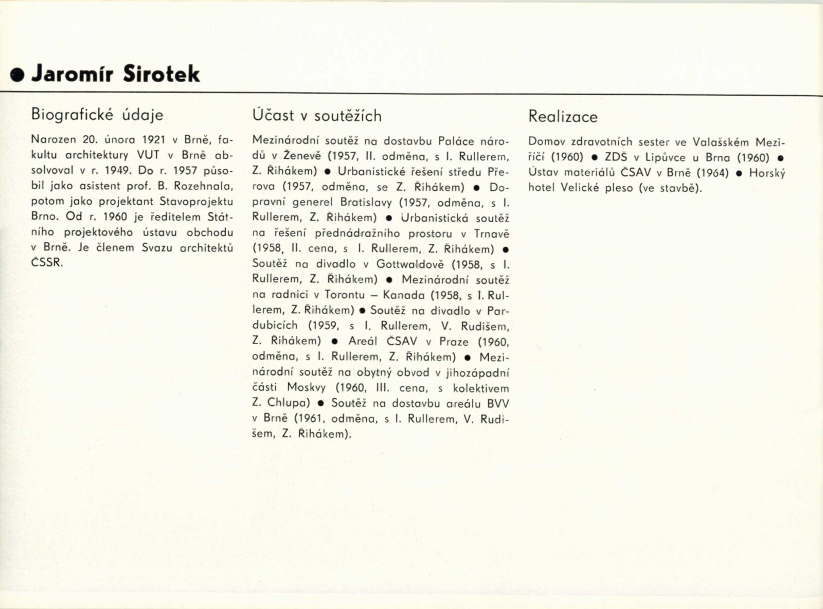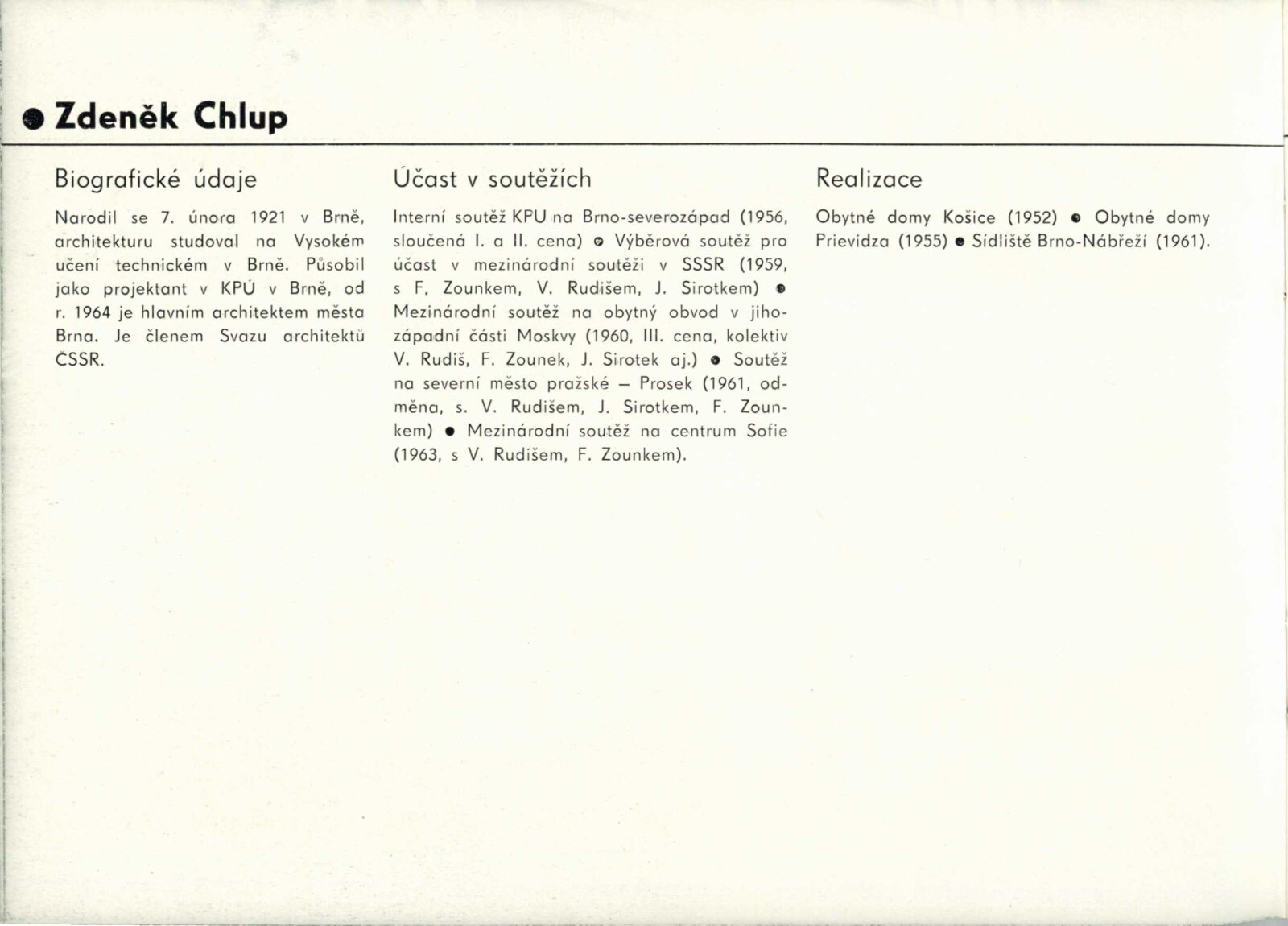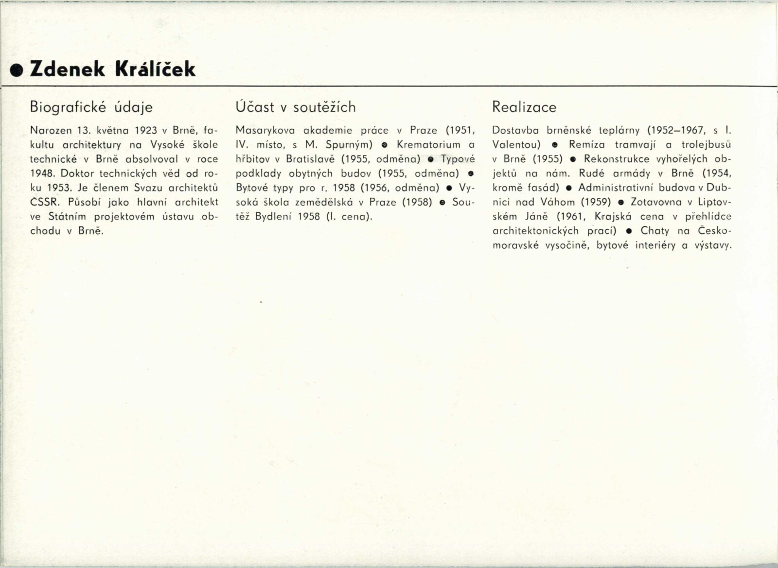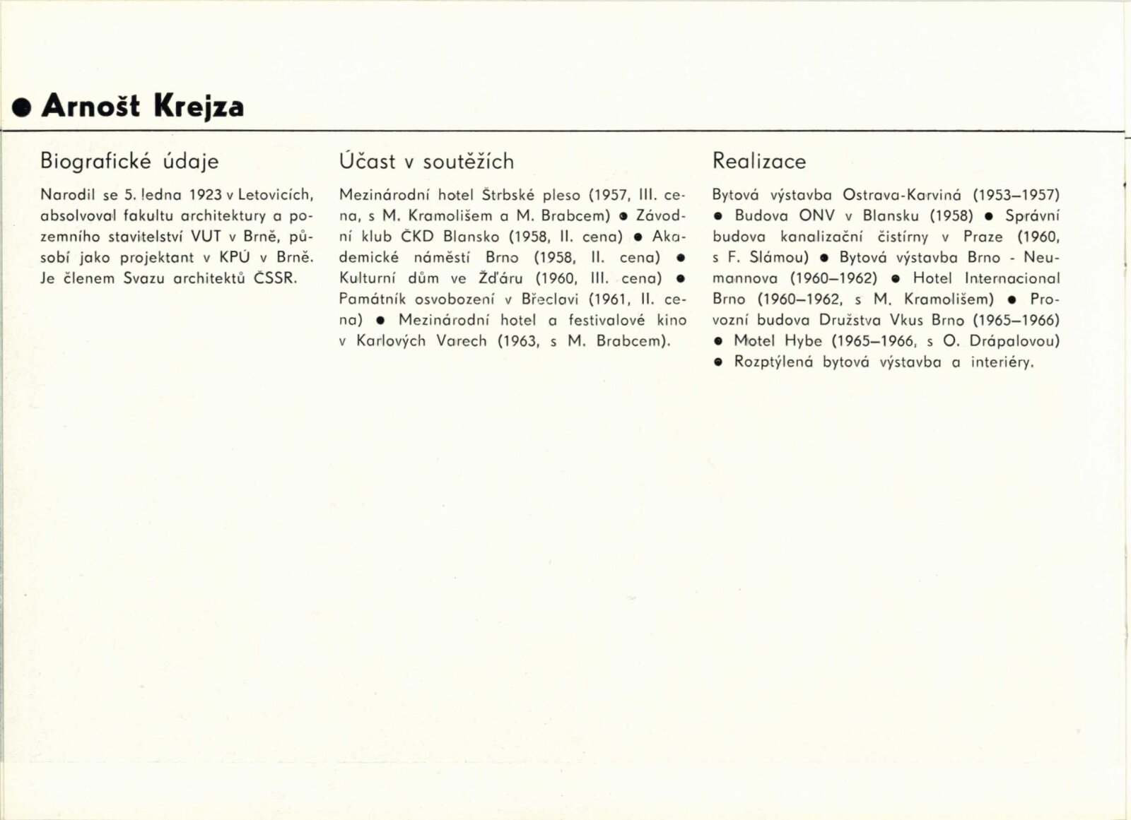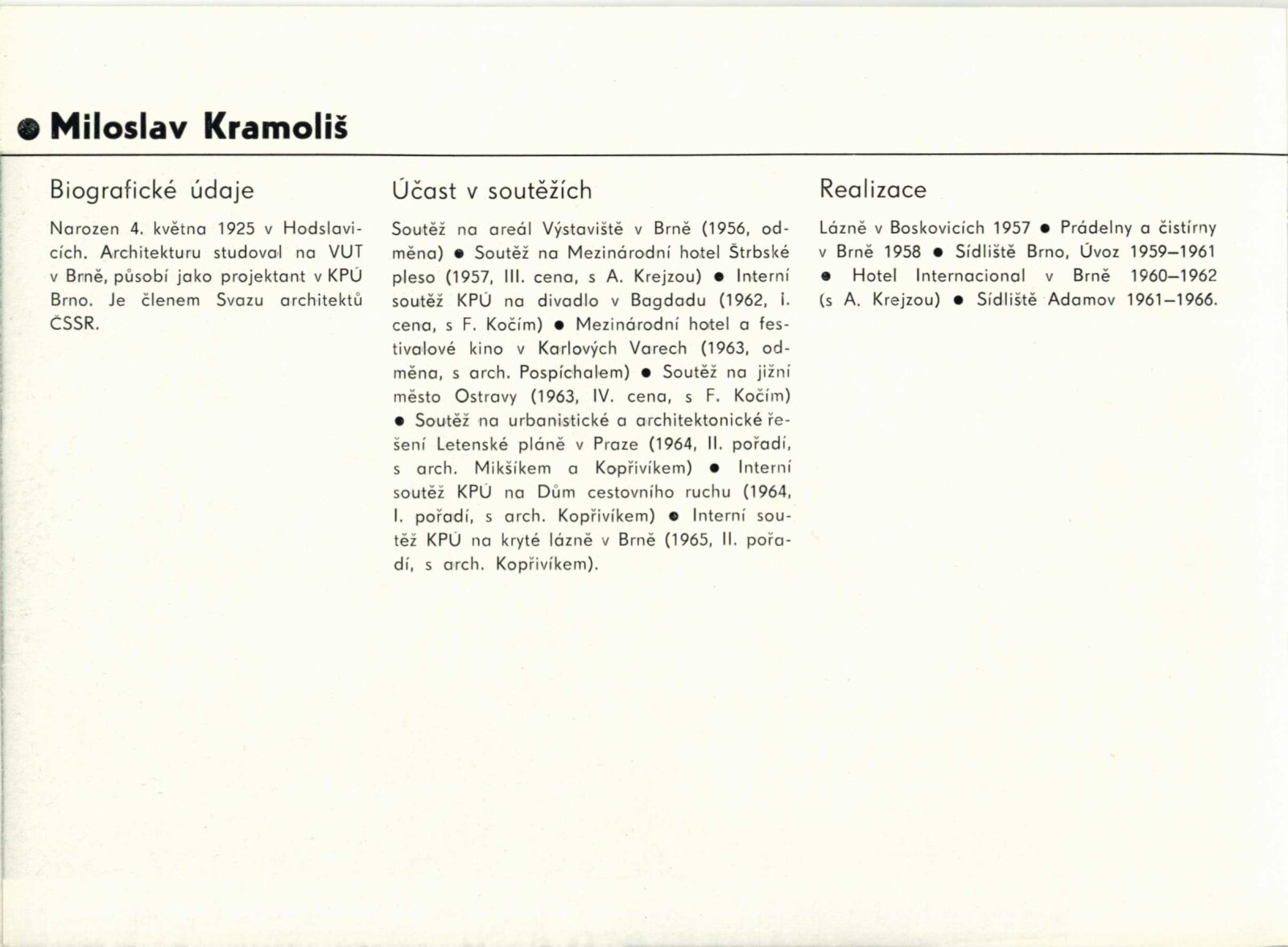 Profily brněnských architektů I: Dům umění města Brna / Dům pánů z Kunštátu, Kabinet architektury Svazu architektů ČSSR, 3. 12. 1965 – 12. 1. 1966 / Text: Iloš Crhonek. – Brno: Svaz architektů ČSSR, 1965. – 76 s., obr., životopisy, soutěže, realizace, studijní cesty + 4 s., obr., DPK 291. – MG; MMB