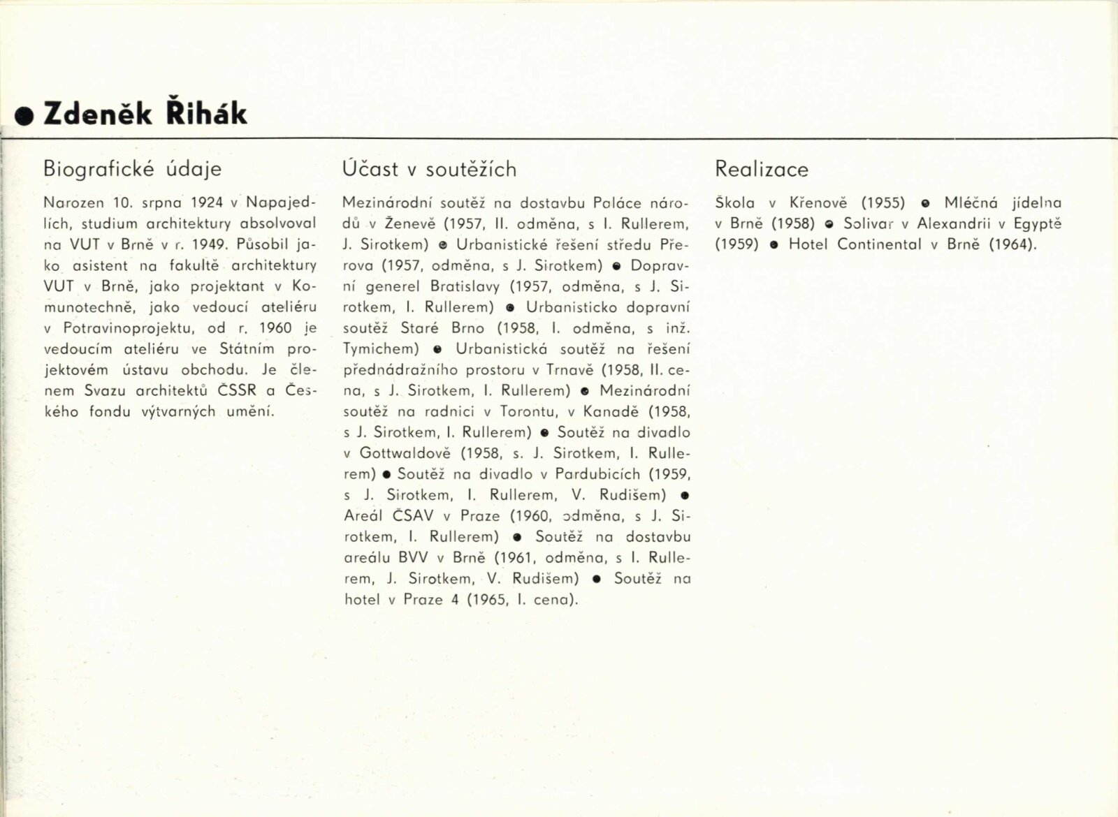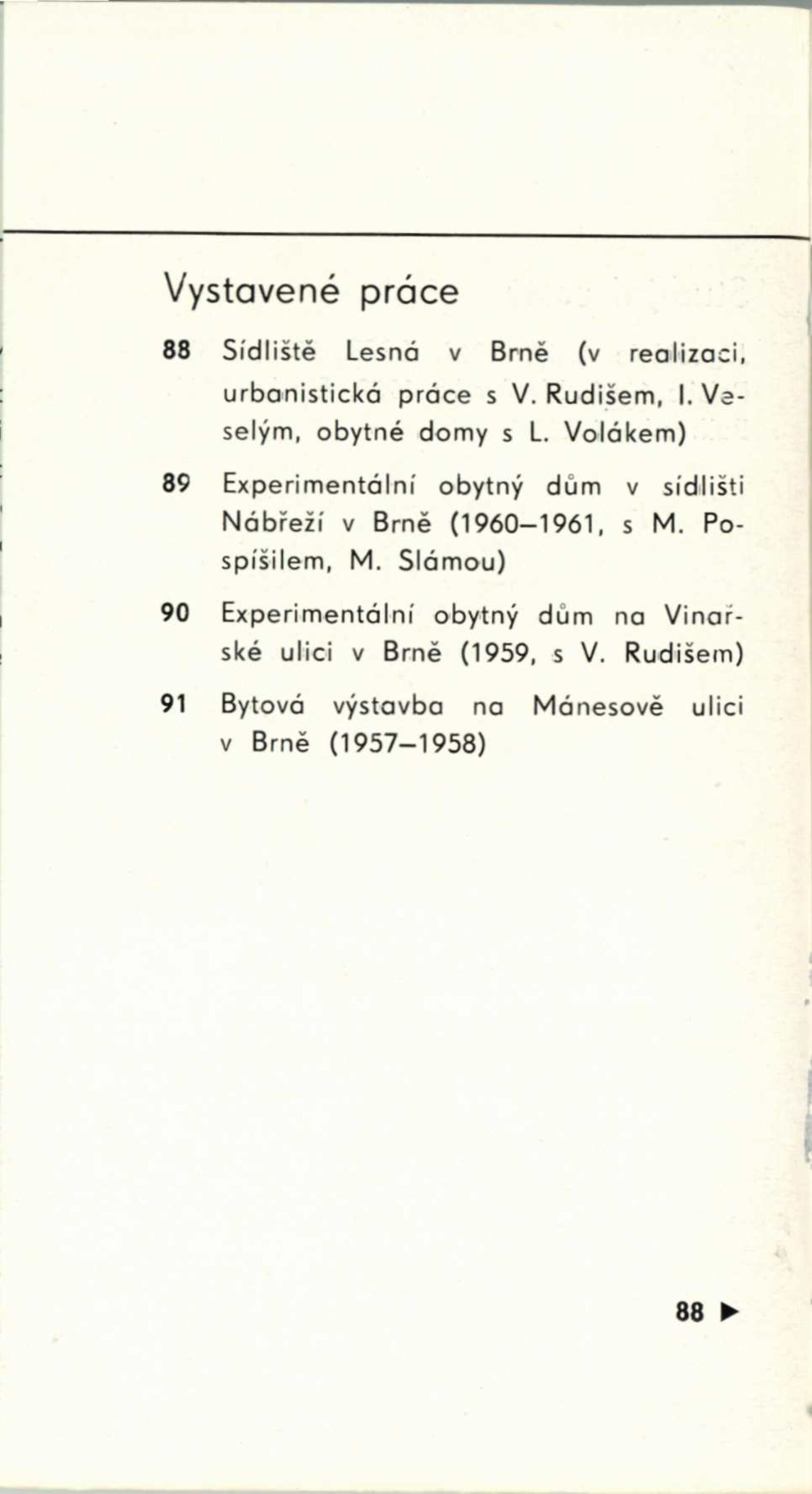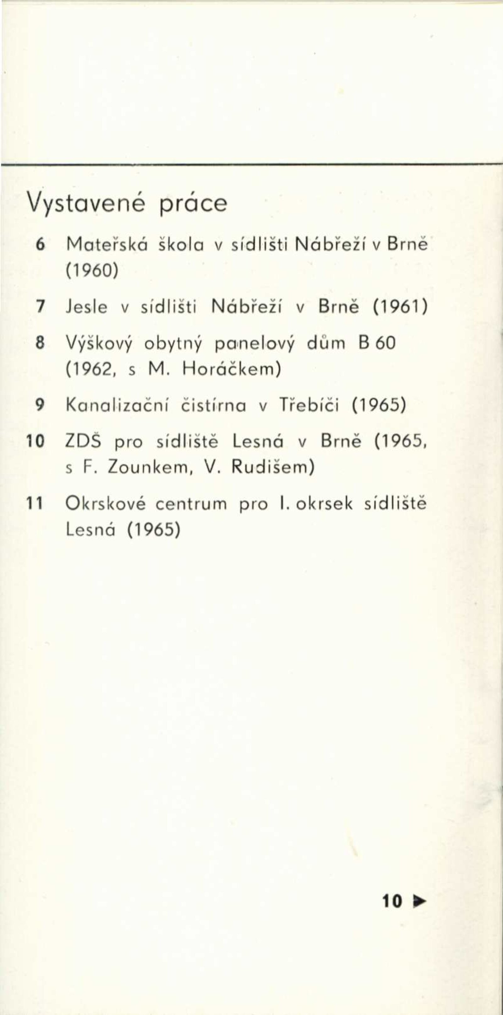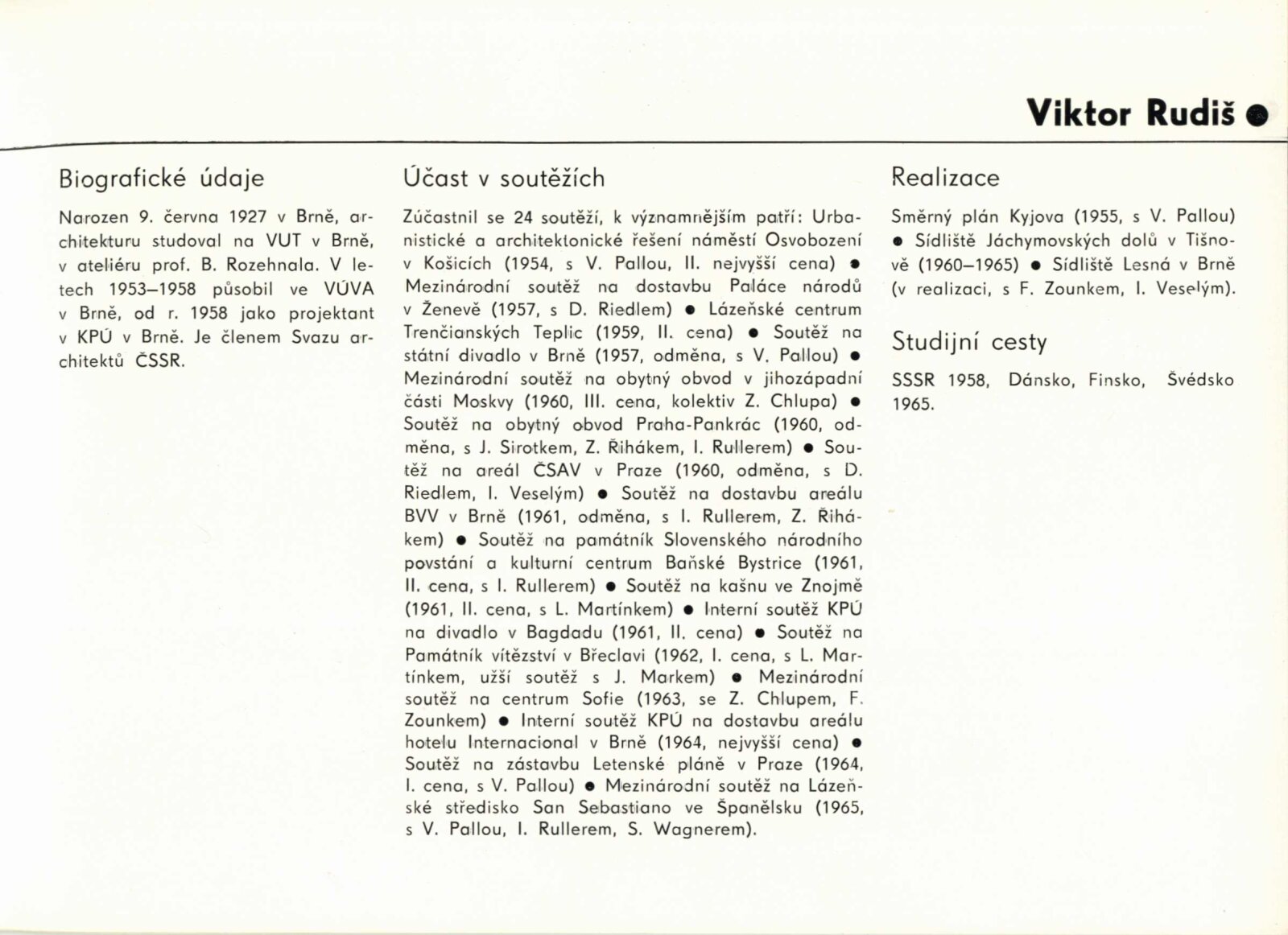 Profily brněnských architektů I: Dům umění města Brna / Dům pánů z Kunštátu, Kabinet architektury Svazu architektů ČSSR, 3. 12. 1965 – 12. 1. 1966 / Text: Iloš Crhonek. – Brno: Svaz architektů ČSSR, 1965. – 76 s., obr., životopisy, soutěže, realizace, studijní cesty + 4 s., obr., DPK 291. – MG; MMB