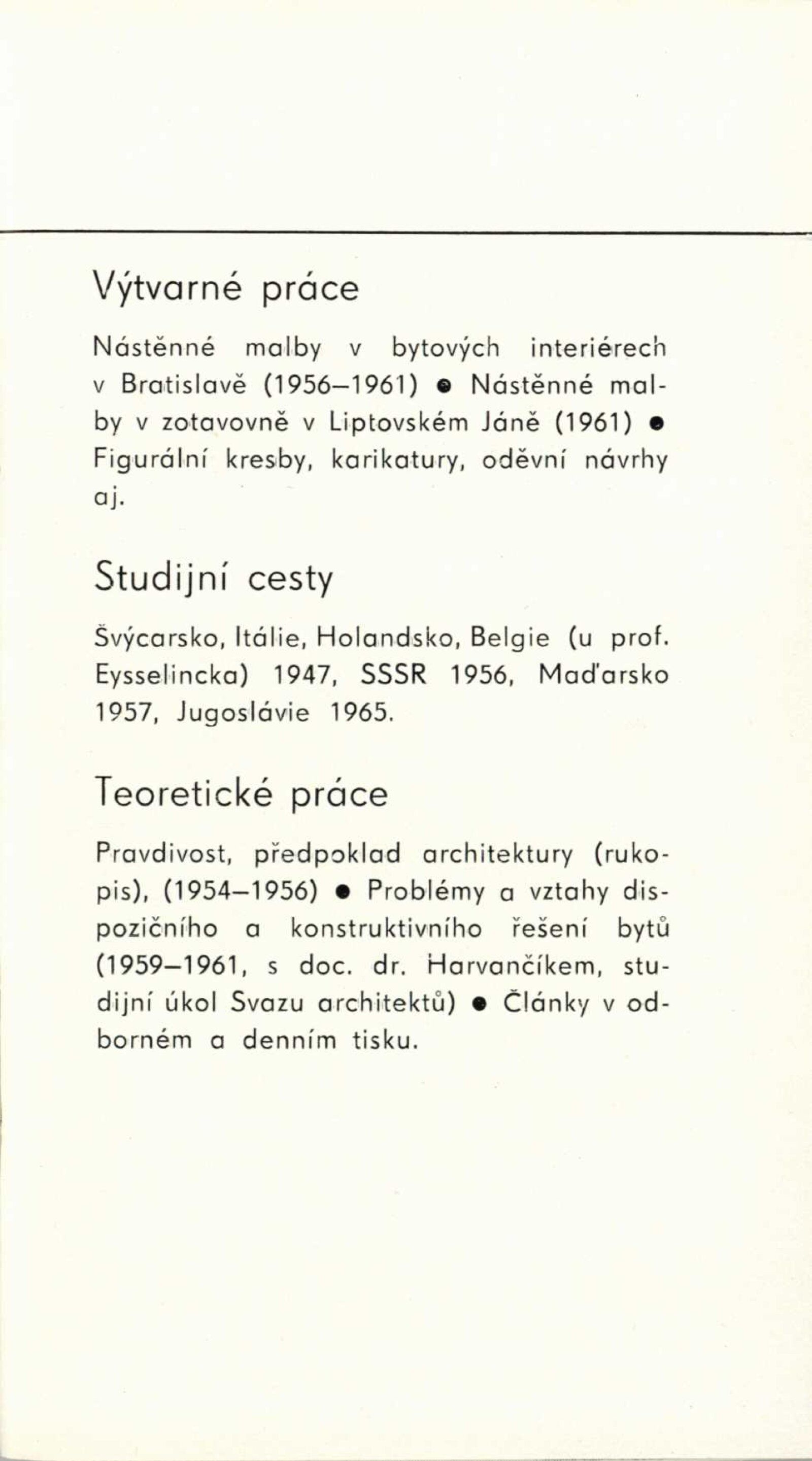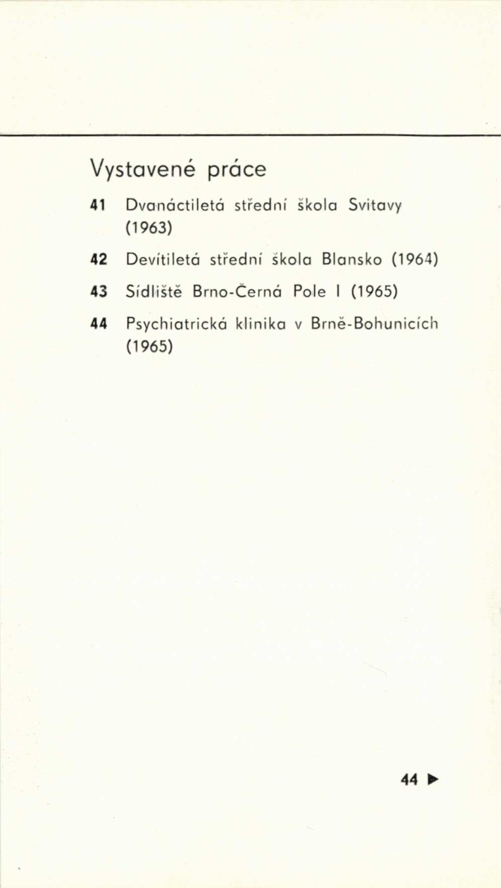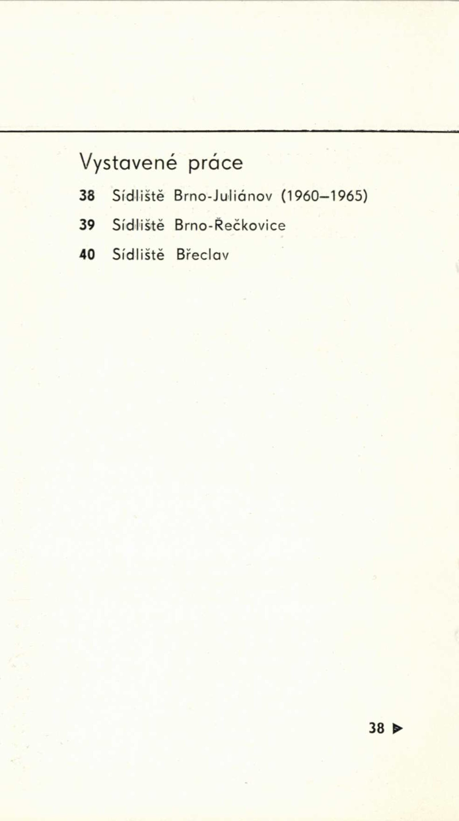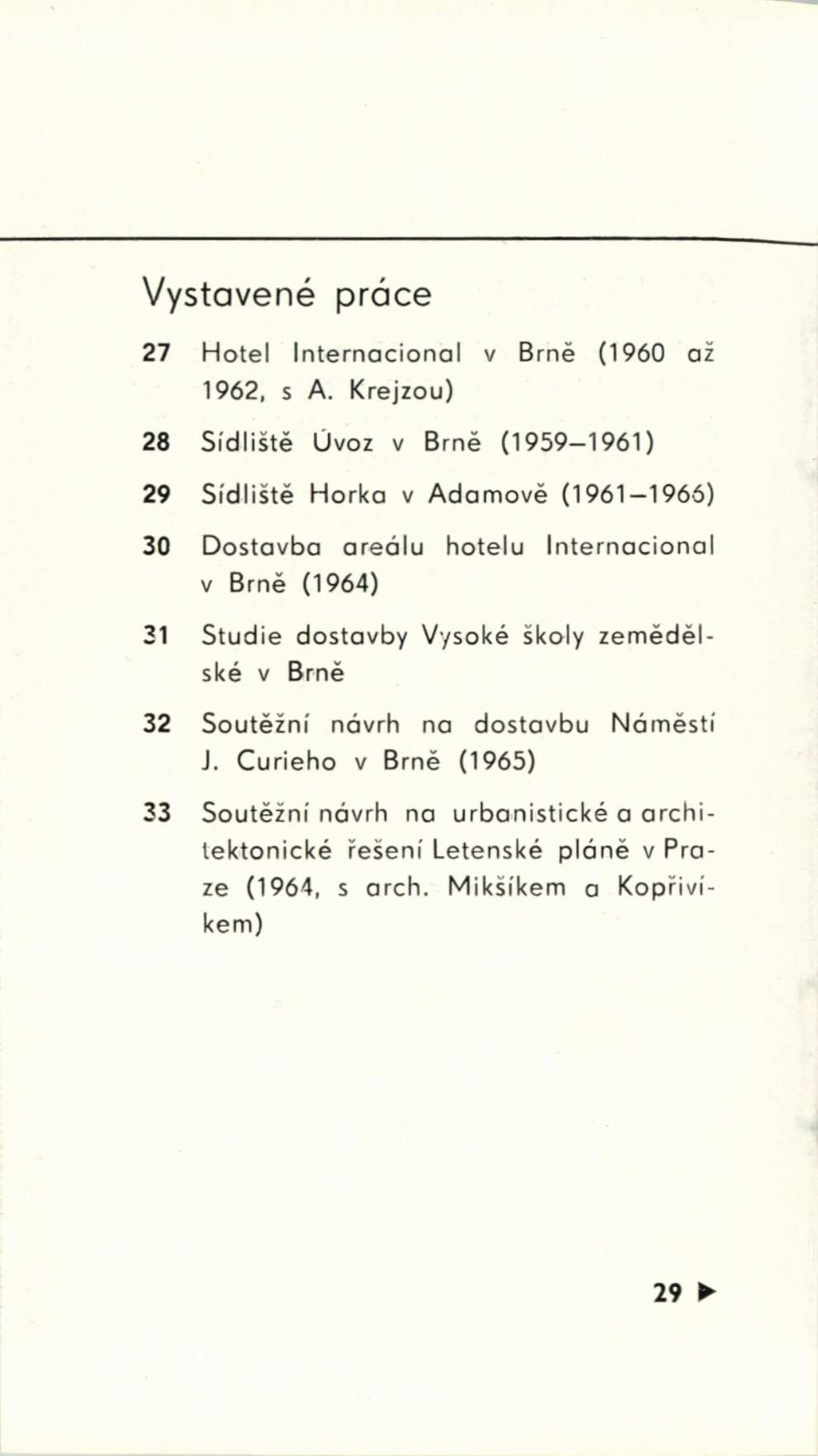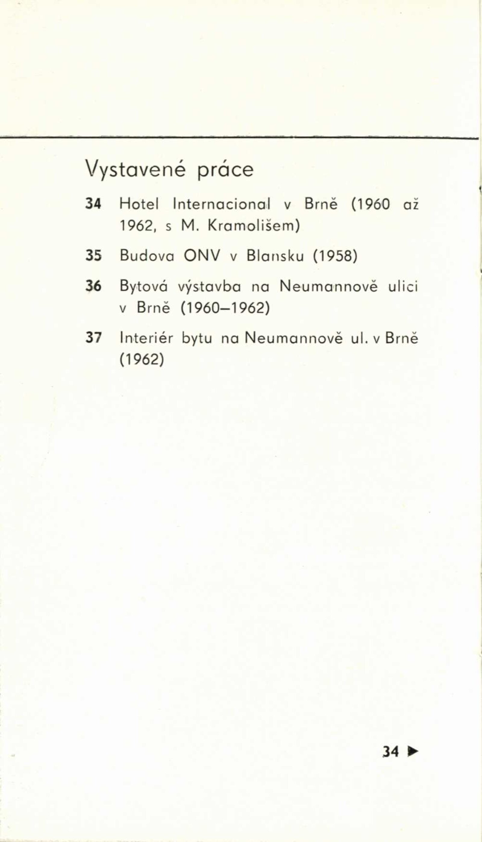 Profily brněnských architektů I: Dům umění města Brna / Dům pánů z Kunštátu, Kabinet architektury Svazu architektů ČSSR, 3. 12. 1965 – 12. 1. 1966 / Text: Iloš Crhonek. – Brno: Svaz architektů ČSSR, 1965. – 76 s., obr., životopisy, soutěže, realizace, studijní cesty + 4 s., obr., DPK 291. – MG; MMB