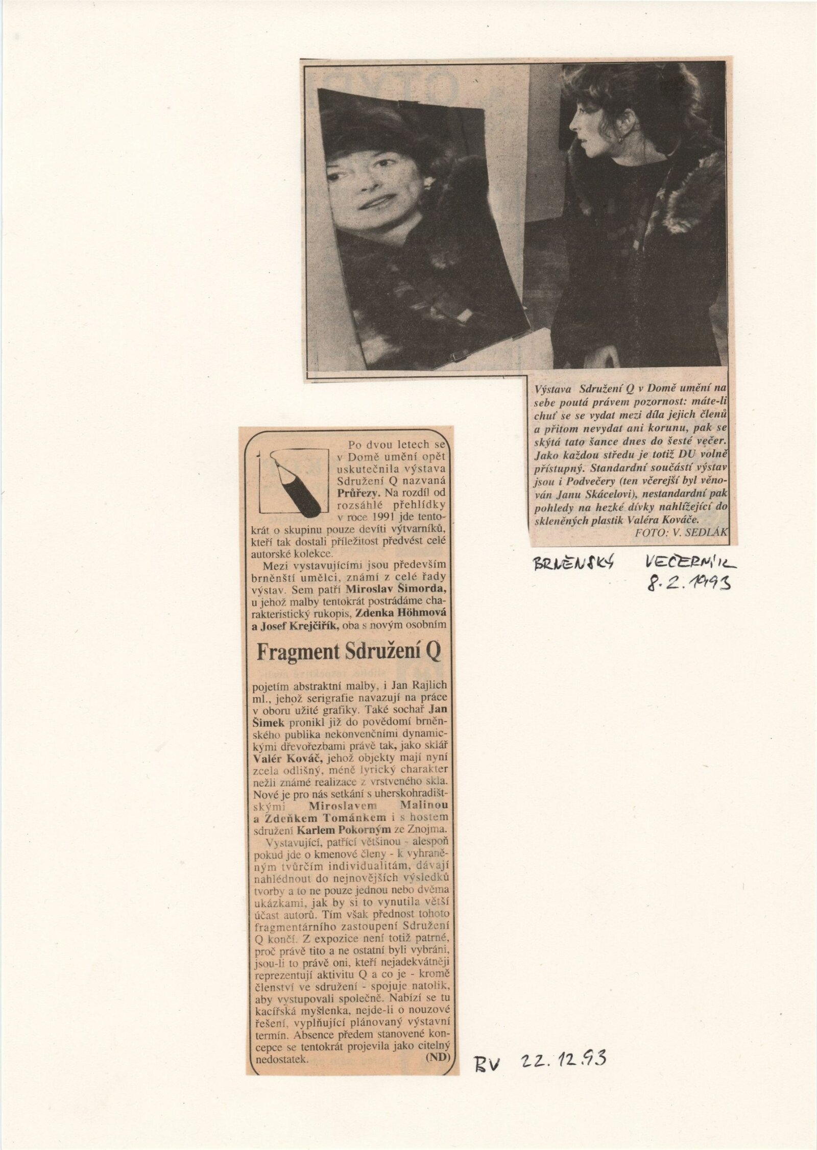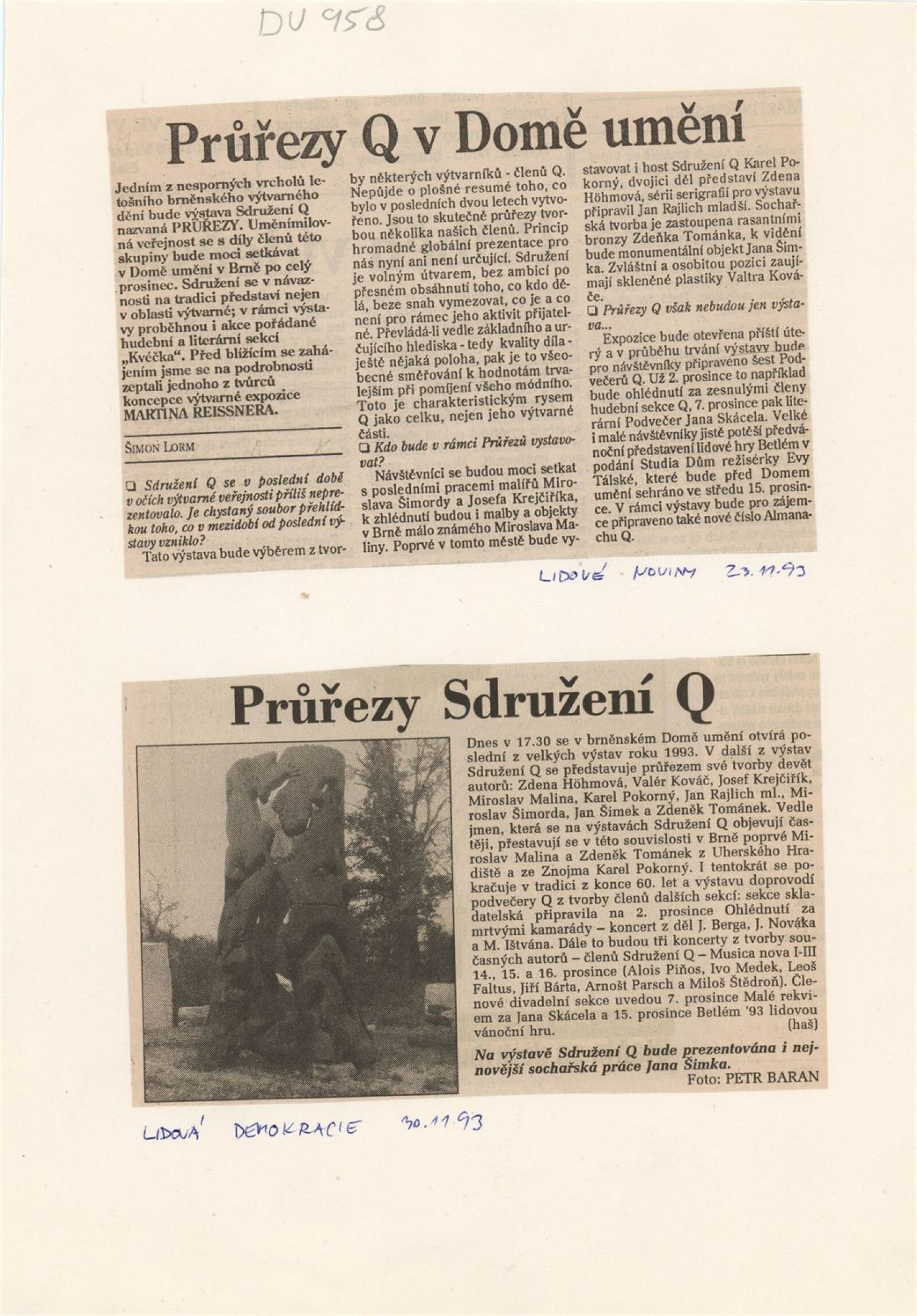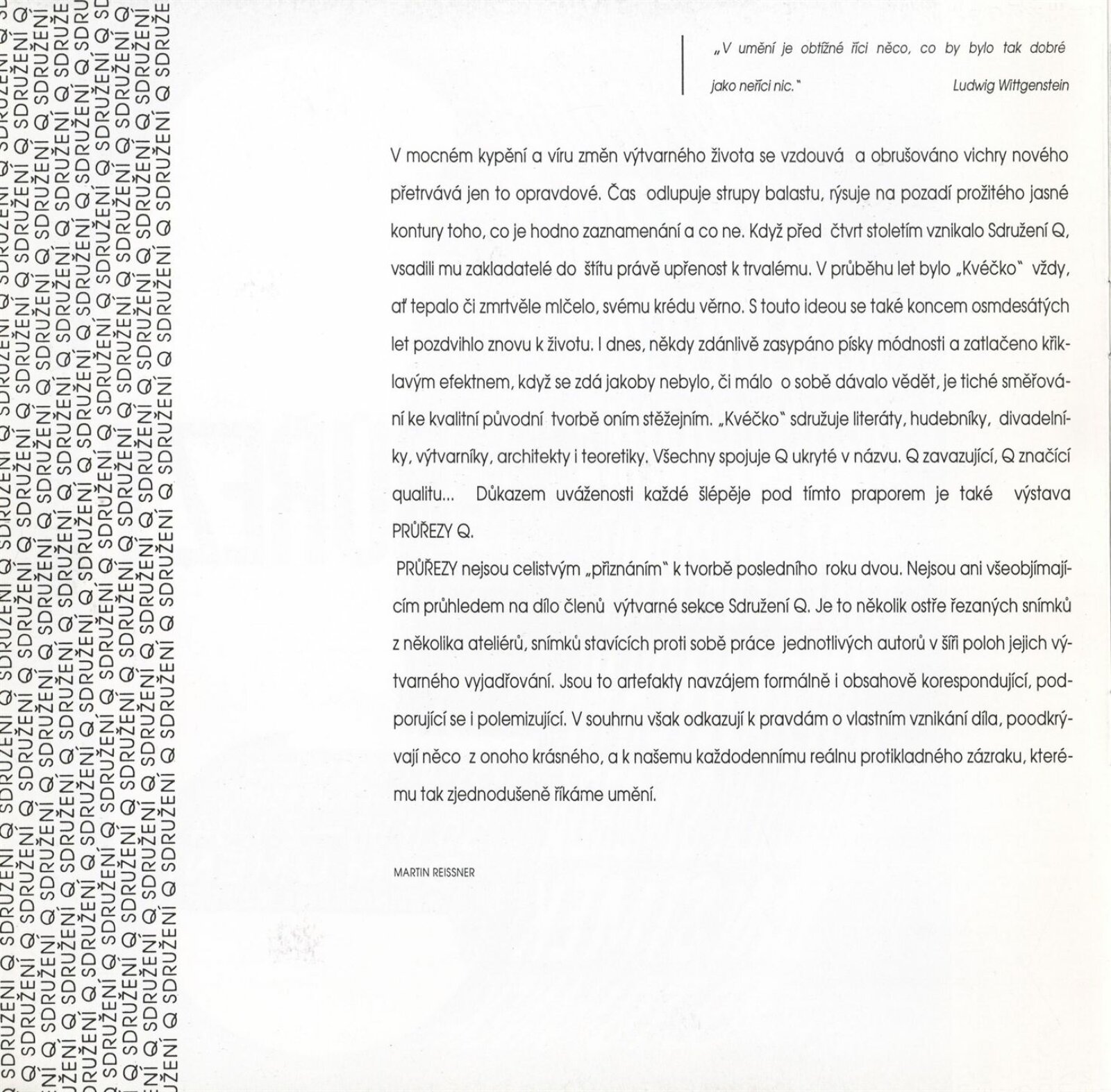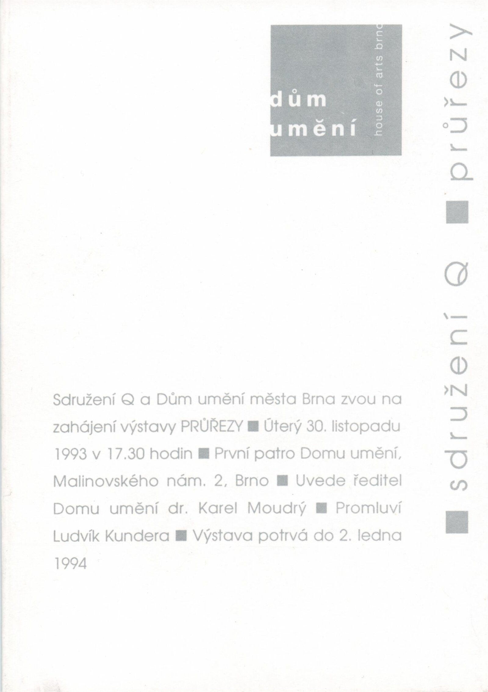 Průřezy. Sdružení Q Brno: Dům umění Brno 30. 11. 1993 – 2. 1. 1994 / Text Martin Reissner. - Brno: Sdružení Q, - [12] s., obr. DU 958