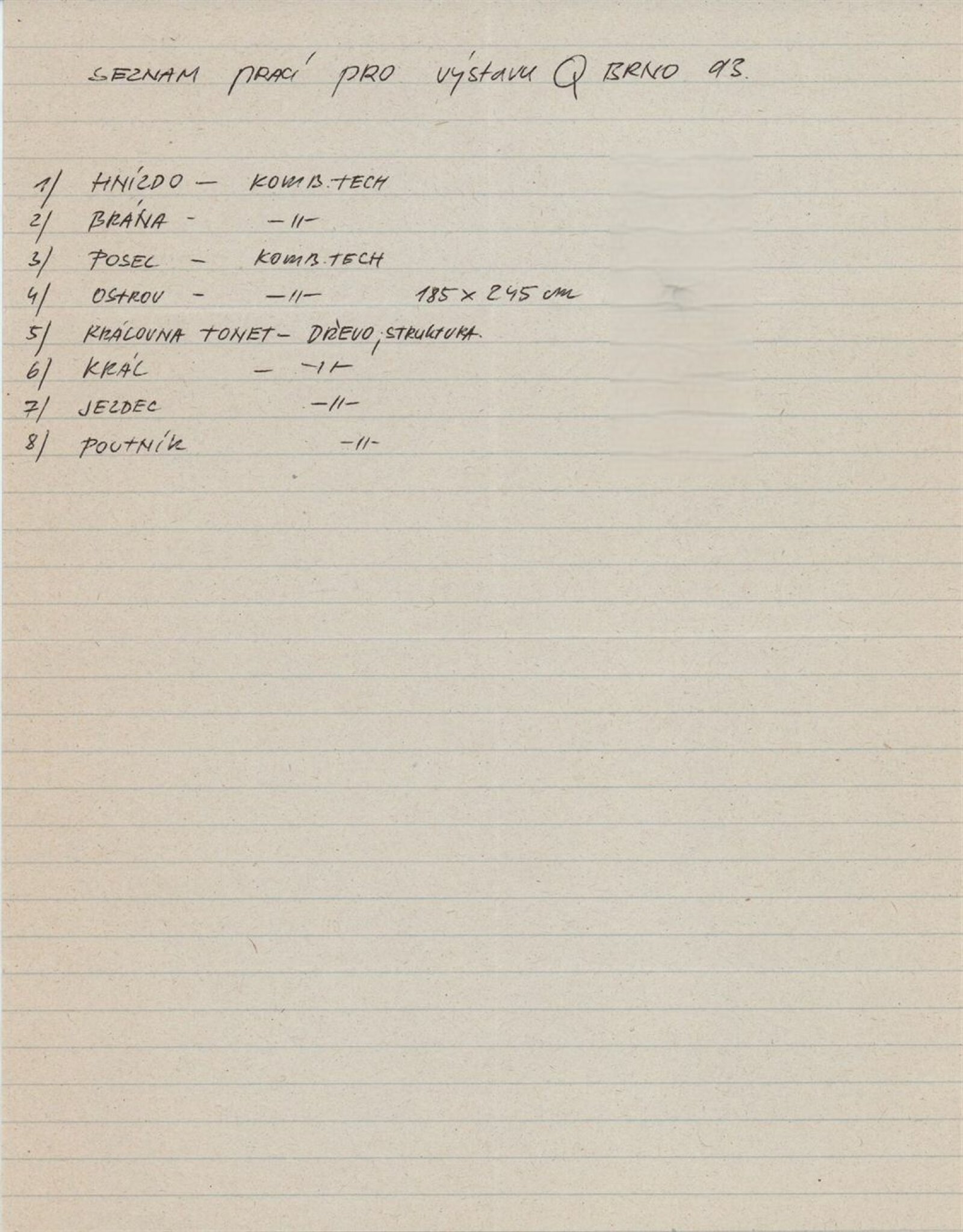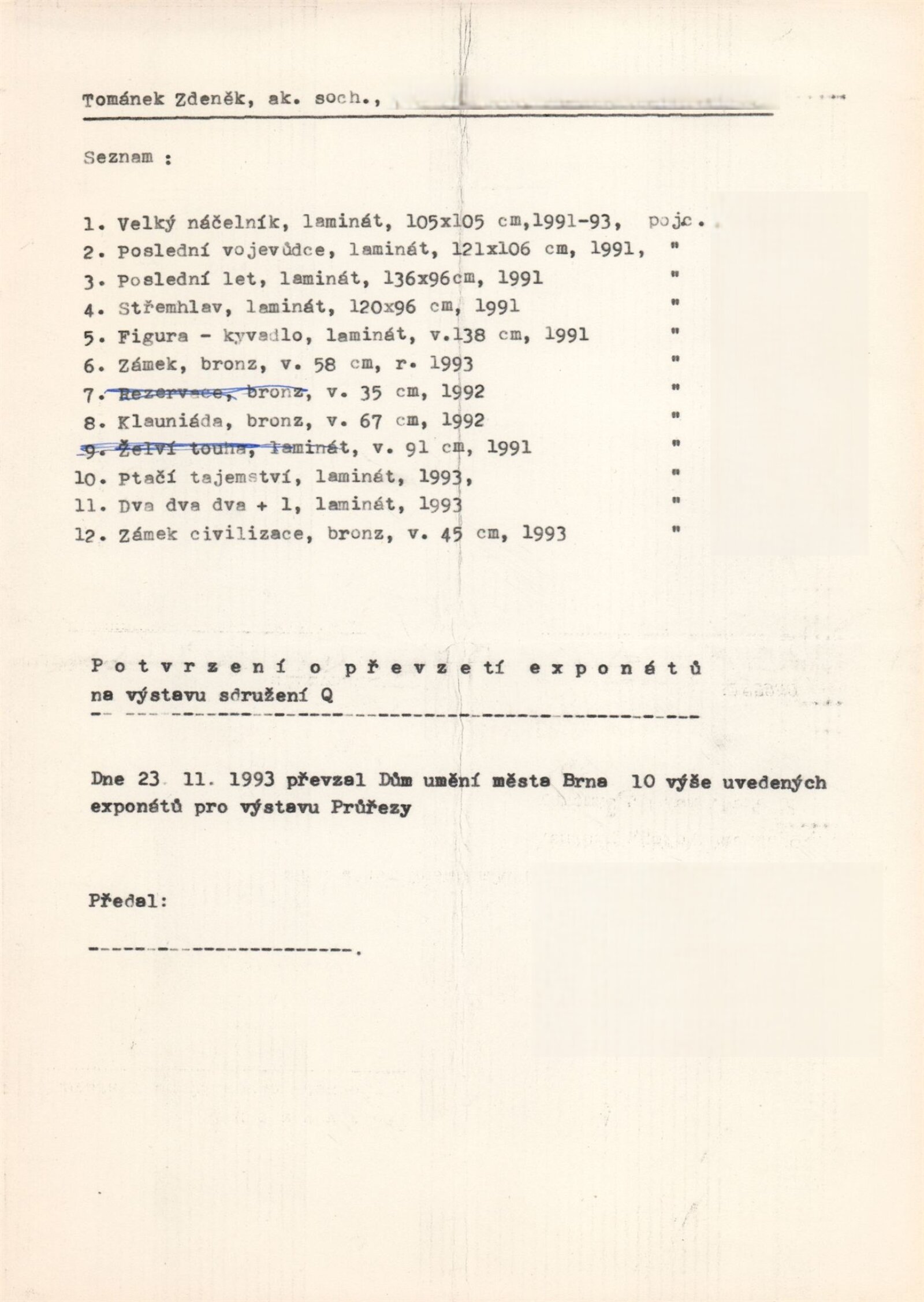pozvánka, katalog, záznamy z jednání komise pro přípravu výstavy, podklady k výstavě, fotografie z vernisáže, instalace, korespondence, potvrzení o převzetí, recenze v tisku, poznámky
