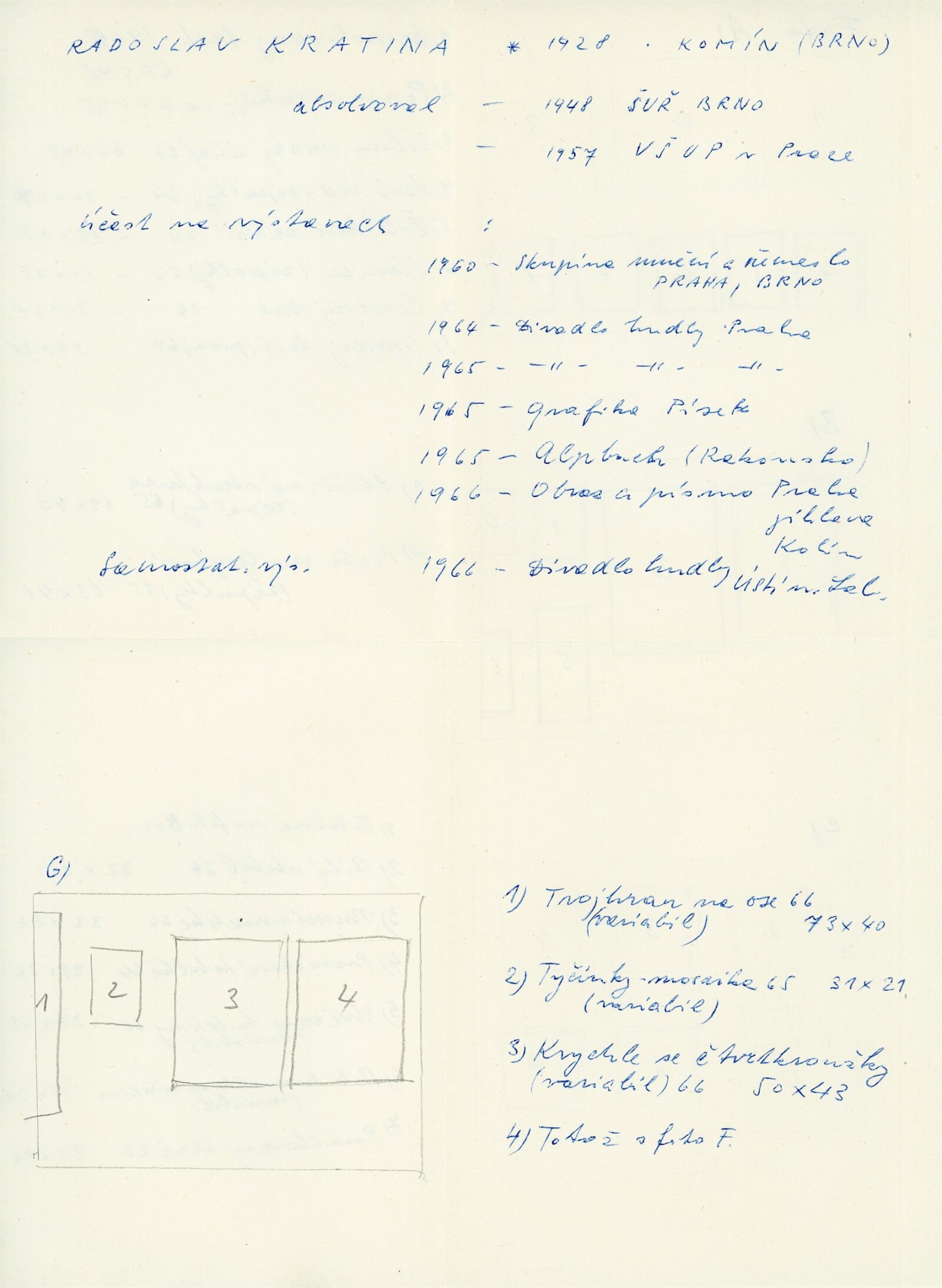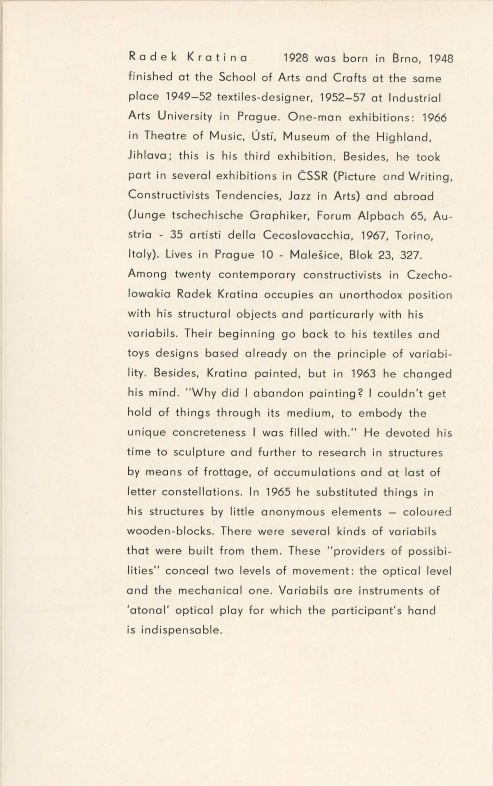 Radek Kratina: Dům umění, 12. výstava Galerie Jaroslava Krále, 6. 5. – 4. 6. 1967/ Text: Arsén Pohribný. – Brno: ČFVU, 1967. – 9 s., 4 s. obr. příl., portrét, životopis, DU 483. – MZK; MG; MMB