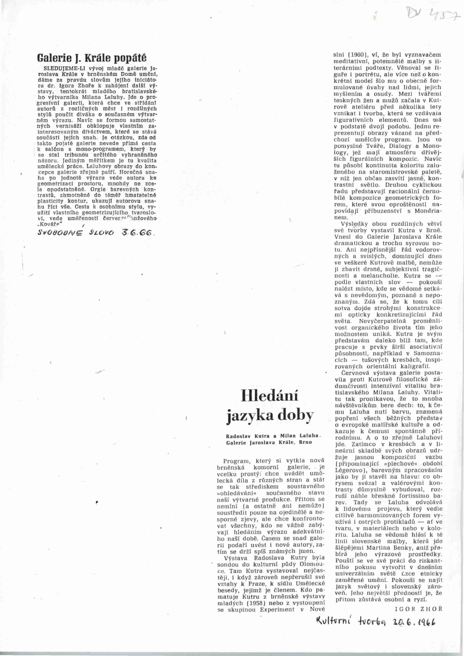 Radoslav Kutra. Obrazy: Dům umění města Brna, Galerie Jaroslava Krále, 9. 4. – 9. 5. 1966 / Text: Karel Floss. – Brno: ČFVU, 1966. – 10 s., 4 s. obr. příl., DU 457. – MZK; MG; MMB