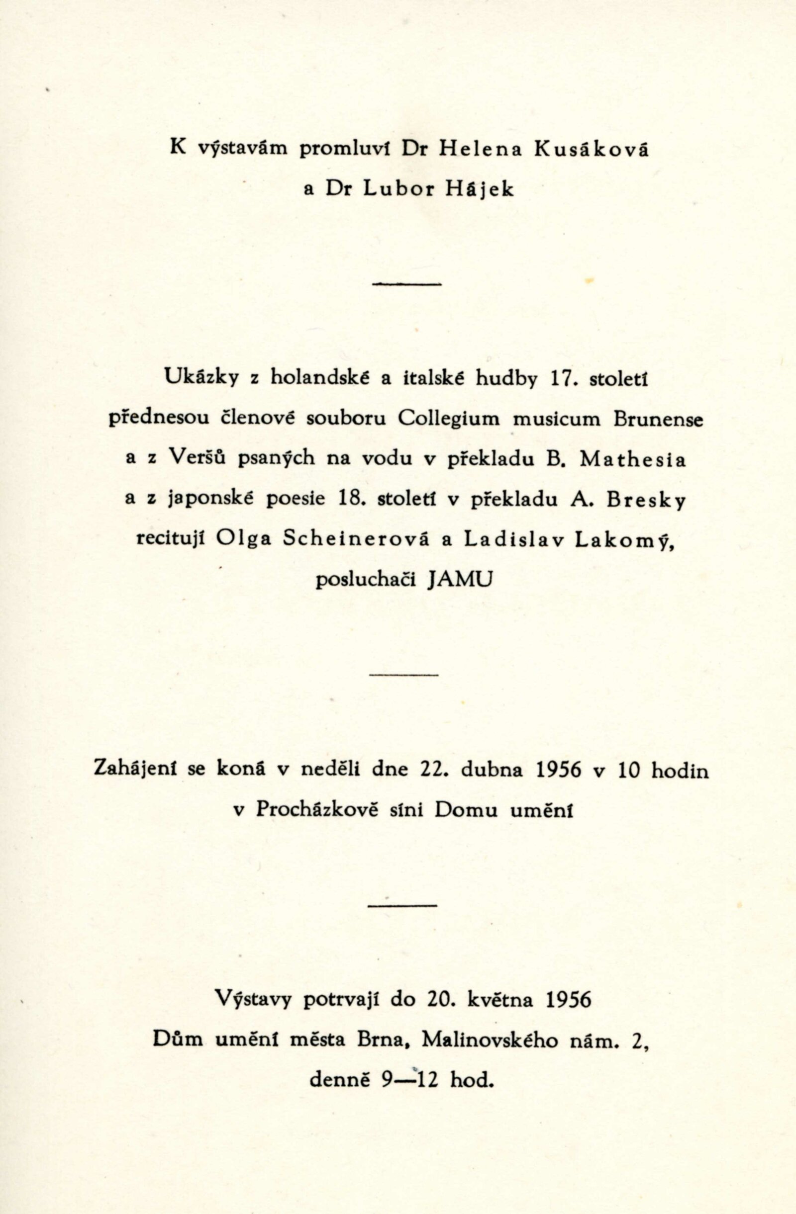 Rembrandt. Výstava kreseb a grafiky k 350. výročí narození: Dům umění města Brna, 22. 4. – 20. 5. 1956 / Text: Helena Kusáková. – Brno: DUmB, 1956. – 11 s., odborné popisy exponátů, DU 247. – MG