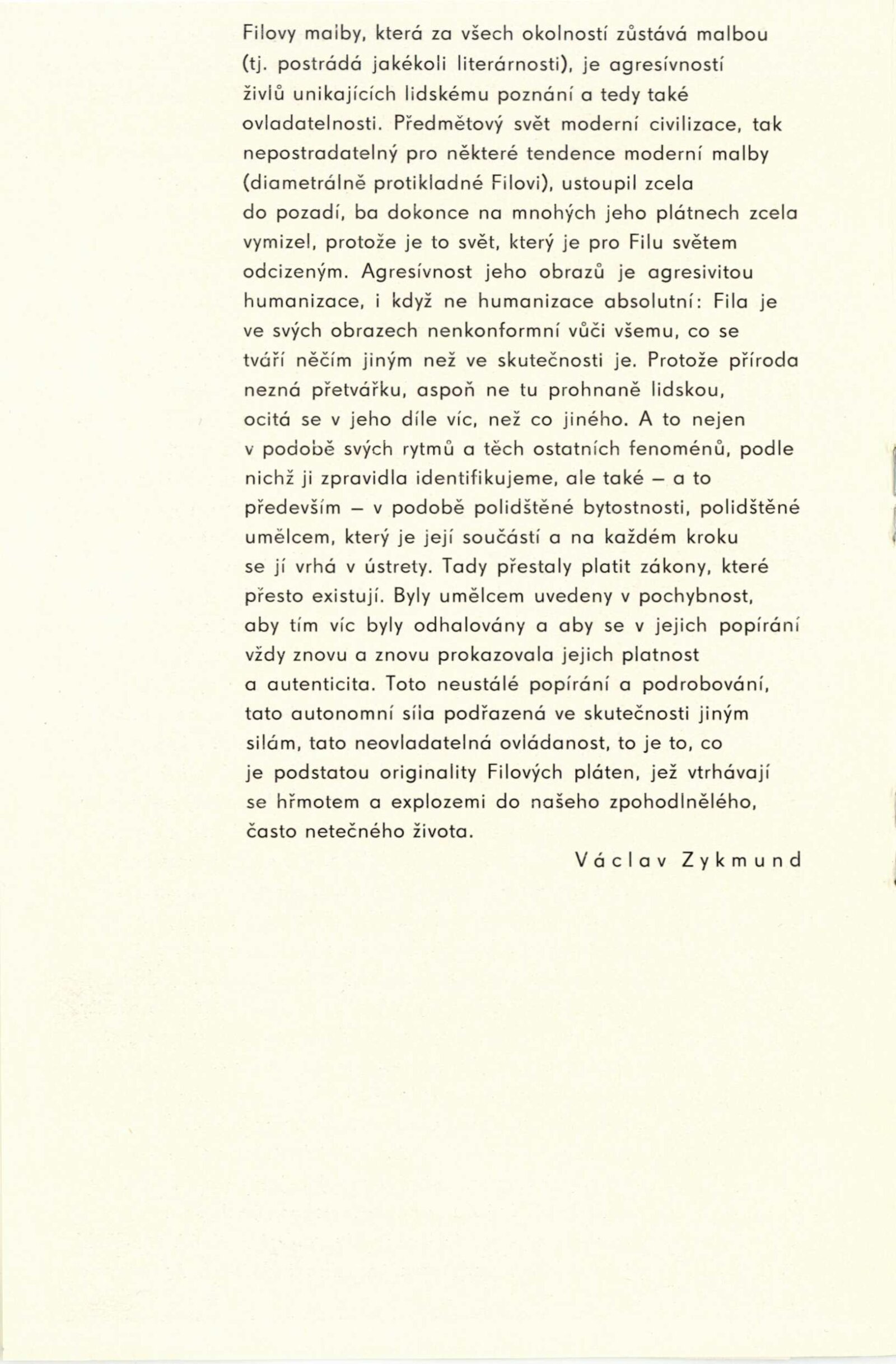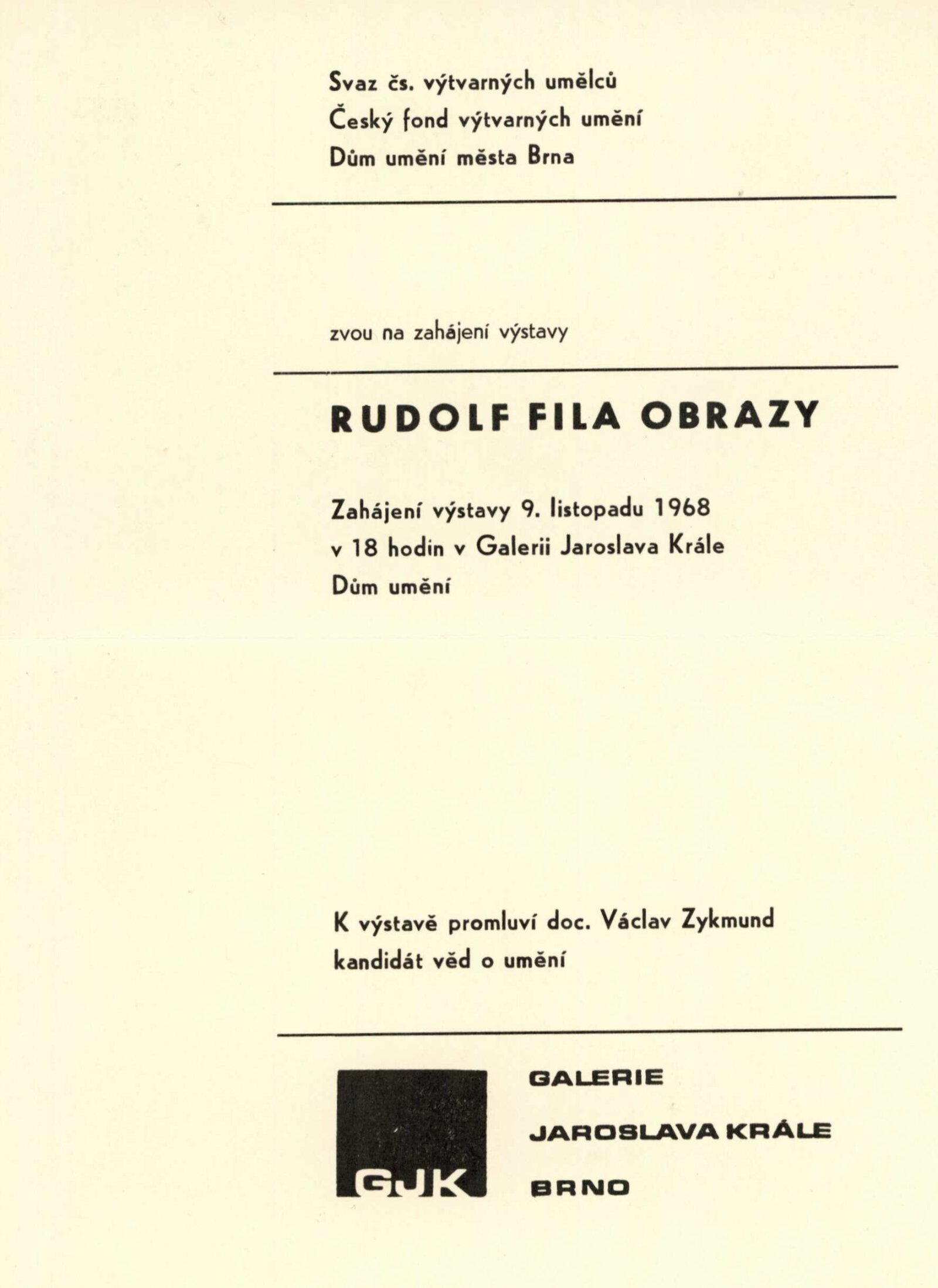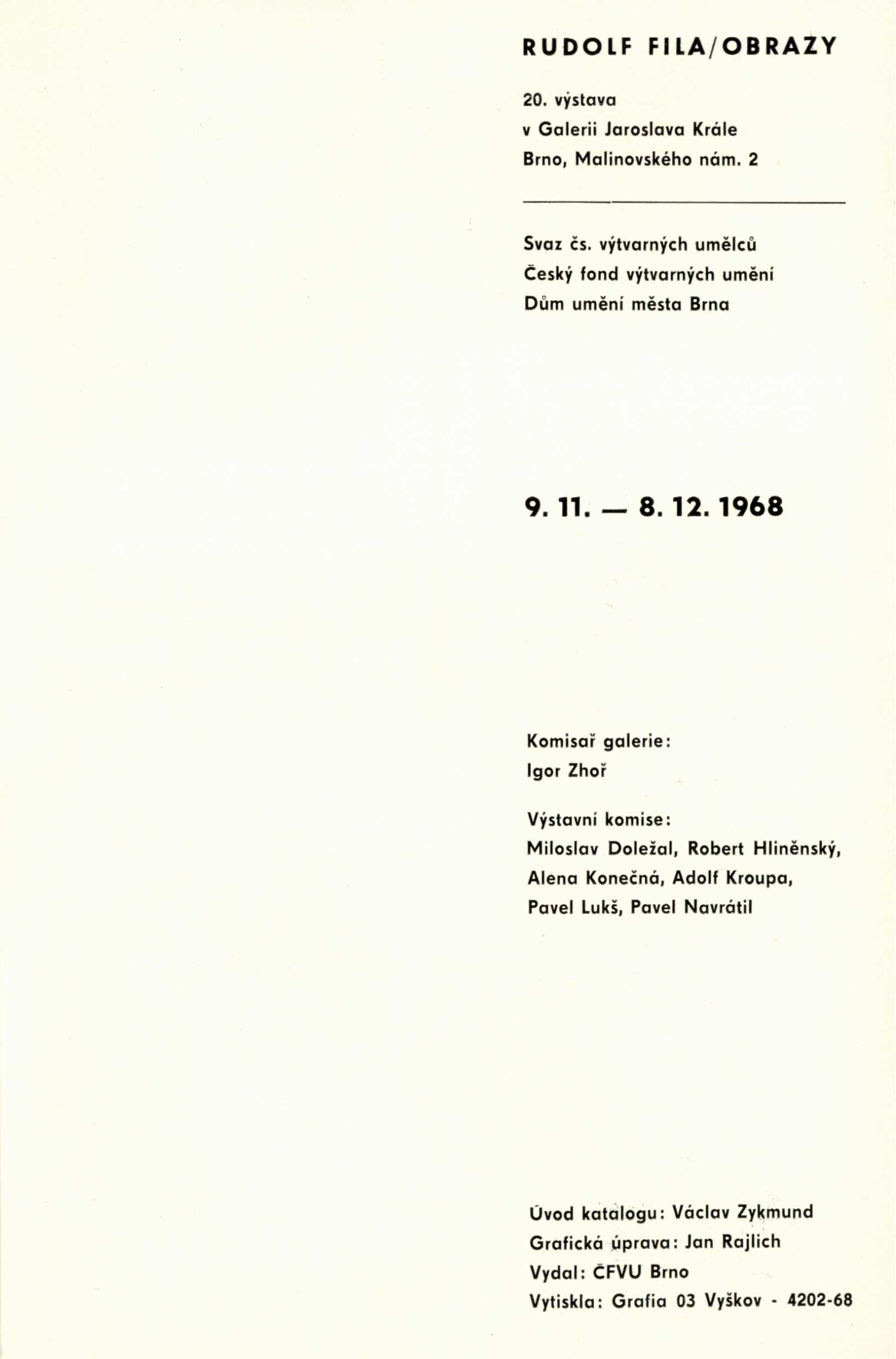 Rudolf Fila. Obrazy: Dům umění, 20. výstava v Galerii Jaroslava Krále, Brno 3. 11. – 30. 11. 1968 / Text: Václav Zykmund. – Brno: ČFVU, 1968. – 10 s., obr., portrét, životní data, DU 510. – MG; MMB