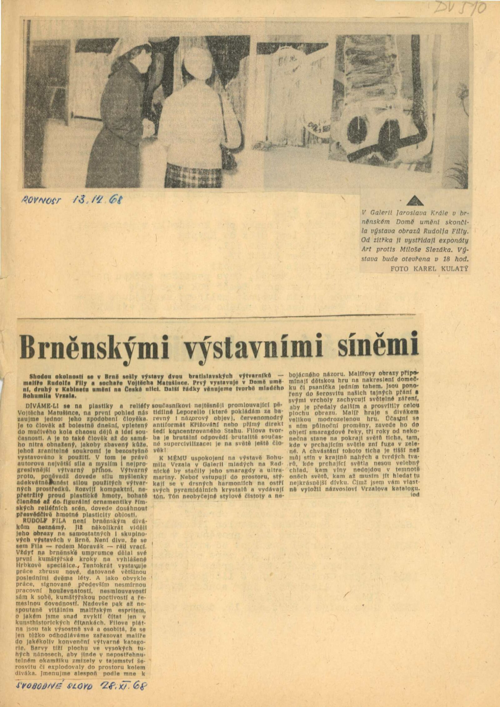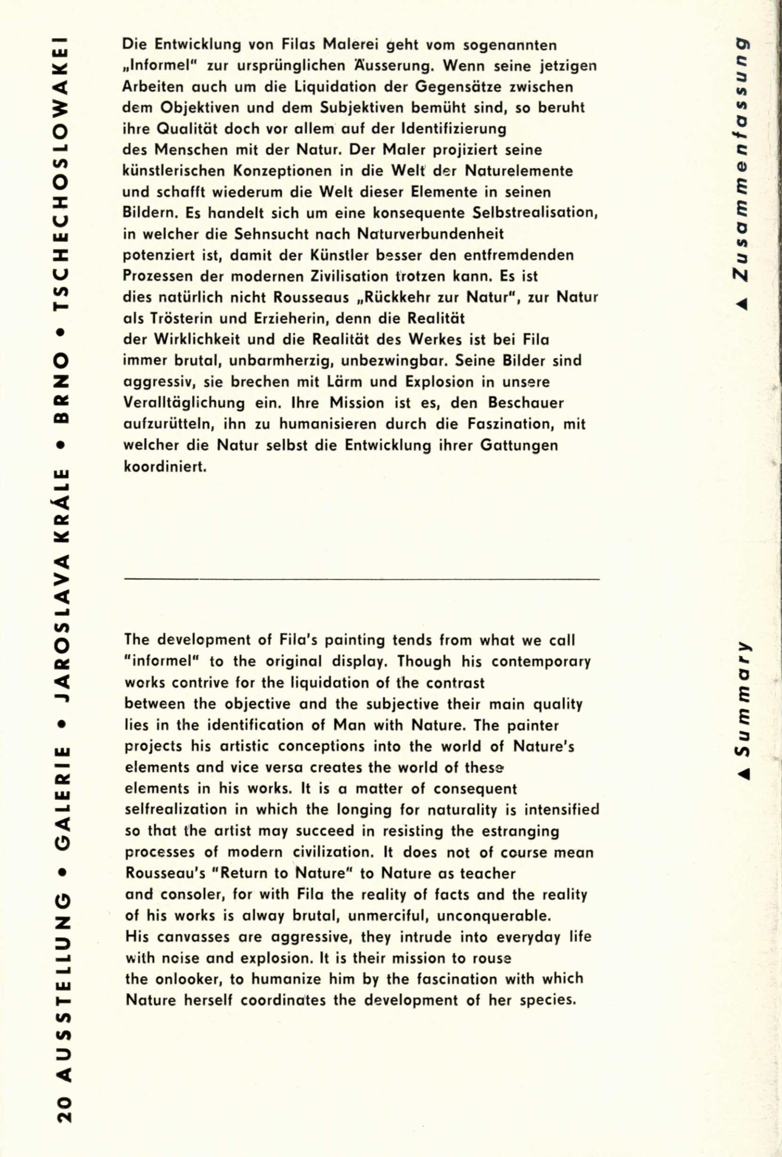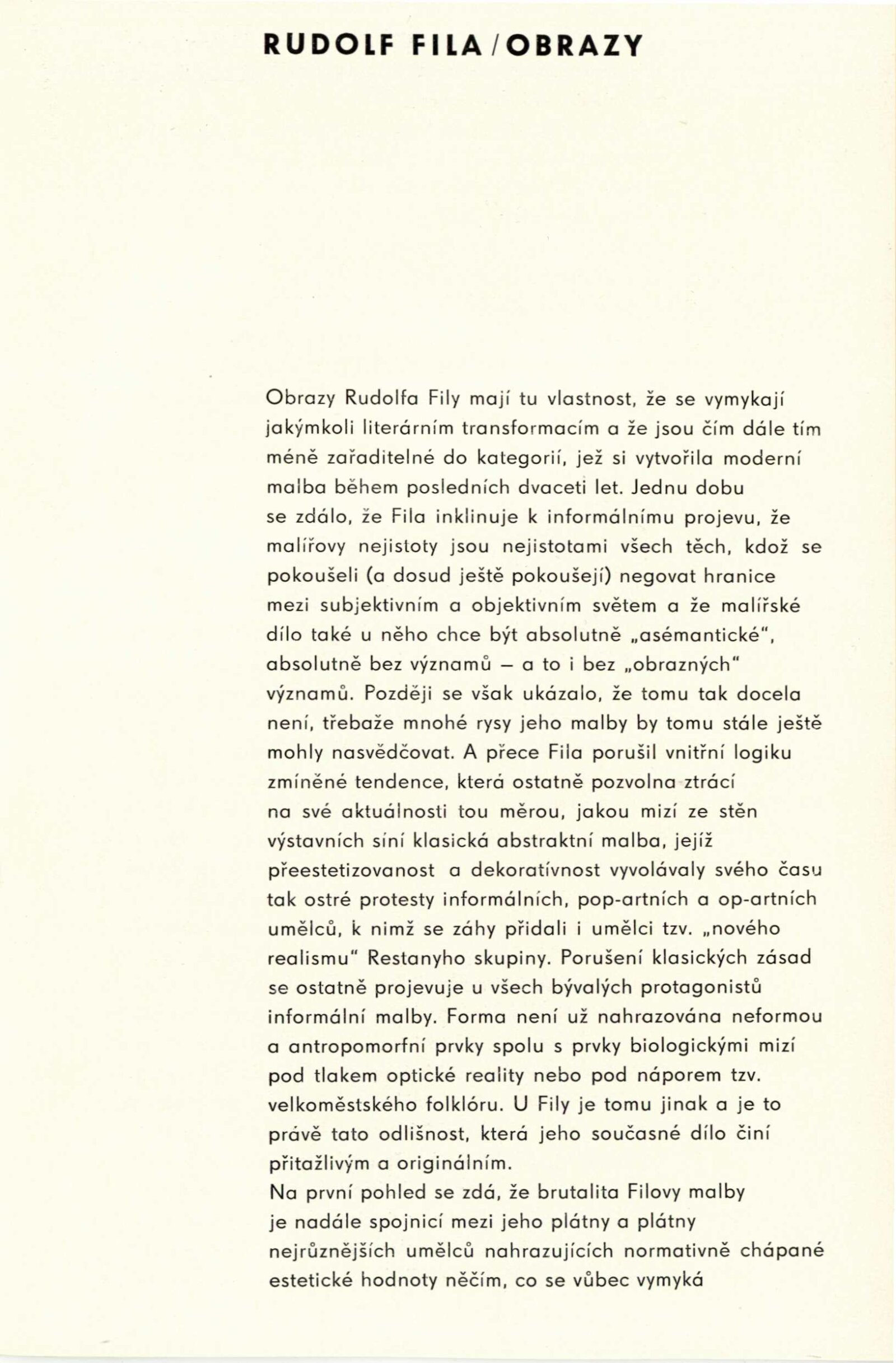 Rudolf Fila. Obrazy: Dům umění, 20. výstava v Galerii Jaroslava Krále, Brno 3. 11. – 30. 11. 1968 / Text: Václav Zykmund. – Brno: ČFVU, 1968. – 10 s., obr., portrét, životní data, DU 510. – MG; MMB