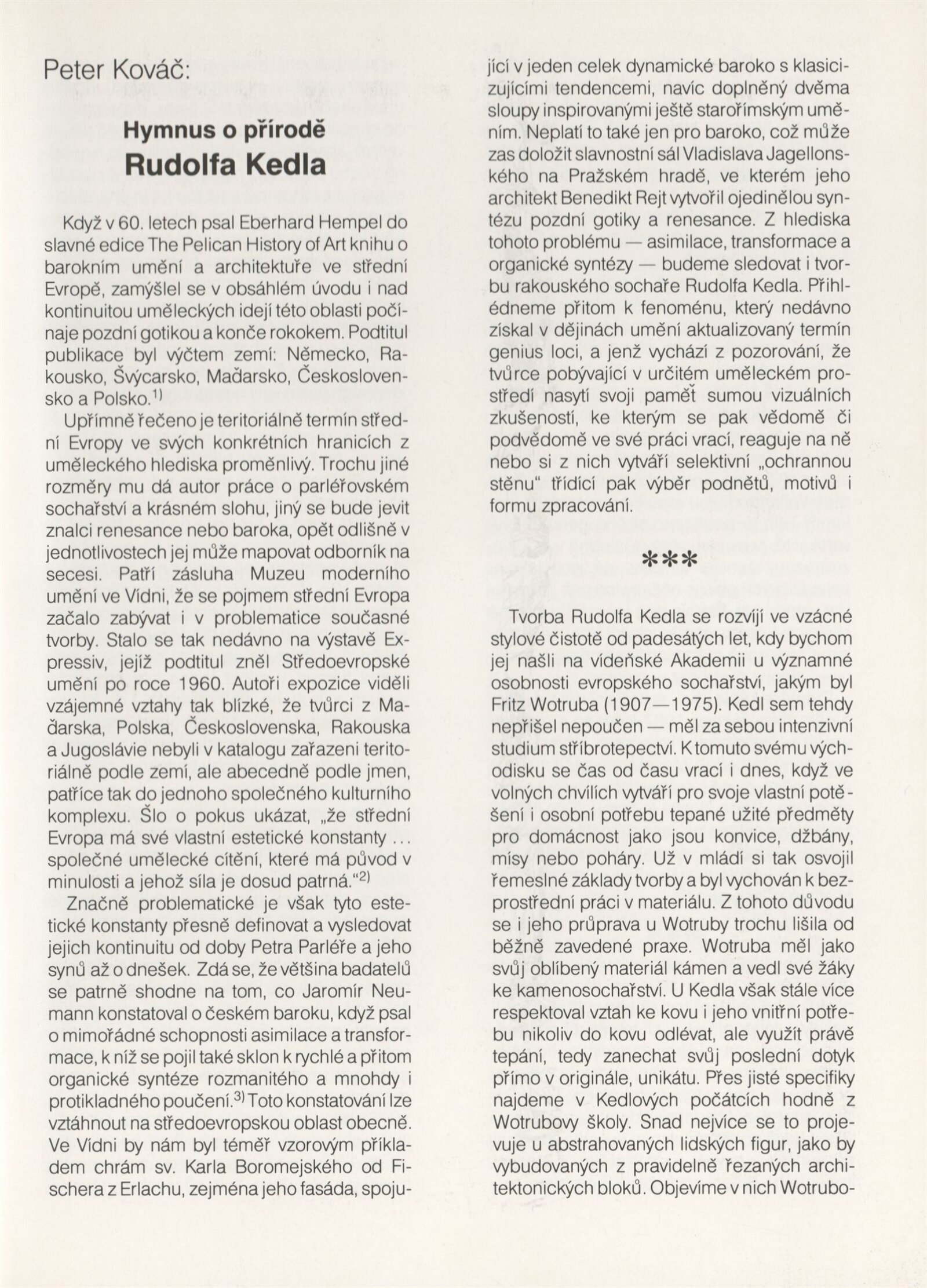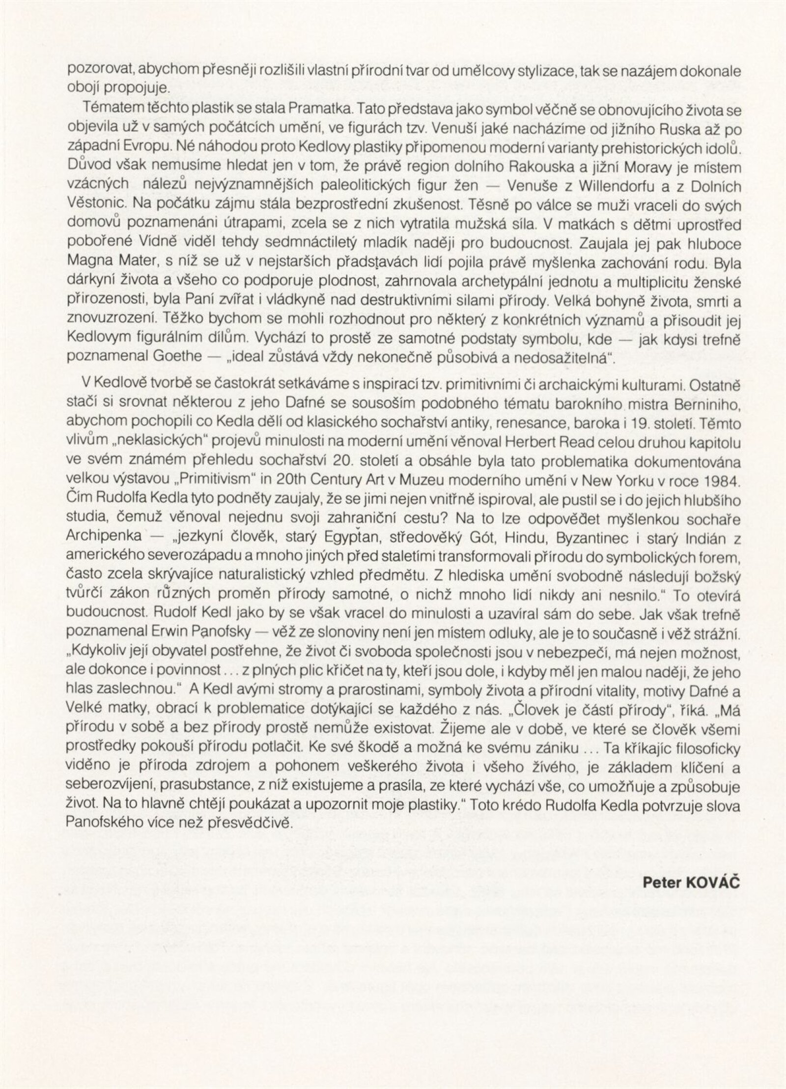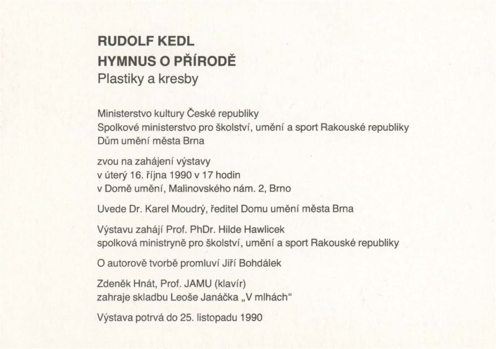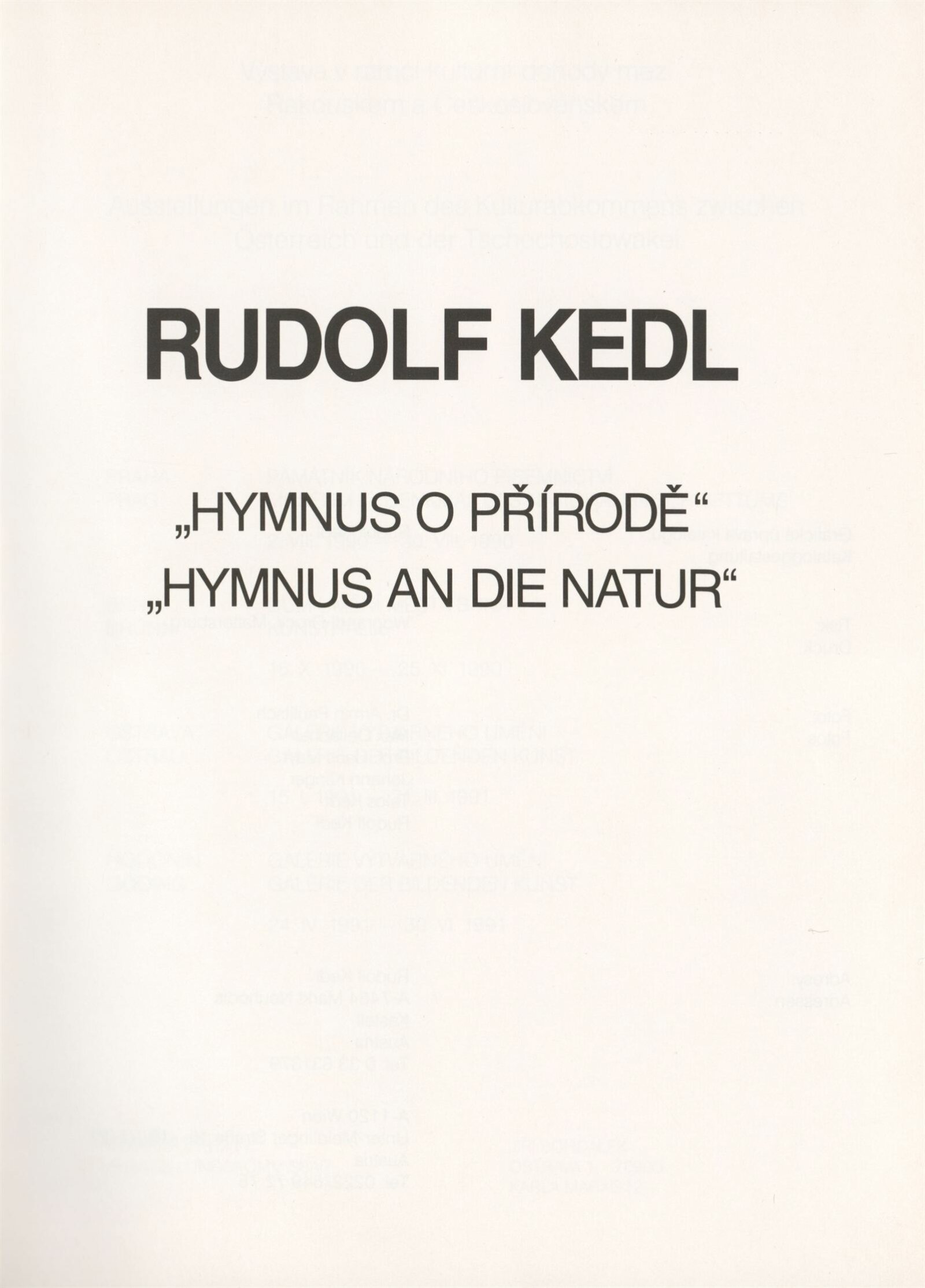 Rudolf Kedl. Hymnus o přírodě. Pastiky a kresby: Dům umění města Brna, Galerie Jaroslava Krále, hala, 16. 10. 1990 – 25. 11. 1990 / Text: Peter Kováč. – B. m. n., 1990. – [30] s., 99 s. obr. příl., [8] s., současně vydána skládačka Rudolf Kedl s textem Petra Kováče o 8 s., DU 888. – MG