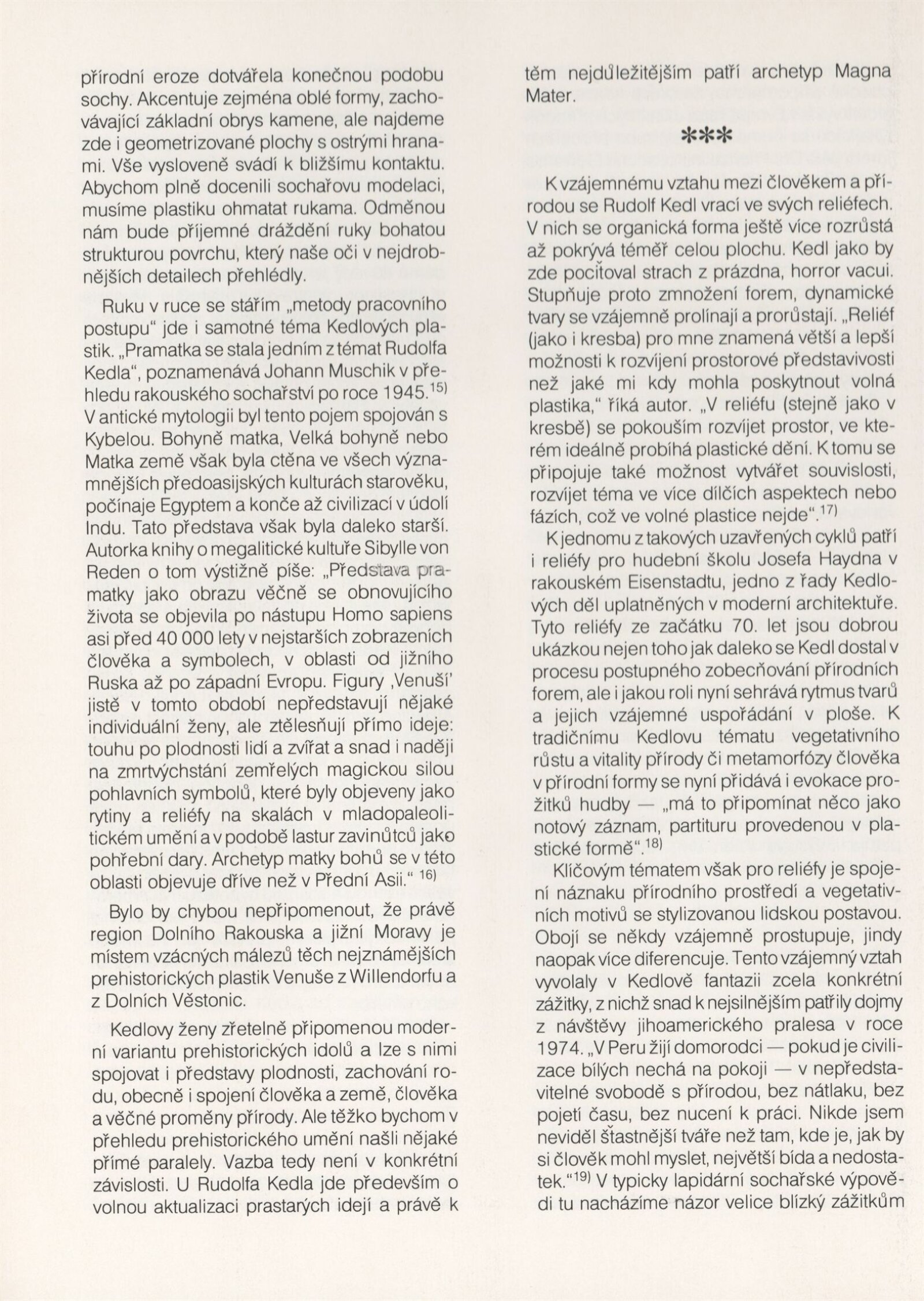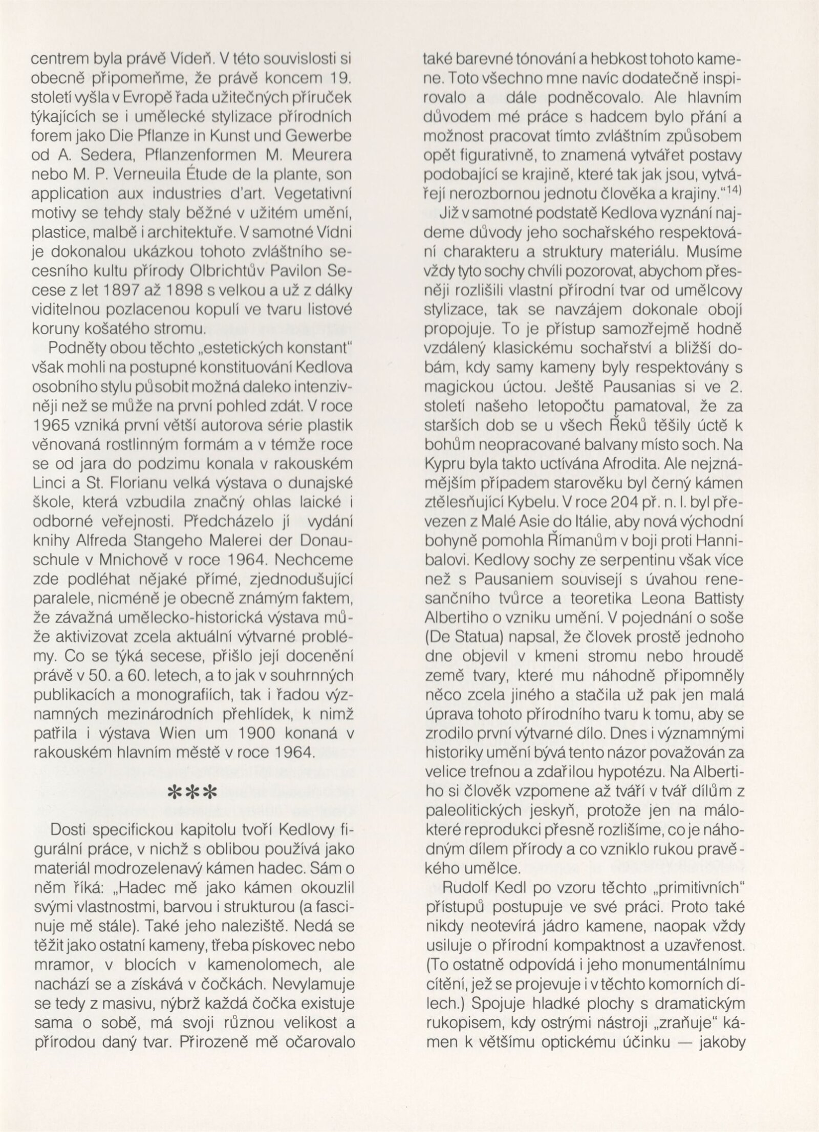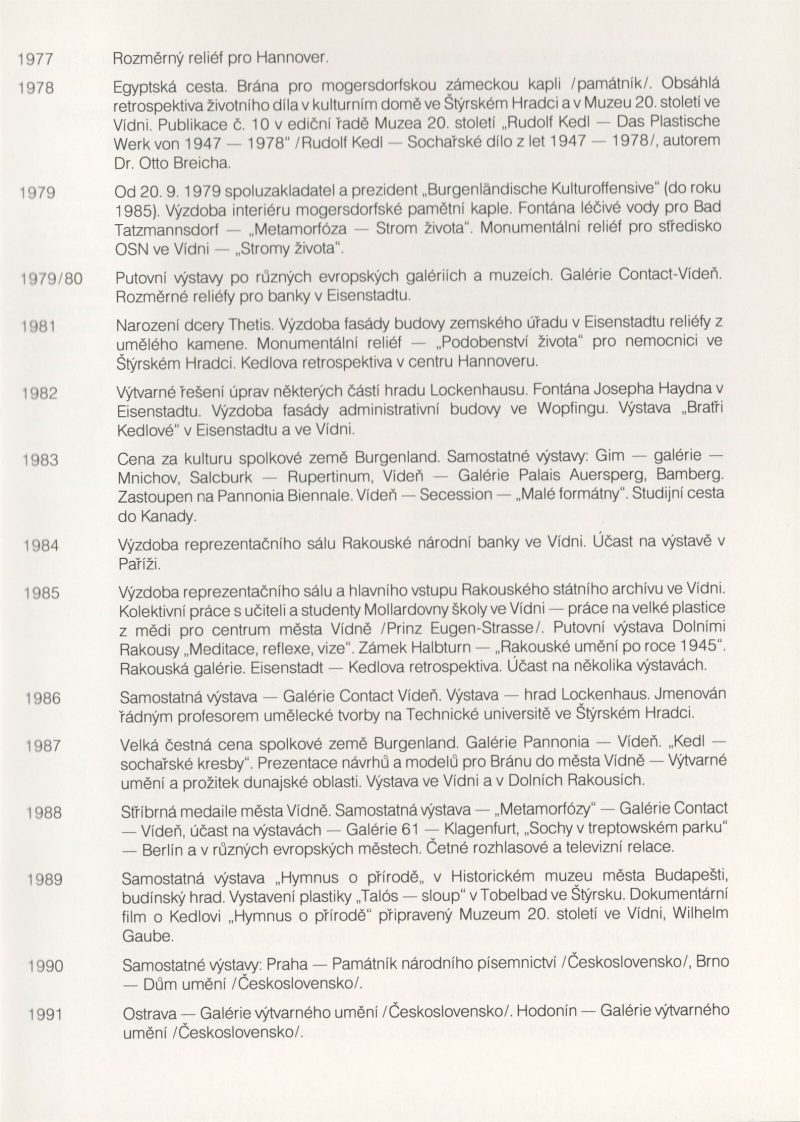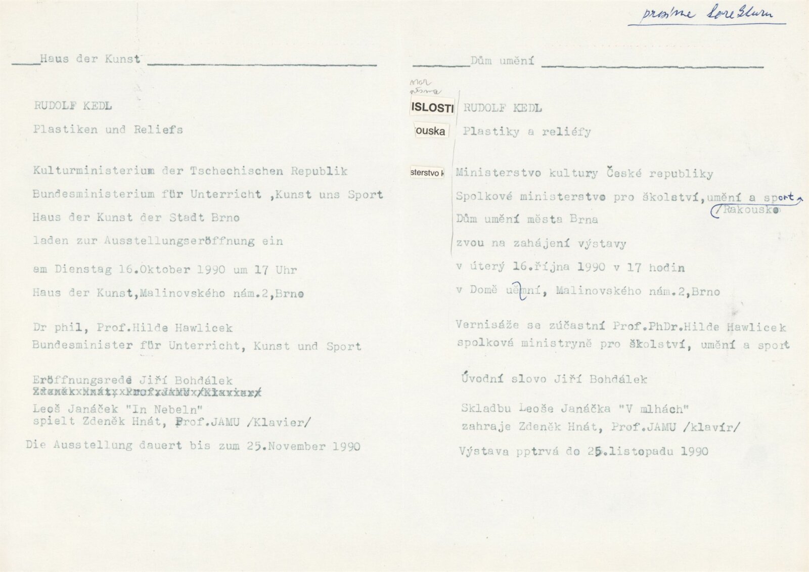Rudolf Kedl. Hymnus o přírodě. Pastiky a kresby: Dům umění města Brna, Galerie Jaroslava Krále, hala, 16. 10. 1990 – 25. 11. 1990 / Text: Peter Kováč. – B. m. n., 1990. – [30] s., 99 s. obr. příl., [8] s., současně vydána skládačka Rudolf Kedl s textem Petra Kováče o 8 s., DU 888. – MG