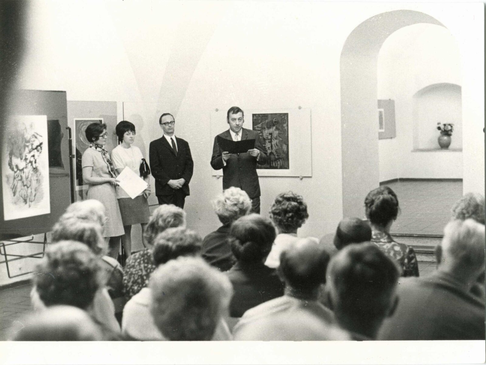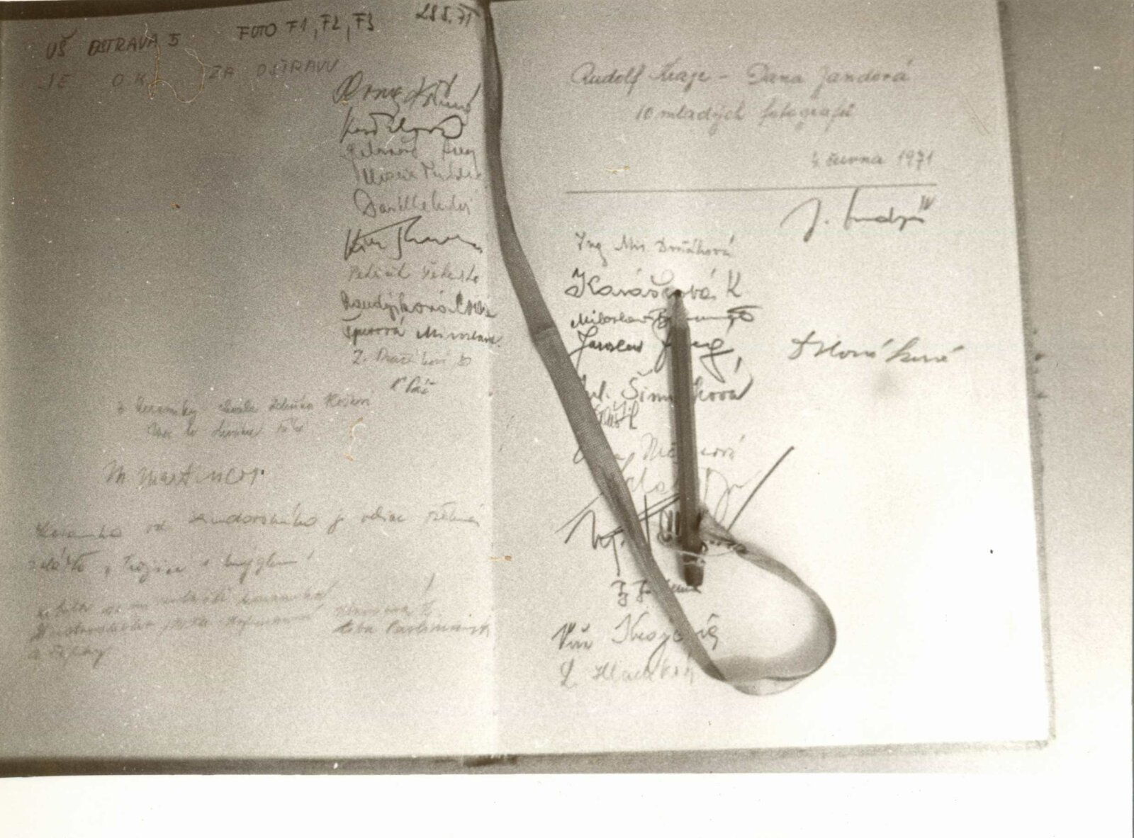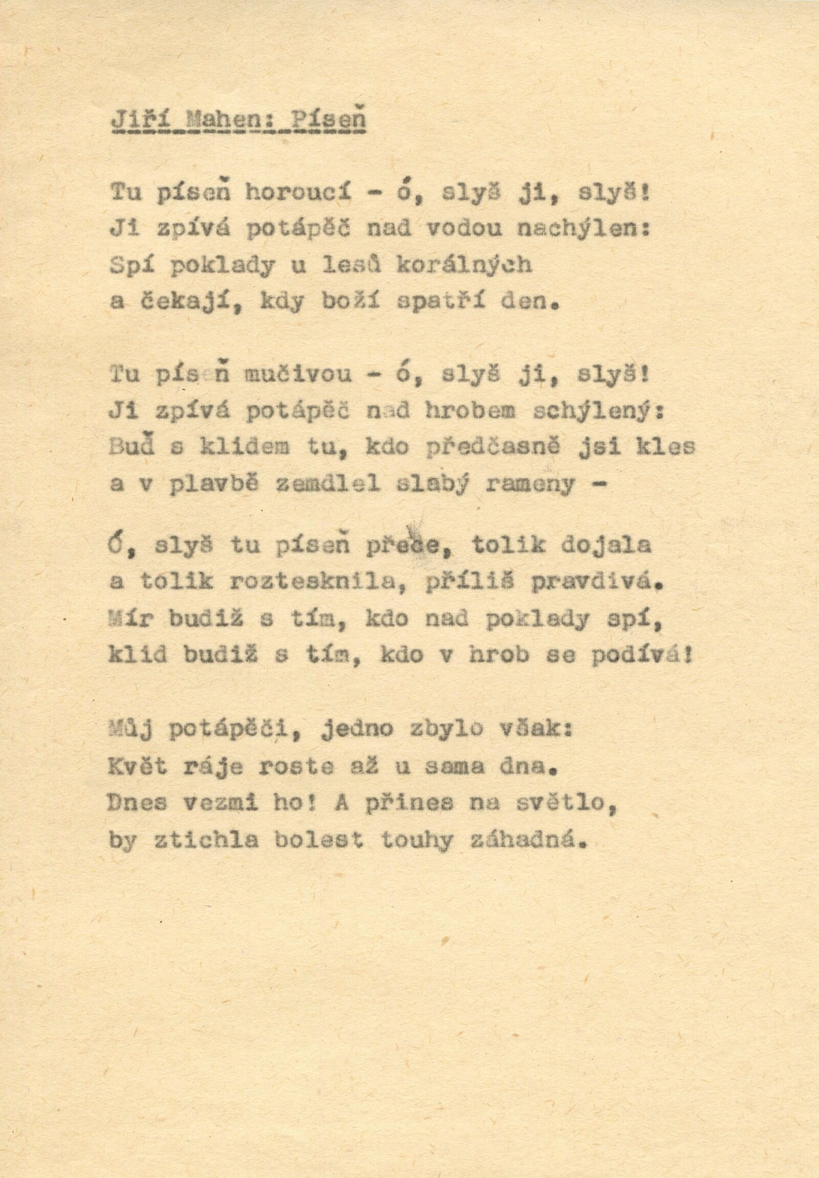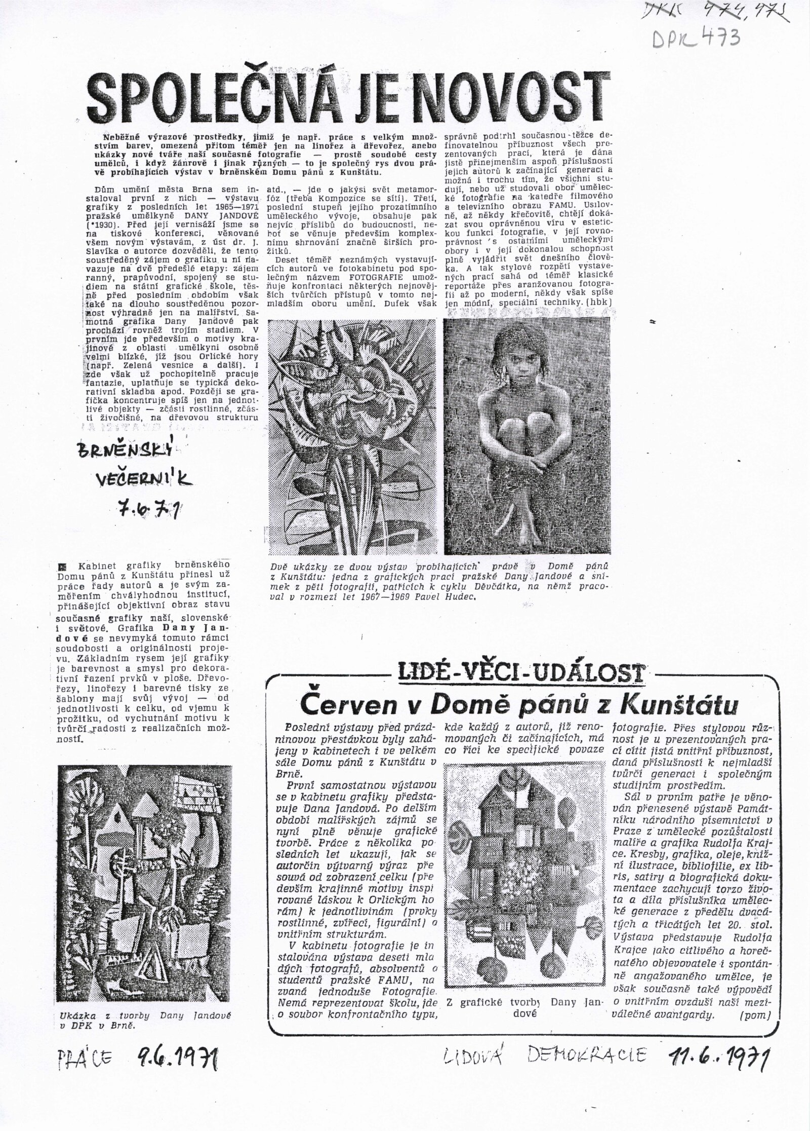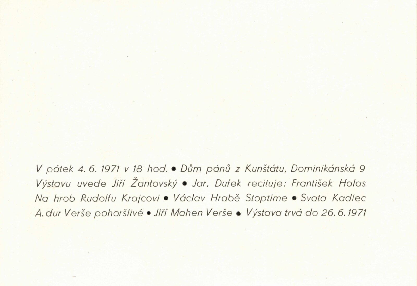 pozvánka, fotografie vernisáže, pozvánka na tiskovou konferenci, adresy zvaných, seznam vystavených děl, korespondence (návrh realizace výstavy, strojopis básní Františka Halase, Václava Hraběte a Jiřího Mahena, dopis Karly Mahenové s přiloženou dosud nepublikovanou básní Jiřího Mahena), provozní korespondence, žádost o povolení výstavy, pozvánka (PNP Praha), pozvánka na tiskovou konferece (PNP Praha), katalog (PNP Praha), program vernisáže (PNP Praha), recenze v tisk