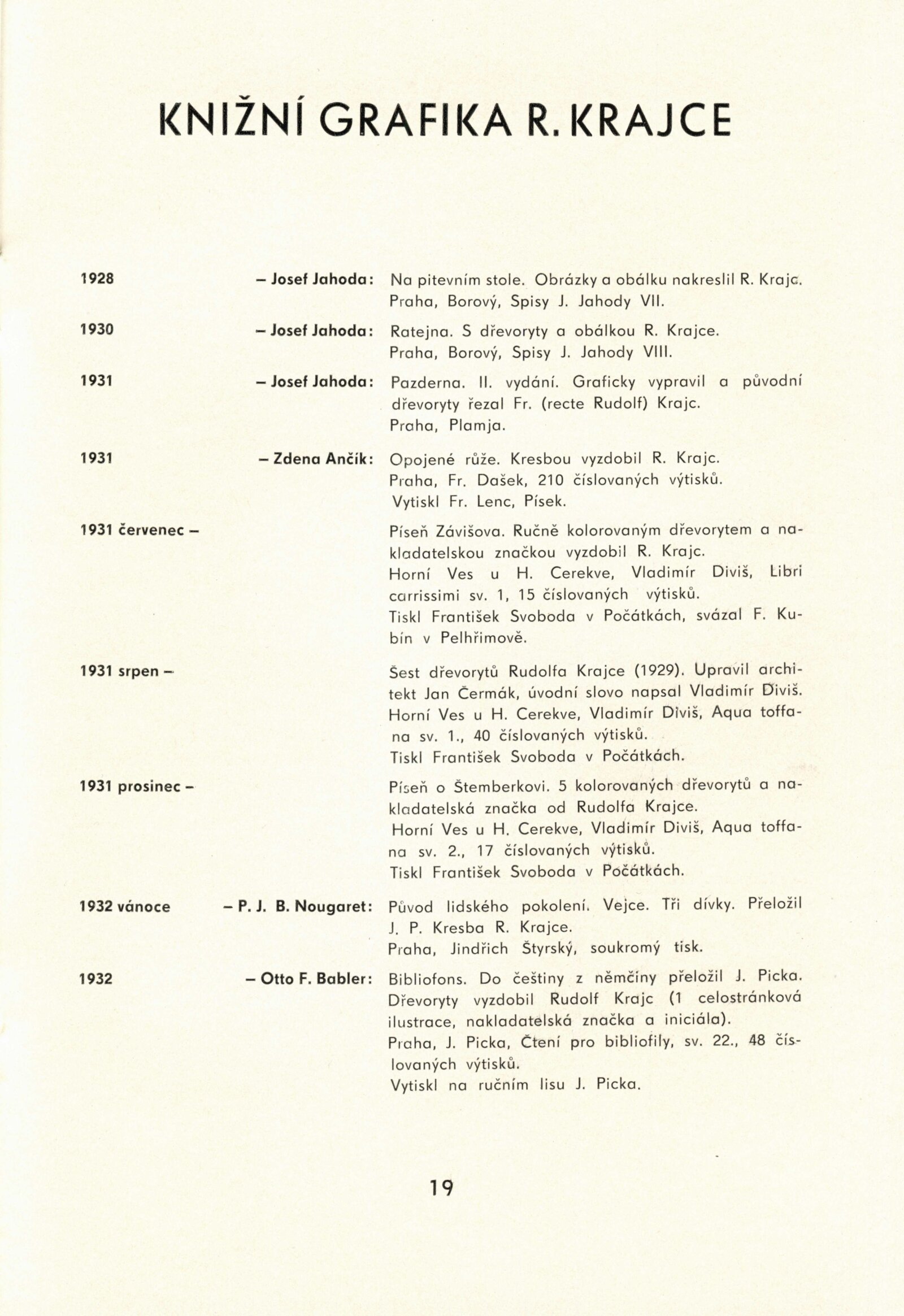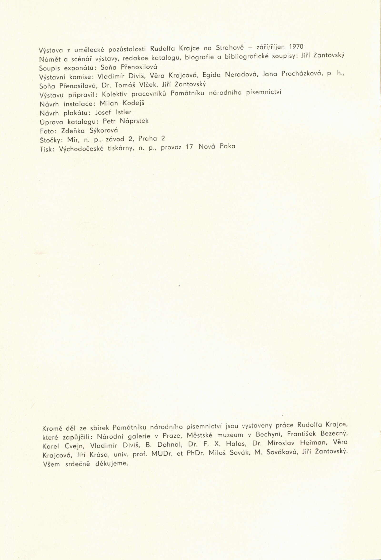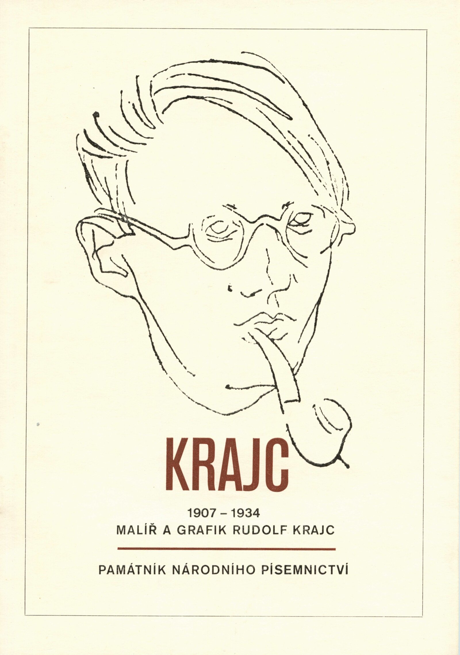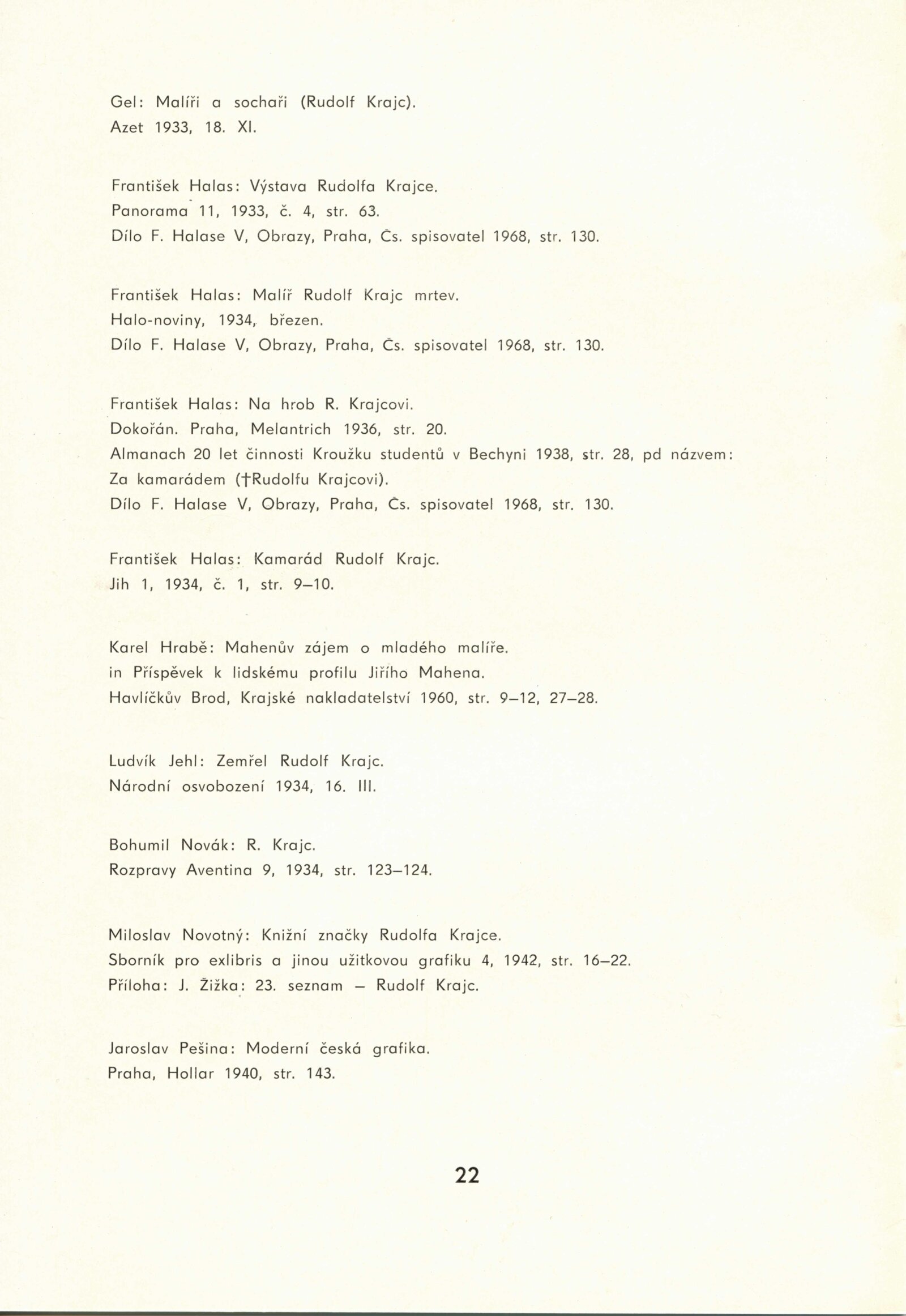 Rudolf Krajc 1907–1934. Umělecká pozůstalost. Kresby, grafika, oleje, knižní ilustrace, bibliofilie, exlibris, satira, biografická dokumentace: Dům umění města Brna / Dům pánů z Kunštátu, 4. 6. – 26. 6. 1971 / Převzatý katalog. Rudolf Krajc 1907–1934. Vzpomínka na malíře a grafika, kamaráda generace třicátých let: Strahov, Praha, září–říjen 1970 / Texty: František Halas, Jiří Žantovský, Vladimír Diviš. – Praha-Strahov: Památník národního písemnictví, 1970. – 24 s., 47 s. obr. příl., portrét, životní data, soupis knižní grafiky, bibliografie, báseň Františka Halase, DPK 473. – MG