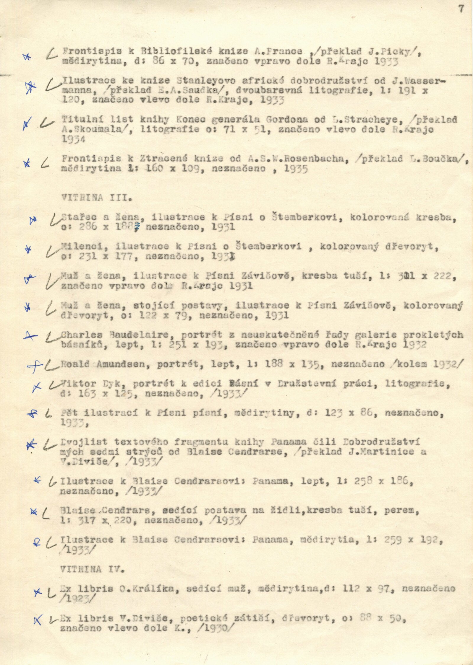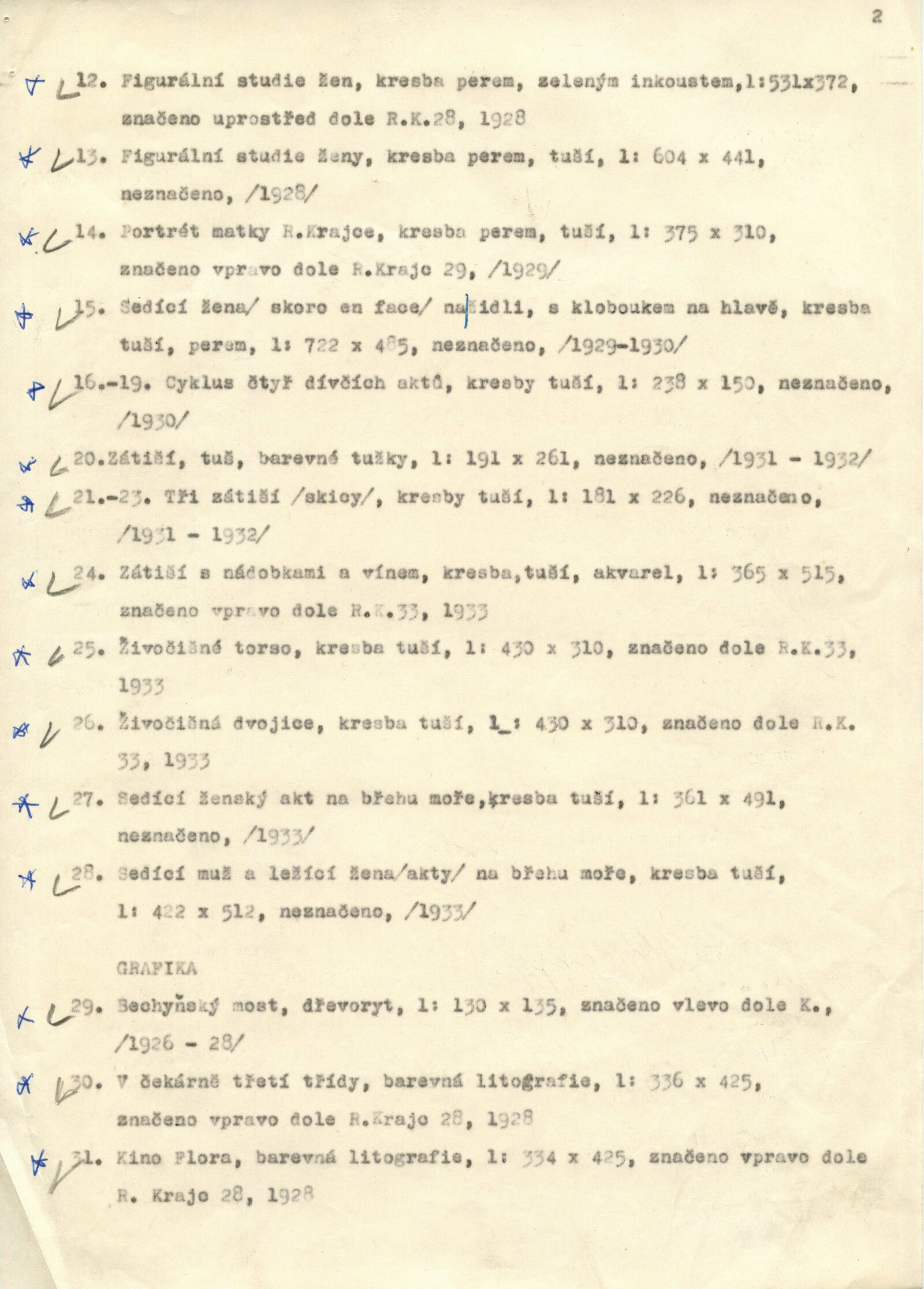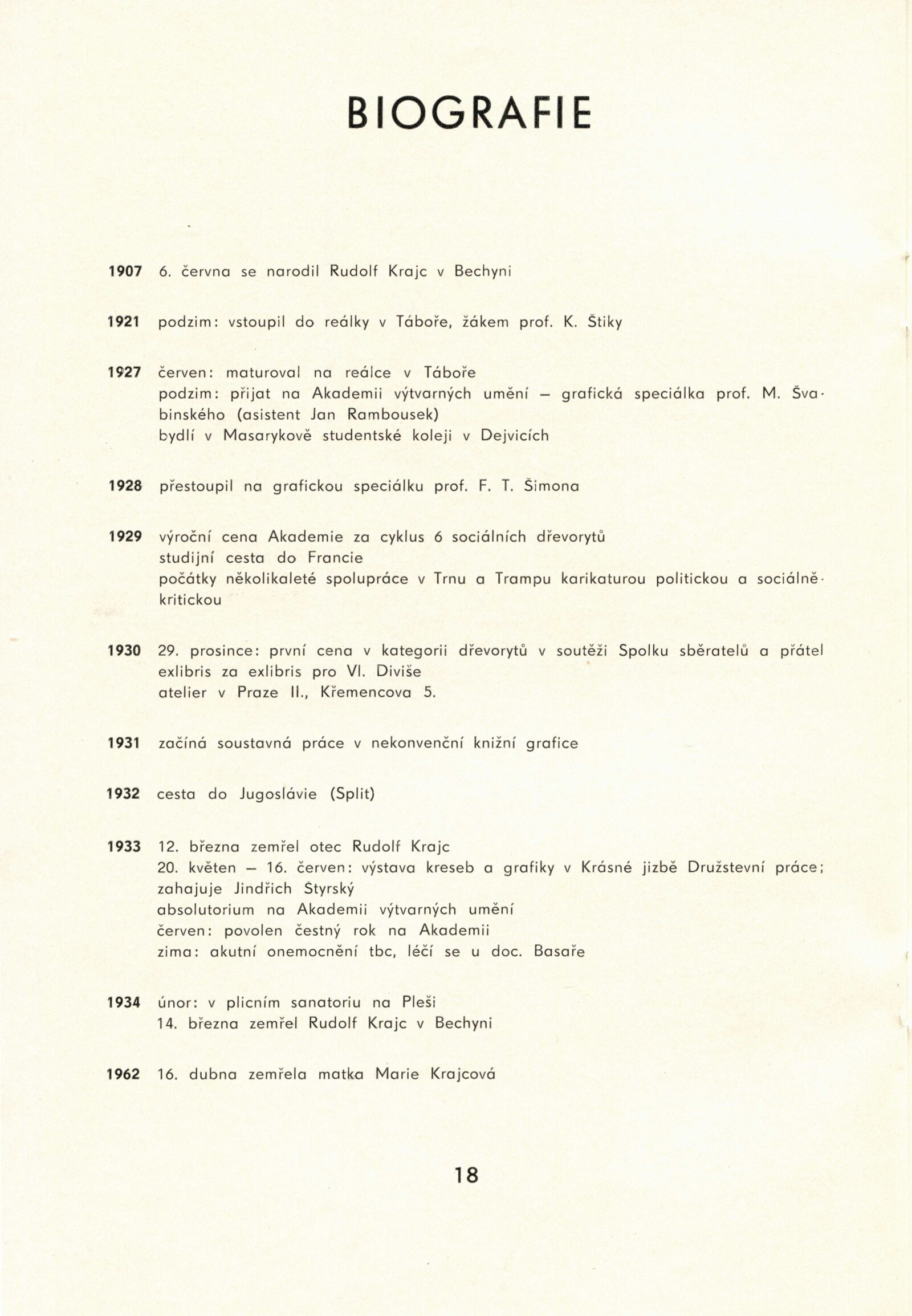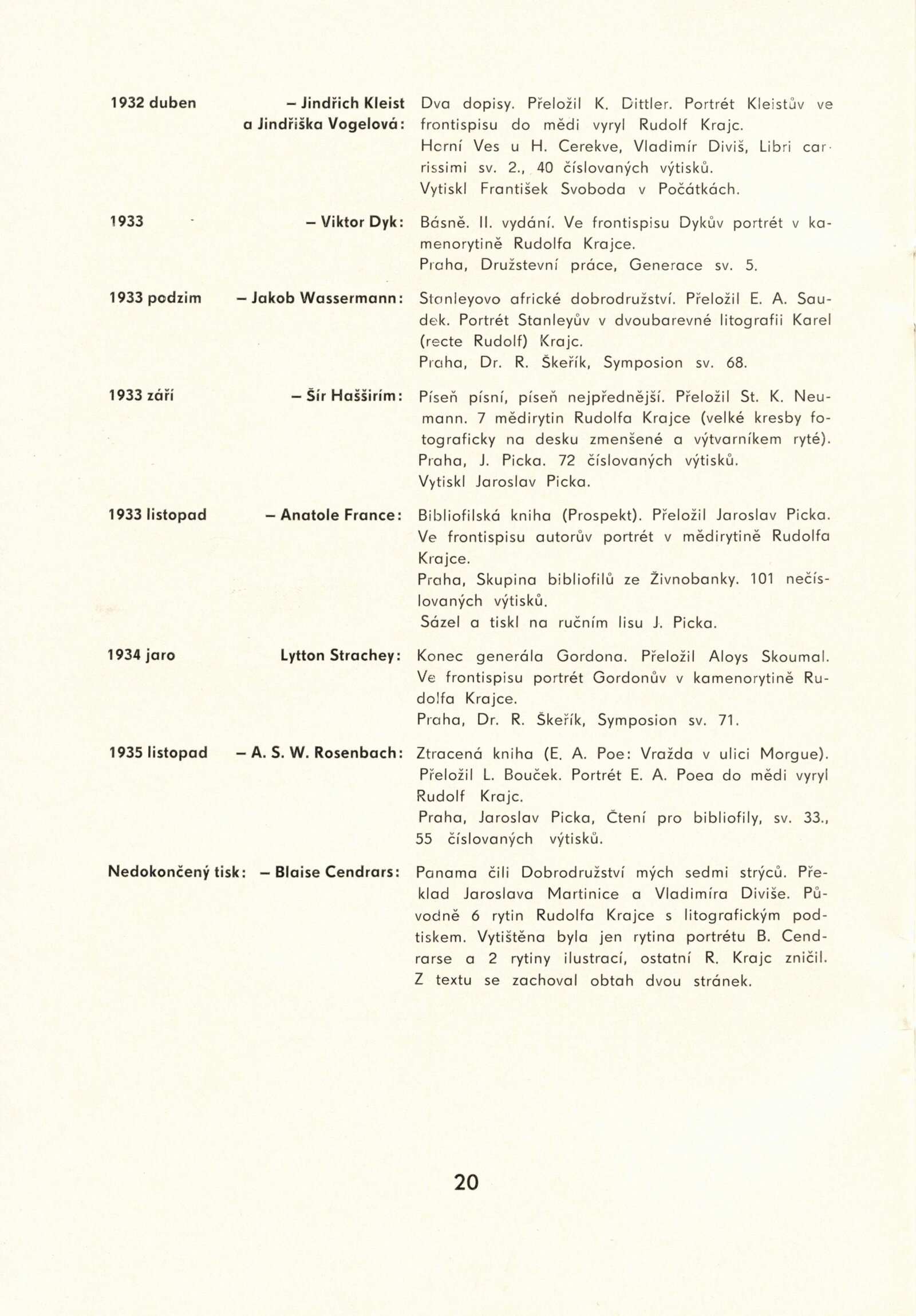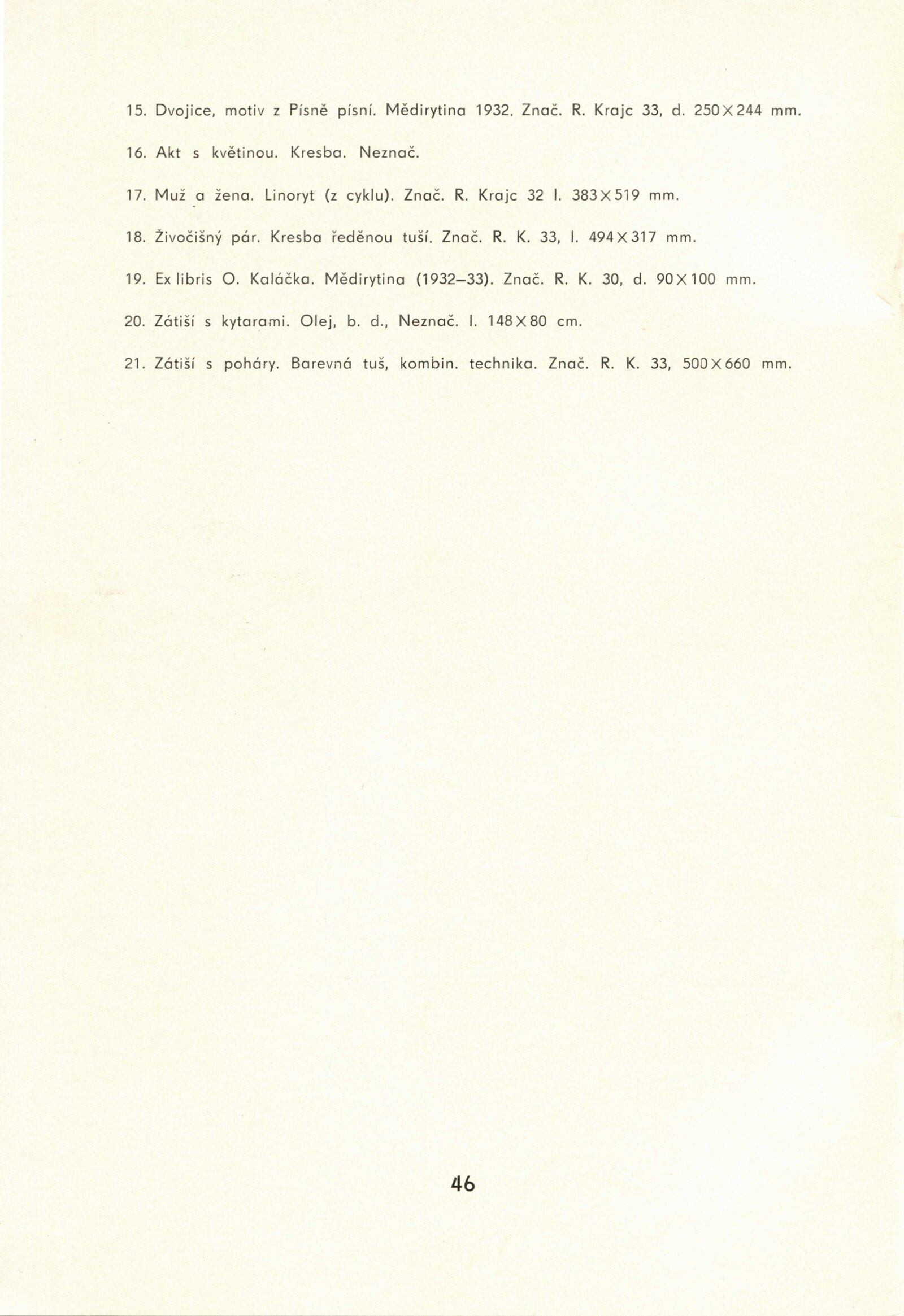 Rudolf Krajc 1907–1934. Umělecká pozůstalost. Kresby, grafika, oleje, knižní ilustrace, bibliofilie, exlibris, satira, biografická dokumentace: Dům umění města Brna / Dům pánů z Kunštátu, 4. 6. – 26. 6. 1971 / Převzatý katalog. Rudolf Krajc 1907–1934. Vzpomínka na malíře a grafika, kamaráda generace třicátých let: Strahov, Praha, září–říjen 1970 / Texty: František Halas, Jiří Žantovský, Vladimír Diviš. – Praha-Strahov: Památník národního písemnictví, 1970. – 24 s., 47 s. obr. příl., portrét, životní data, soupis knižní grafiky, bibliografie, báseň Františka Halase, DPK 473. – MG
