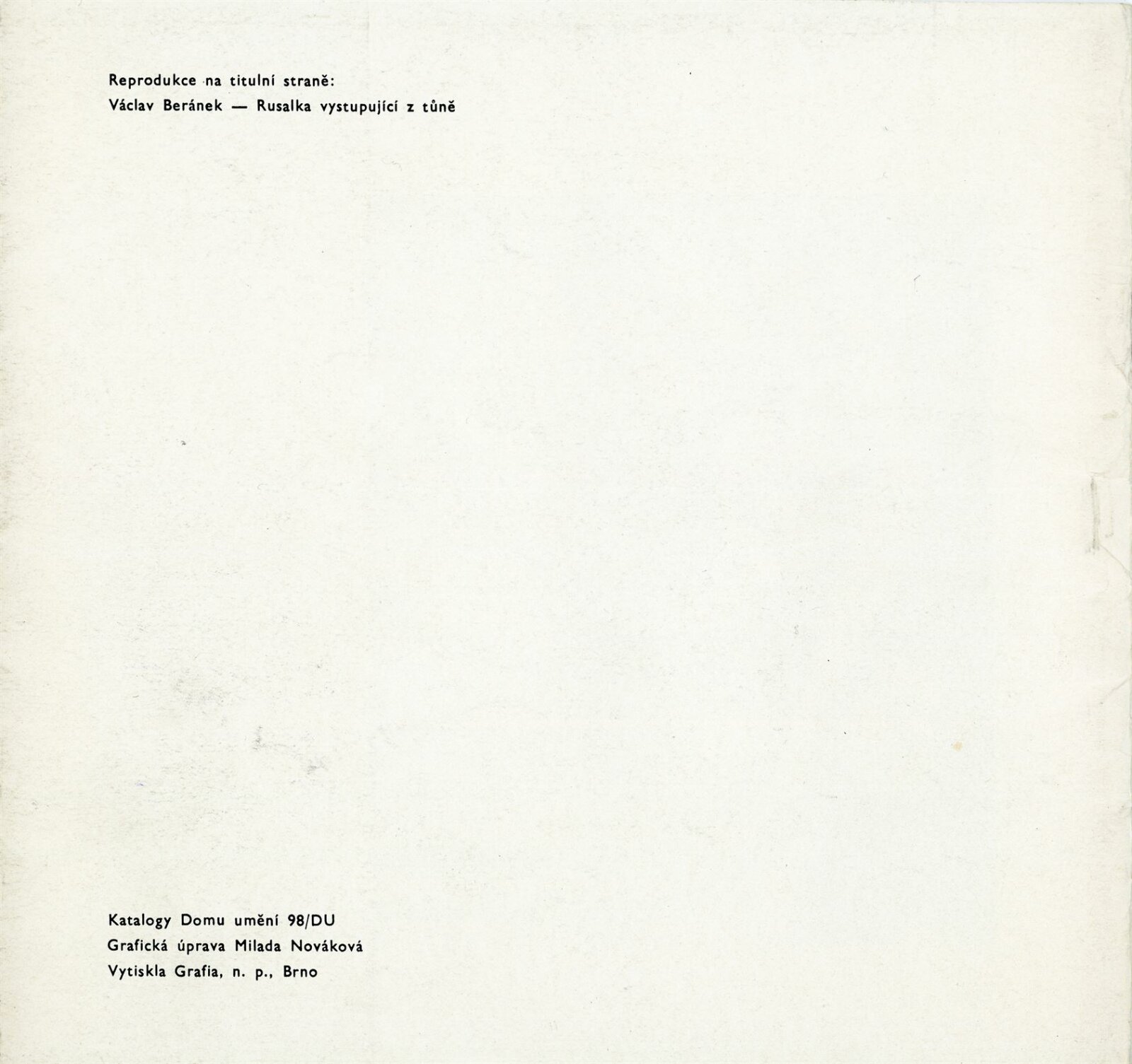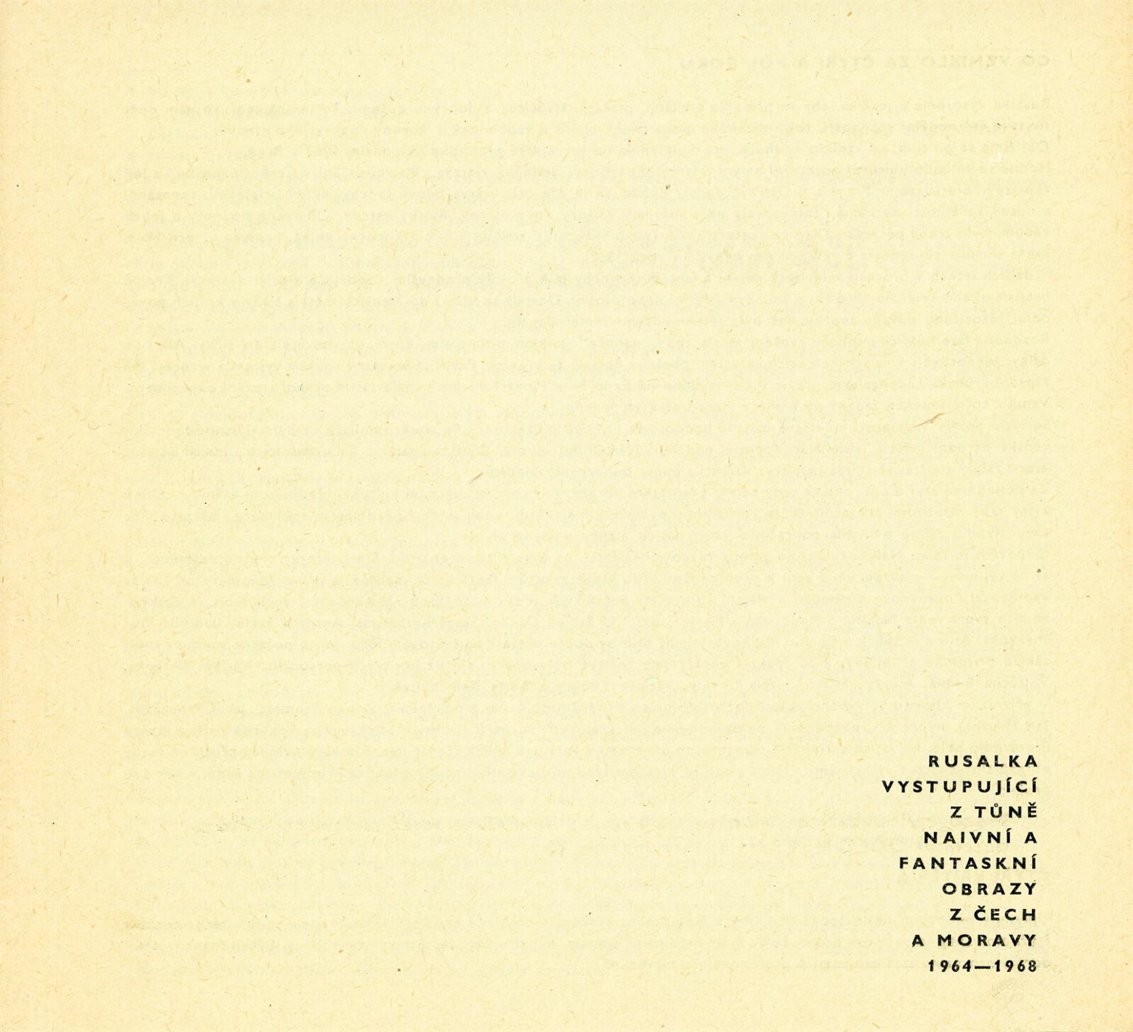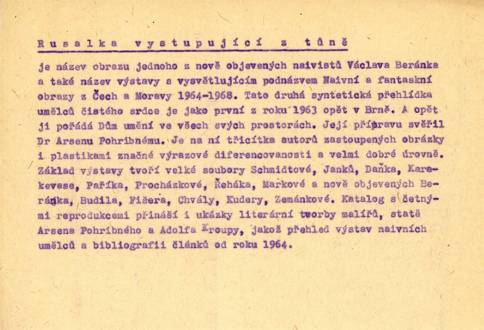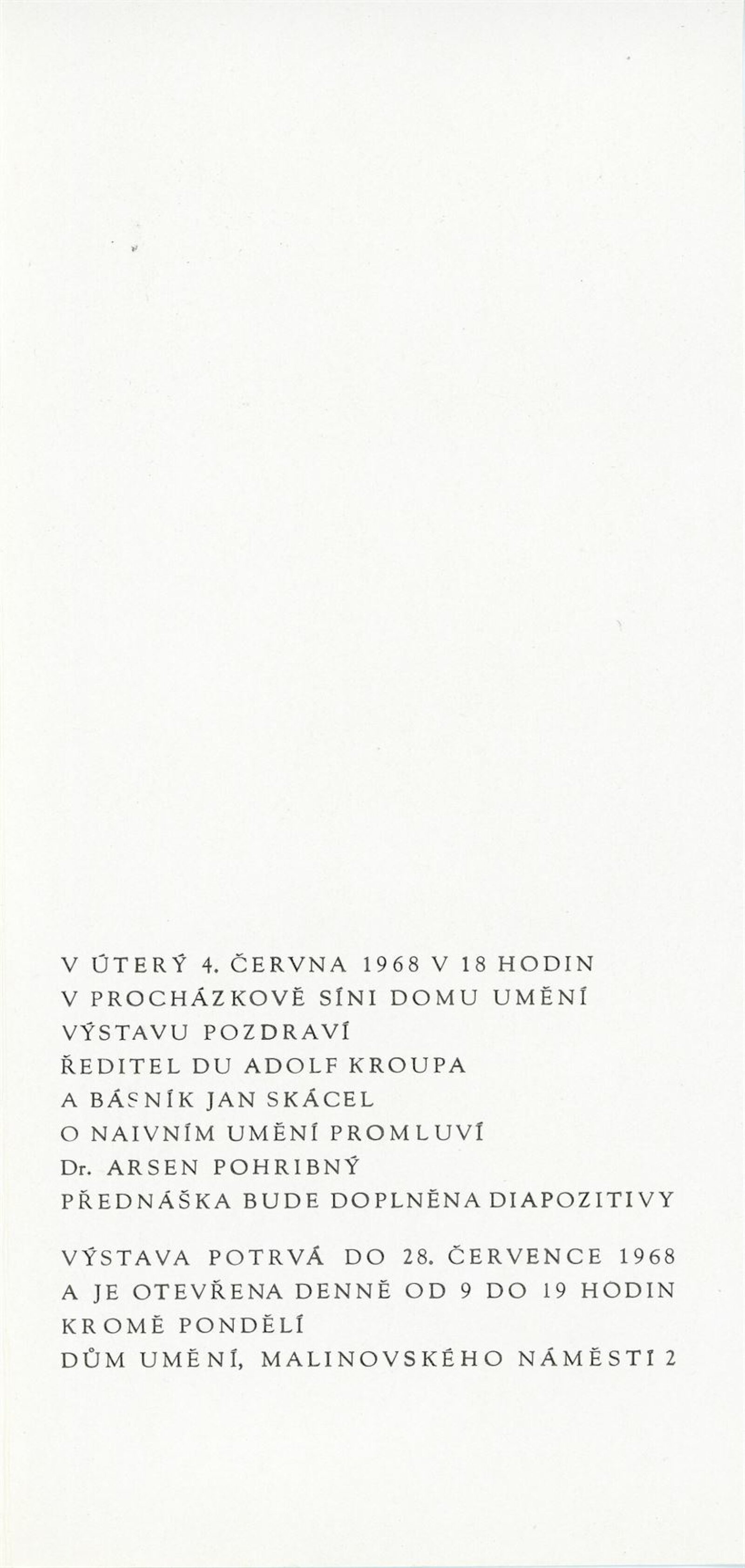 Rusalka vystupující z tůně. Naivní a fantaskní obrazy z Čech a Moravy 1964–1968: Dům umění města Brna, 4. 6. – 28. 7. 1968 / Text: Arsén Pohribný. – Brno: DUmB, 1968. – 34 s., obr., seznam výstav naivního umění 1964–1968, bibliografie od roku 1964, DU 506. – MZK; MG