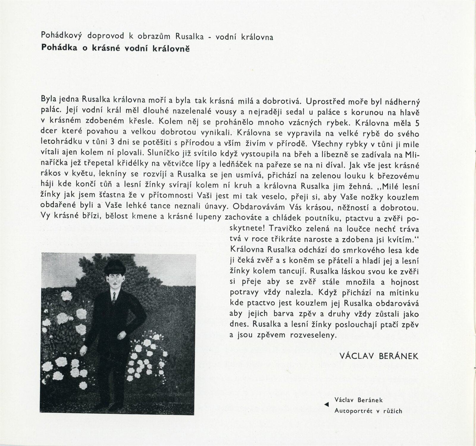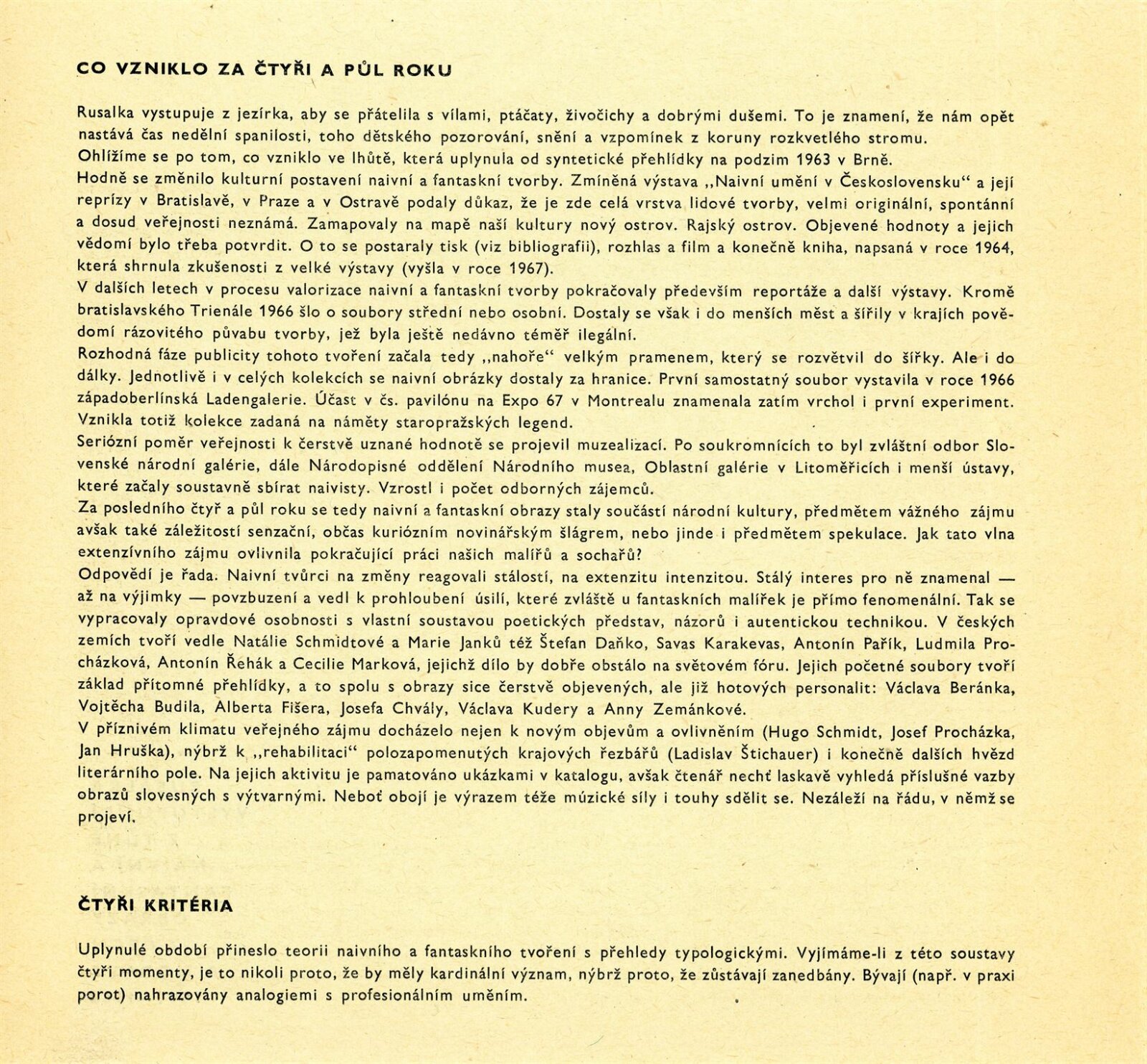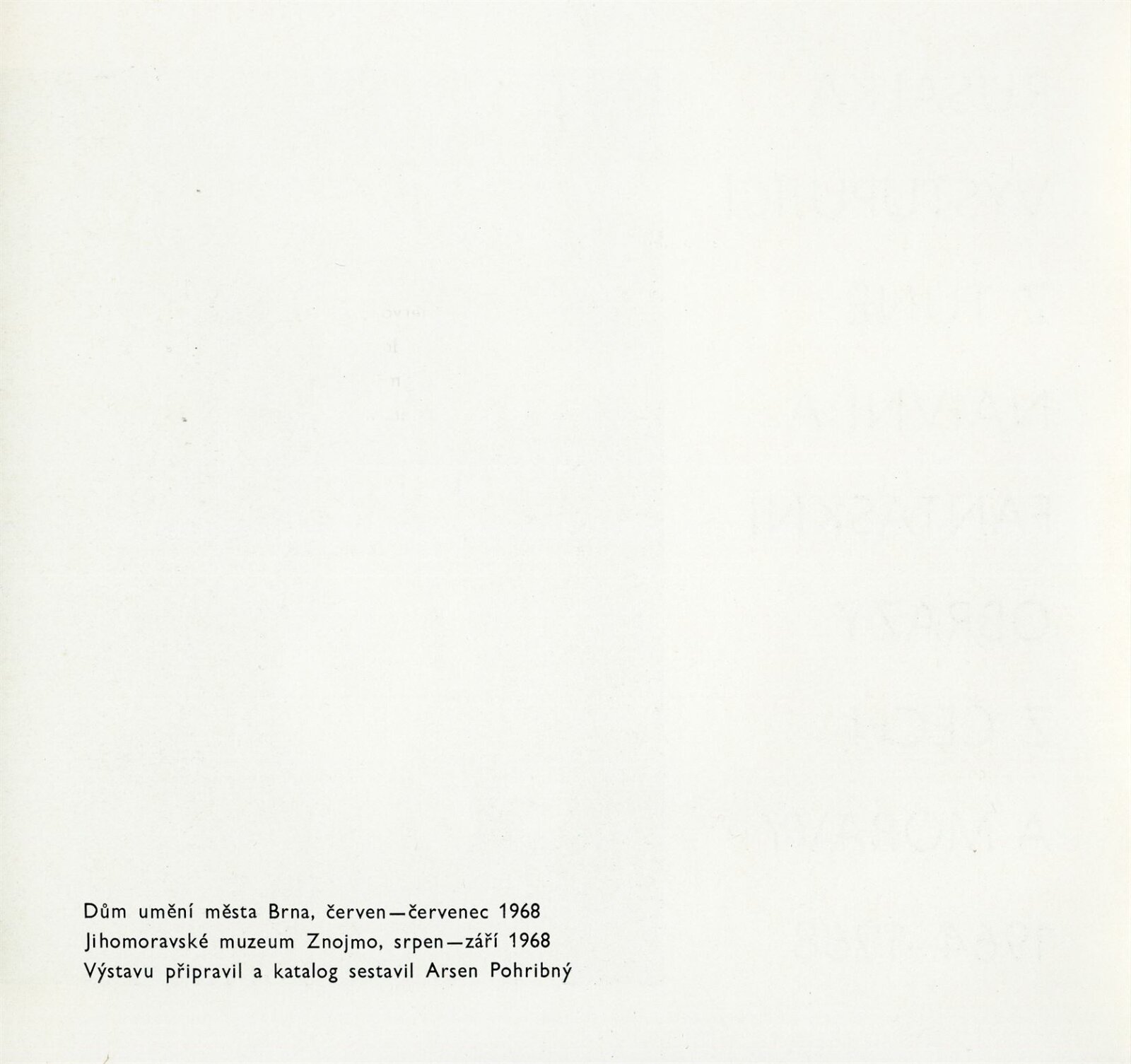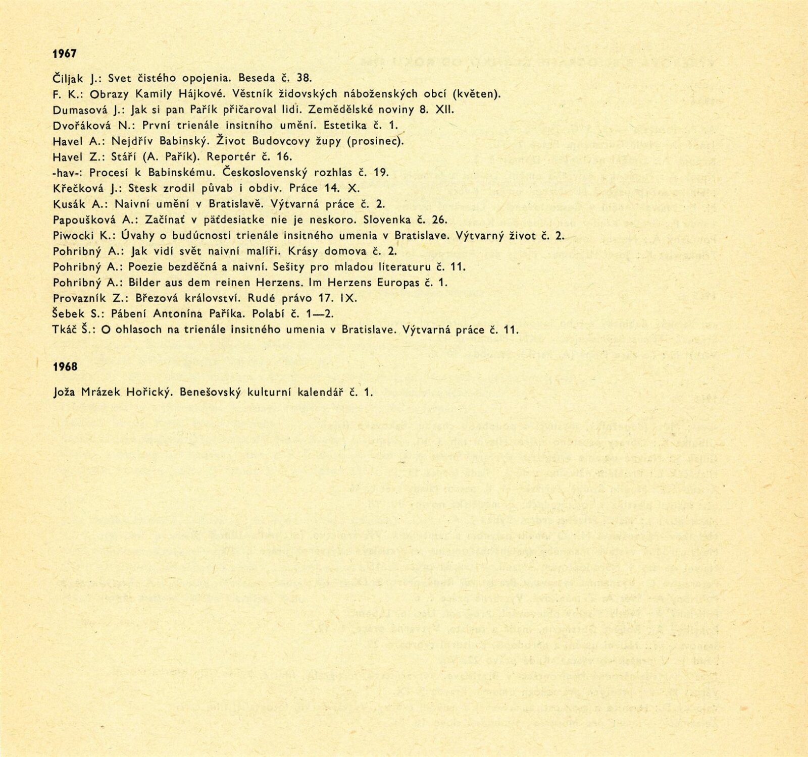 Rusalka vystupující z tůně. Naivní a fantaskní obrazy z Čech a Moravy 1964–1968: Dům umění města Brna, 4. 6. – 28. 7. 1968 / Text: Arsén Pohribný. – Brno: DUmB, 1968. – 34 s., obr., seznam výstav naivního umění 1964–1968, bibliografie od roku 1964, DU 506. – MZK; MG
