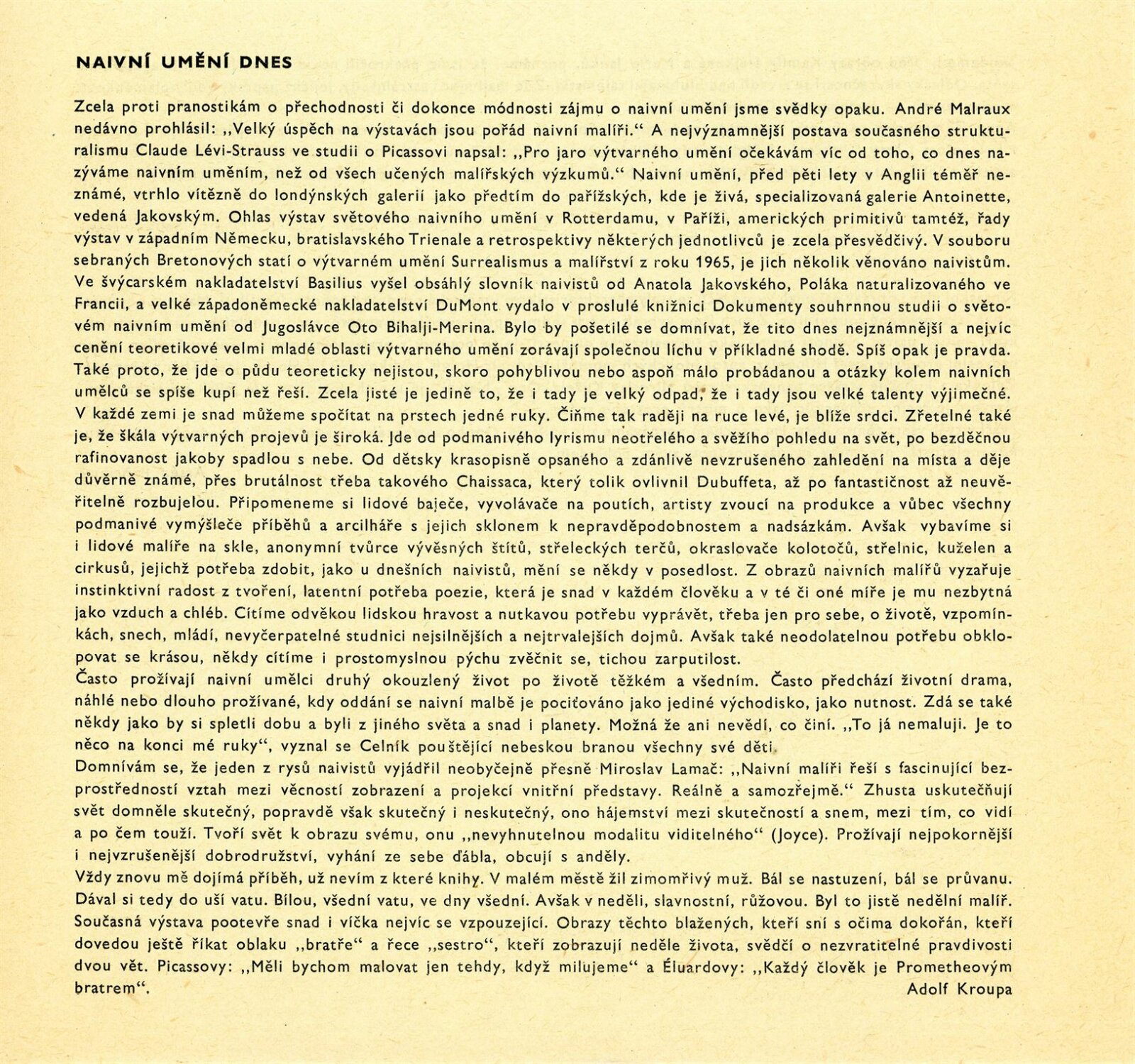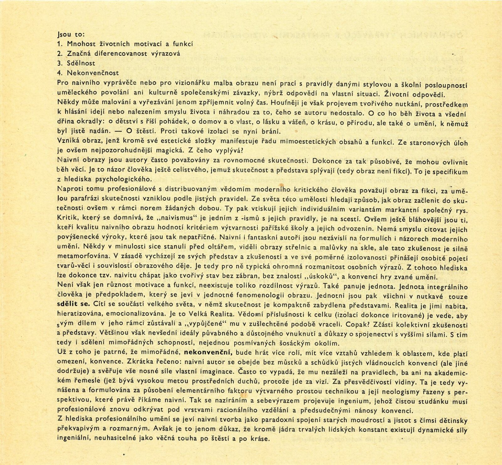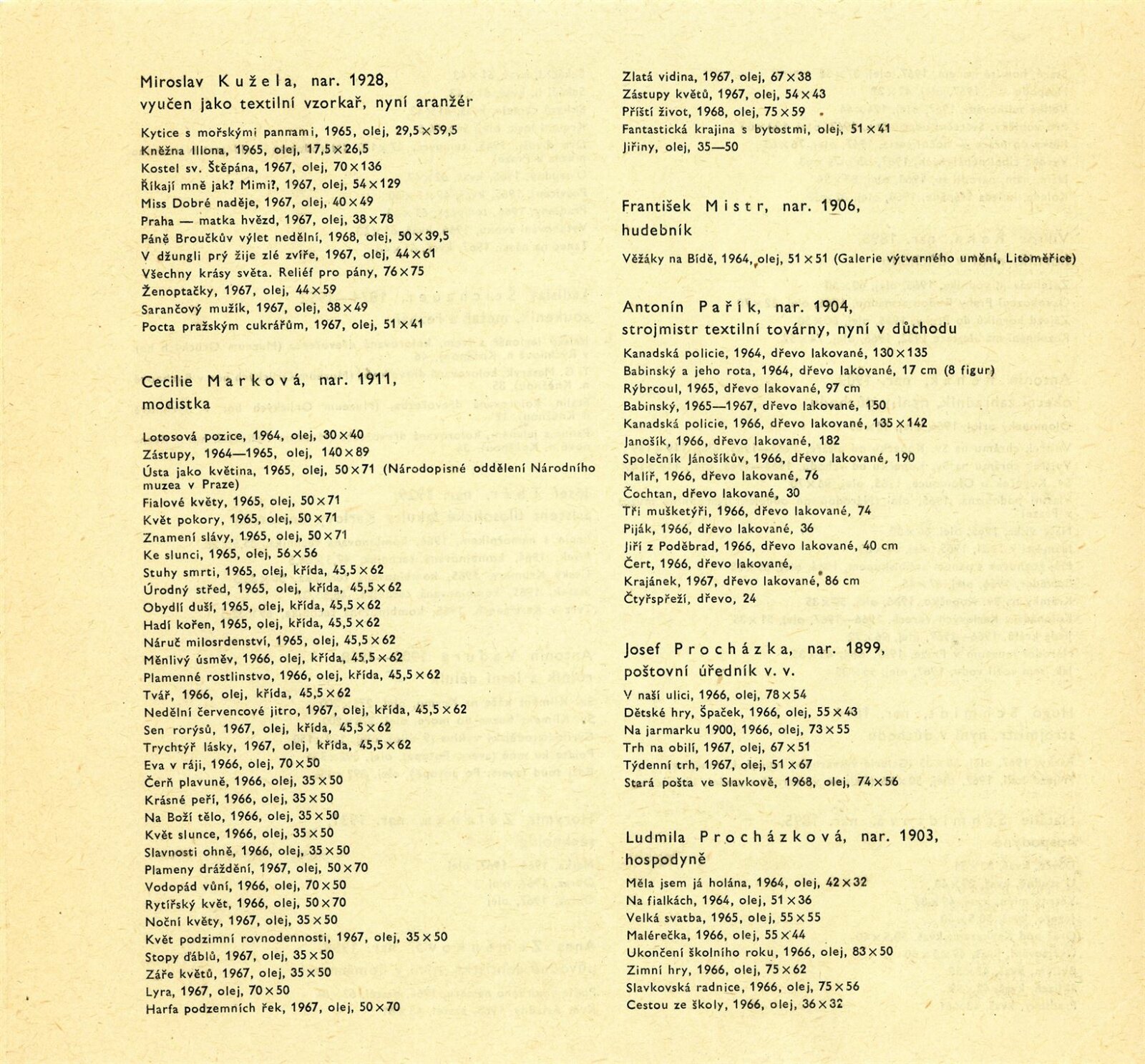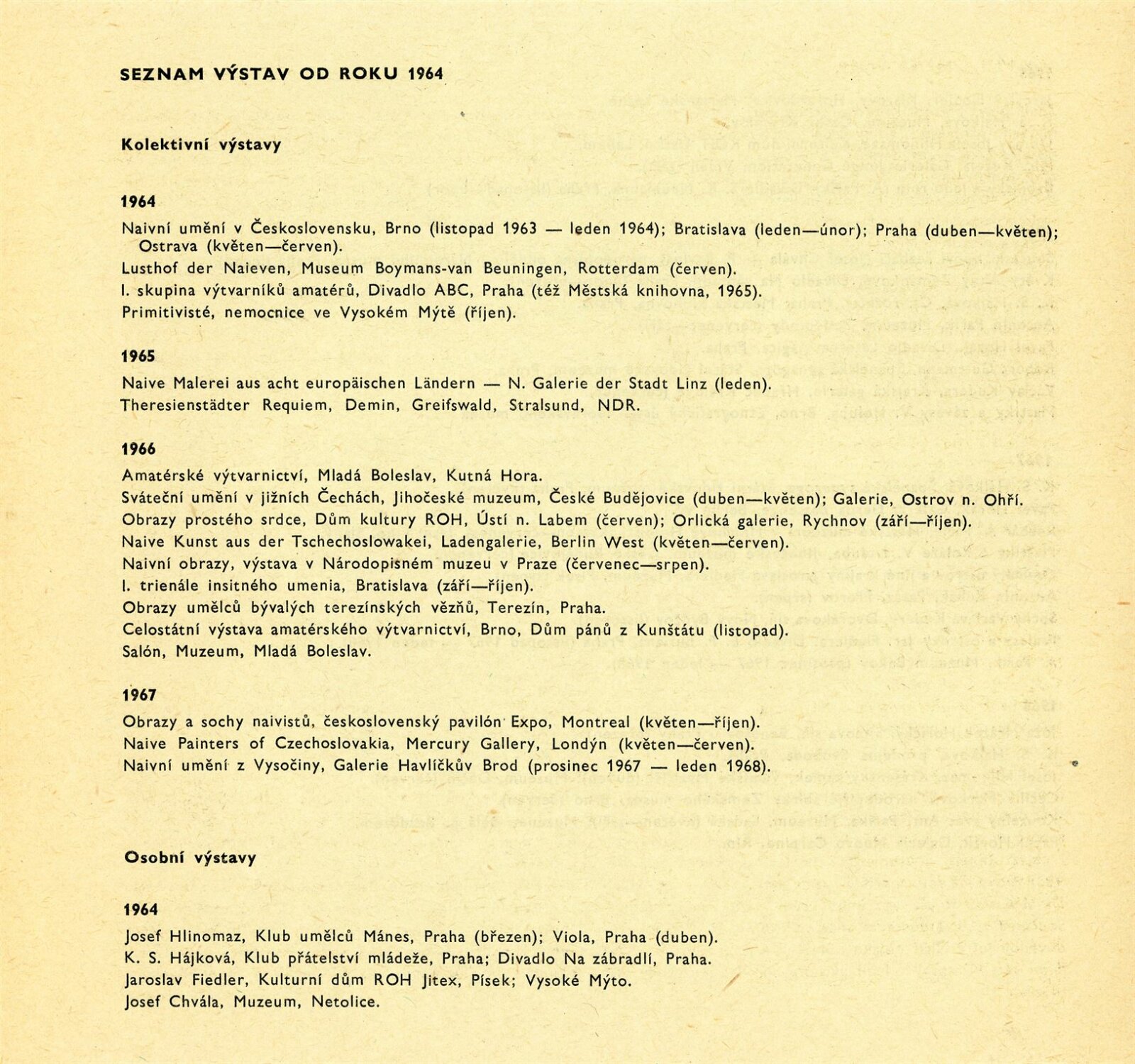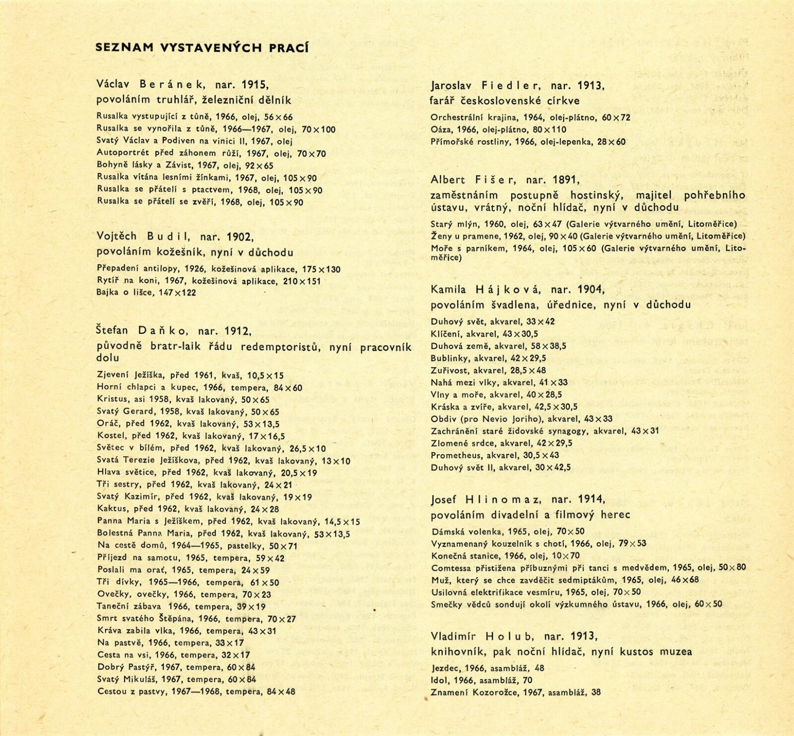 pozvánka, katalog, text anotace, úvodní slovo vernisáže, zamyšlení vystavujících autorů o umění, text (Adolf Kroupa, Arsén Pohribný), výběrová bibliografie článků od 1964, básně ad., seznam vystavujících, seznam vystavených děl, pojistný seznam, fotografie (vernisáže a výstavy, fotografie přihlášených děl), korespondence (DU + Arsén Pohribný, Václav Rykr, rukopisy Natálie Schmidtová – výběr, provozní korespondence), reversy (+ duplikáty reversů), plán propagace výstavy, recenze v tisku, katalog výstavy (Galerie Havlíčkův Brod), katalog Ludmily Pokorné (GHMP), plakáty výstav naivního umění (Národopisné muzeum Praha, Dům kultury Ústí nad Labem), digitalizovaný videozáznam ČT - záběry z výstav 1963-1969