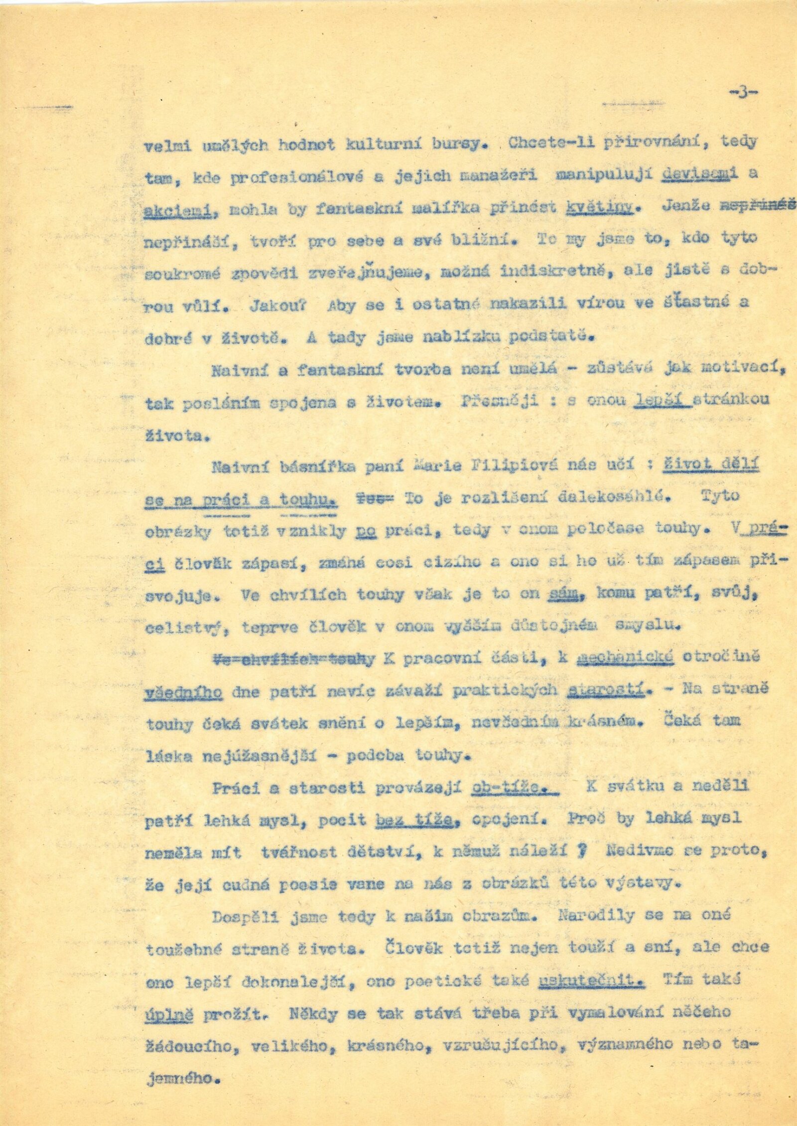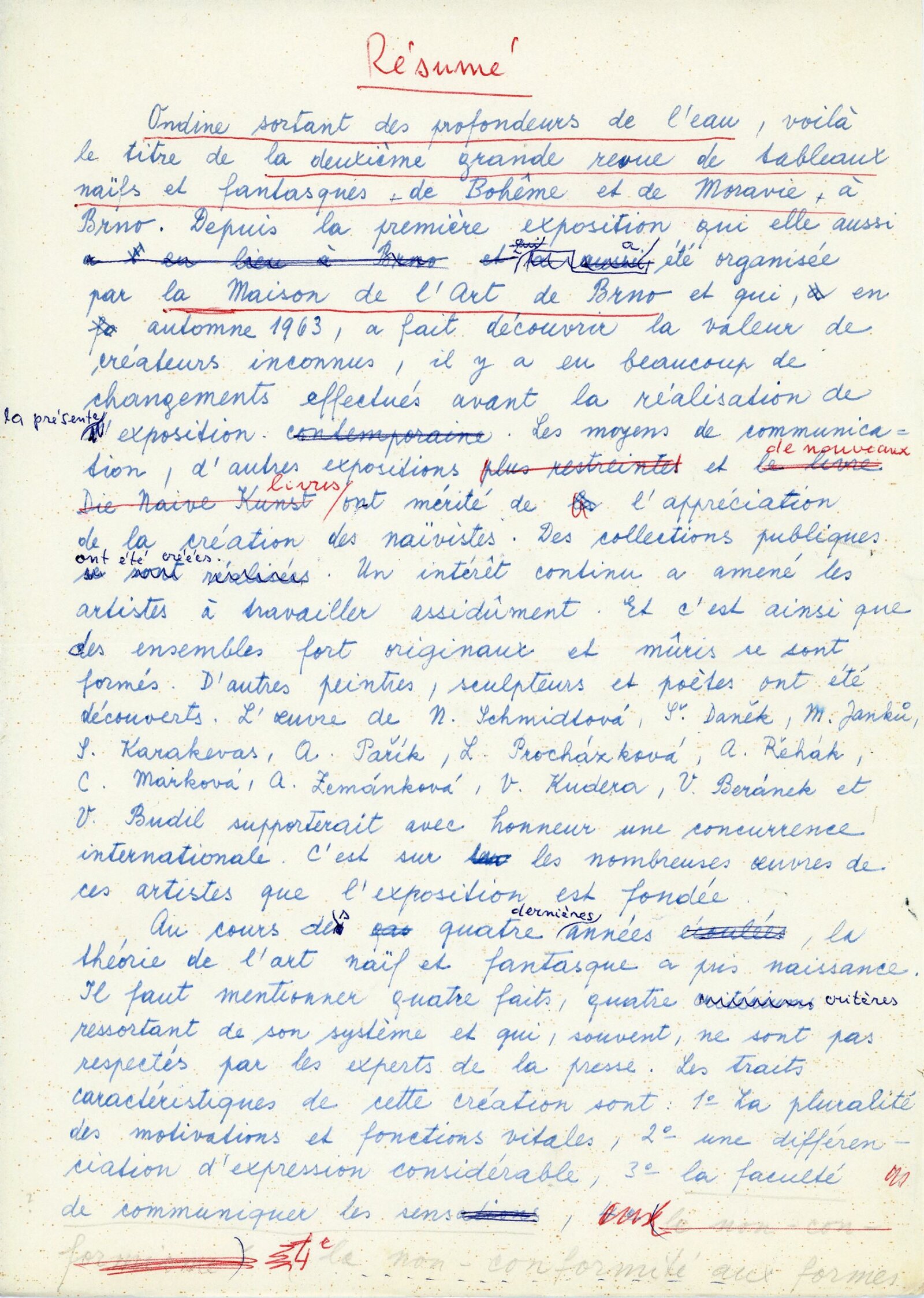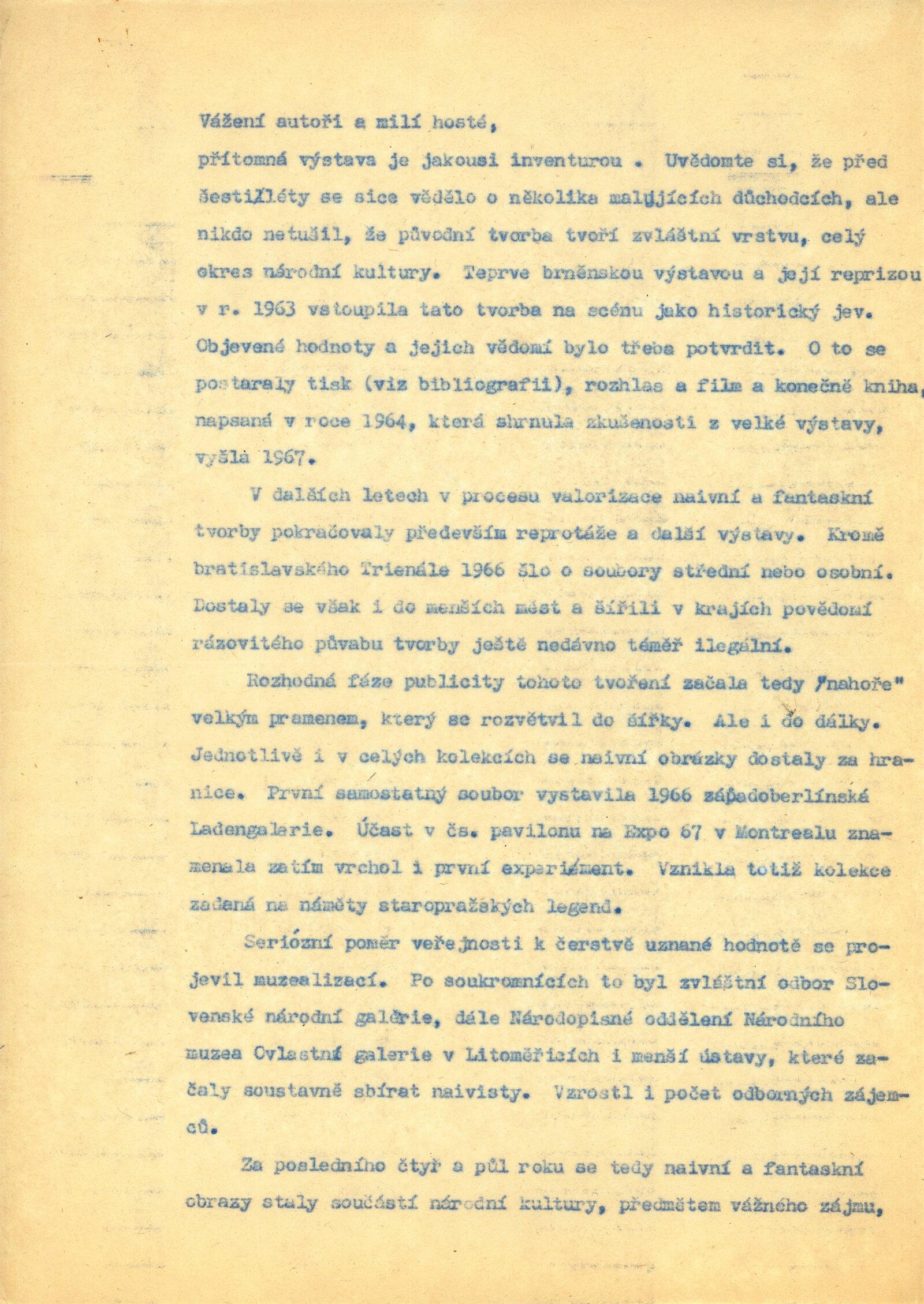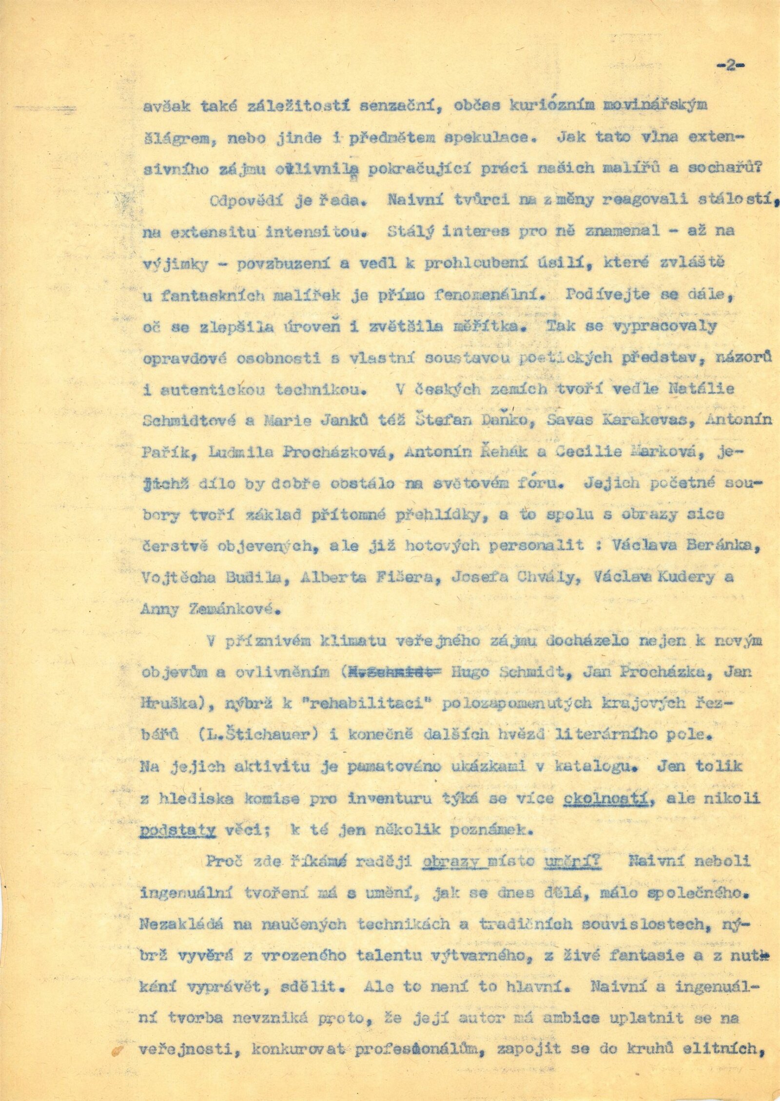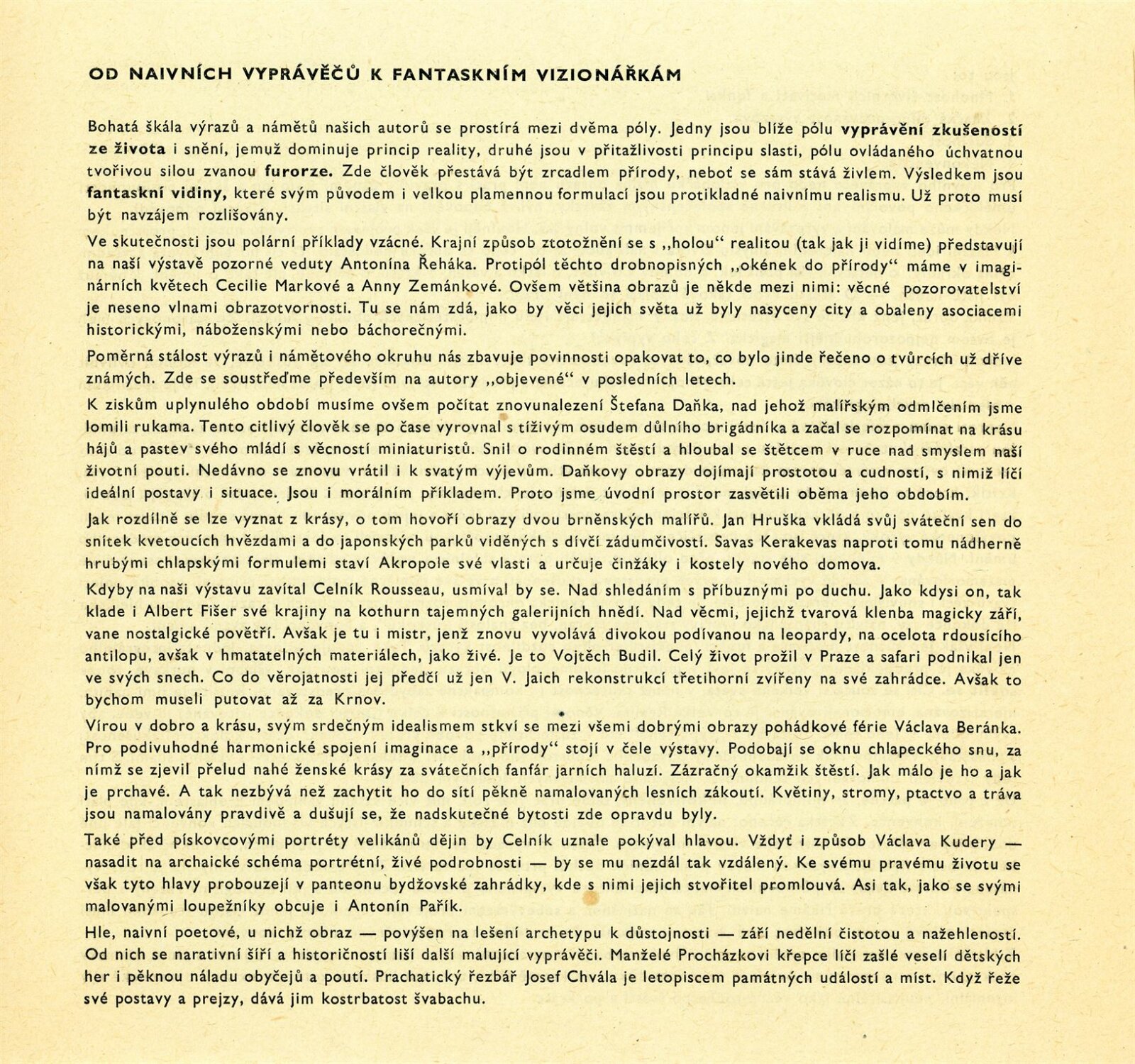 pozvánka, katalog, text anotace, úvodní slovo vernisáže, zamyšlení vystavujících autorů o umění, text (Adolf Kroupa, Arsén Pohribný), výběrová bibliografie článků od 1964, básně ad., seznam vystavujících, seznam vystavených děl, pojistný seznam, fotografie (vernisáže a výstavy, fotografie přihlášených děl), korespondence (DU + Arsén Pohribný, Václav Rykr, rukopisy Natálie Schmidtová – výběr, provozní korespondence), reversy (+ duplikáty reversů), plán propagace výstavy, recenze v tisku, katalog výstavy (Galerie Havlíčkův Brod), katalog Ludmily Pokorné (GHMP), plakáty výstav naivního umění (Národopisné muzeum Praha, Dům kultury Ústí nad Labem), digitalizovaný videozáznam ČT - záběry z výstav 1963-1969