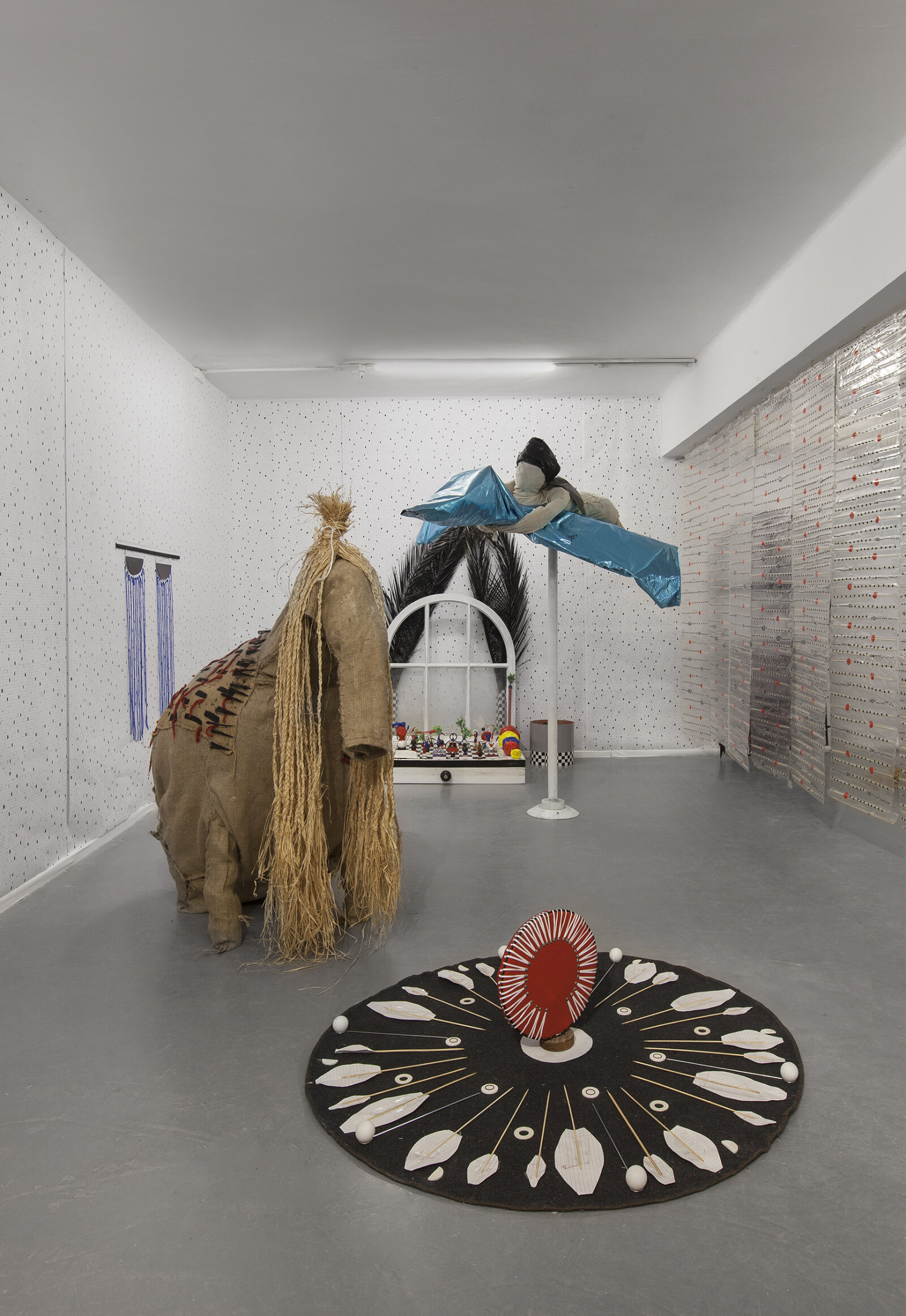 The core of her sculptural ensemble is comprised of quick, spontaneous links between raw materials and accessories bought in dollar stores to junk collected from street pavements and dragged to her studio; she dresses the space as she dresses the figures. Lack of hierarchy, ingenuity, and an ad-hoc attitude to creating art are values that form the roots of her work, those define her. It is an art fed from compulsive collecting, hoarding, and stockpiling. Art that sketches an alternative culture, undermining accepted methods but doing so without defiance, simply with the wonder and joy of this role reversal and the possibility of revitalizing street junk with new life, creating a new wealth of meanings in something grown worn, used, redundant.