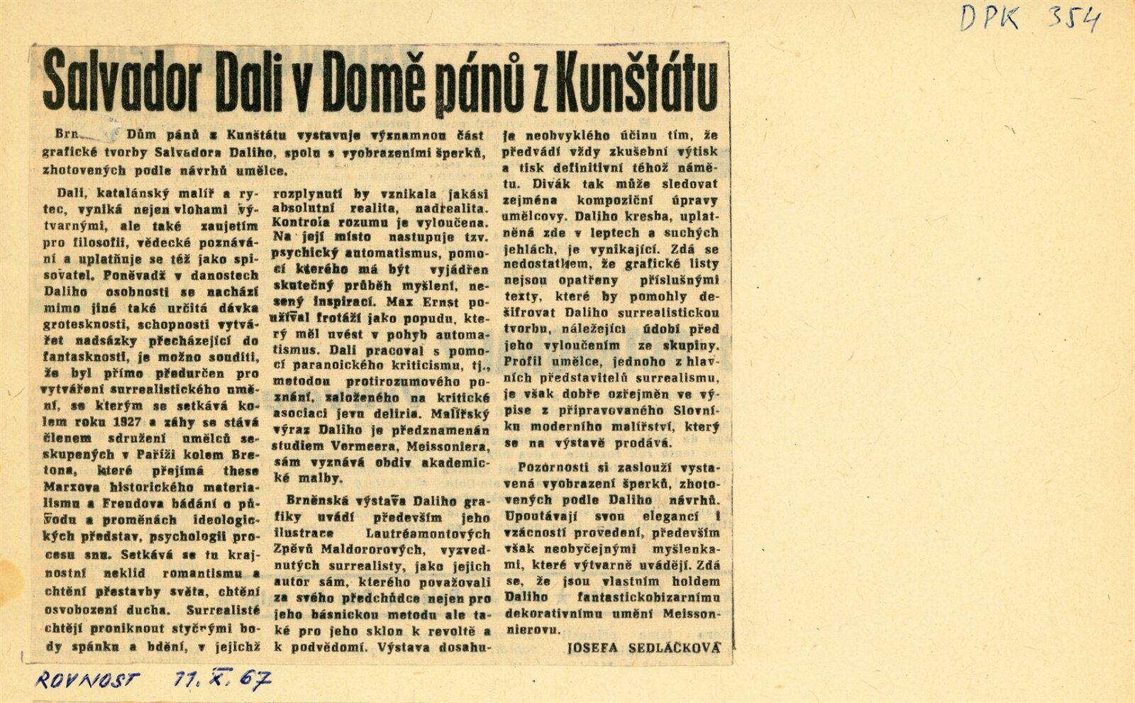 Salvator Dalí. Grafika: Dům umění města Brna/ Dům pánů z Kunštátu, 1. patro, 22. 9. – 23. 10. 1967/ Převzatý katalog. Salvator Dali. Katalog výstavy: Galerie D, Praha, 15. 6. – 23. 7. 1967/ Praha: Galerie D, 1967. – slož. list, 40 příl. na volných listech, DPK 354. – MZK; MG