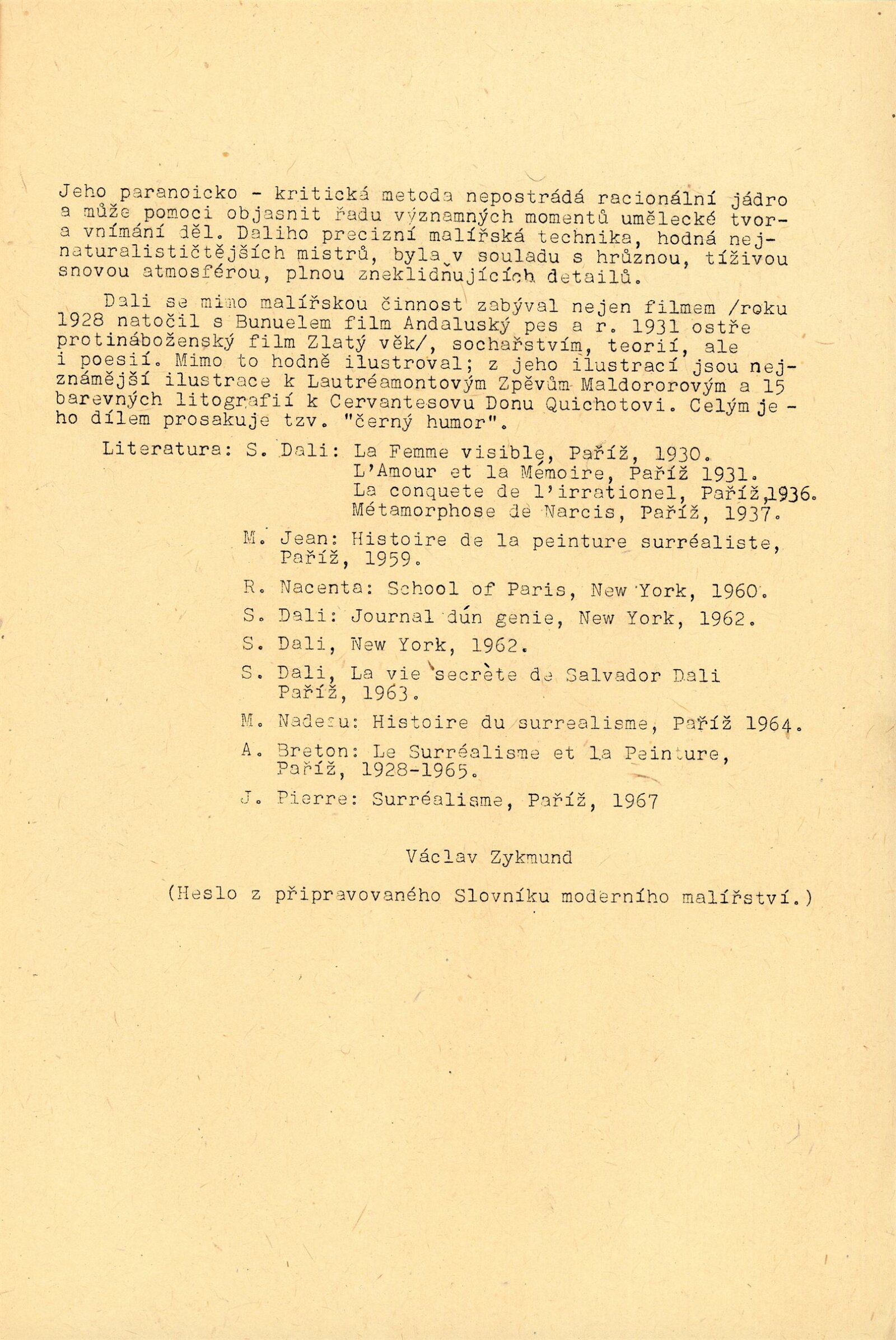společná pozvánka DPK 353 a 354, leták, heslo Václava Zykmunda o Dalím z připravovaného Slovníku moderního malířství, text Václava Zykmunda o surrealismu a Dalím, fotografie z výstavy, potvrzení o předání výstavy, provozní korespondence (dopis Zdeňka Macka Adolfu Kroupovi), recenze v tisku, pozvánky na výstavu (Galerie D v Praze a Galerie umění Karlovy Vary)