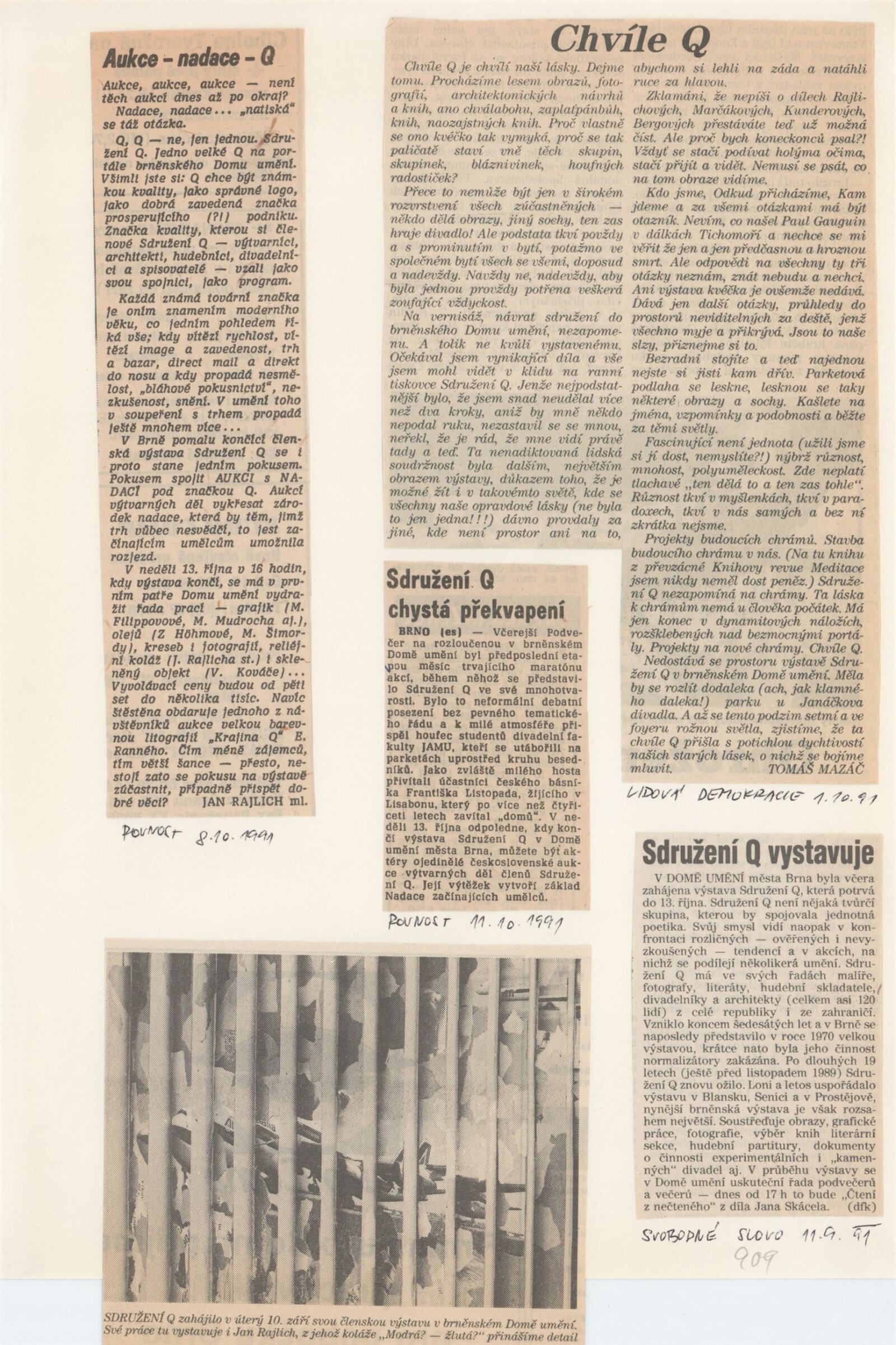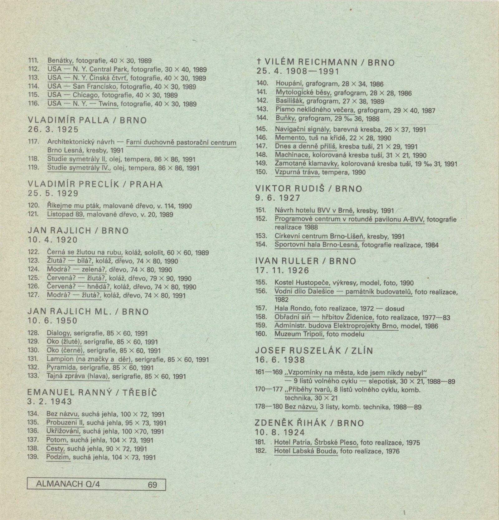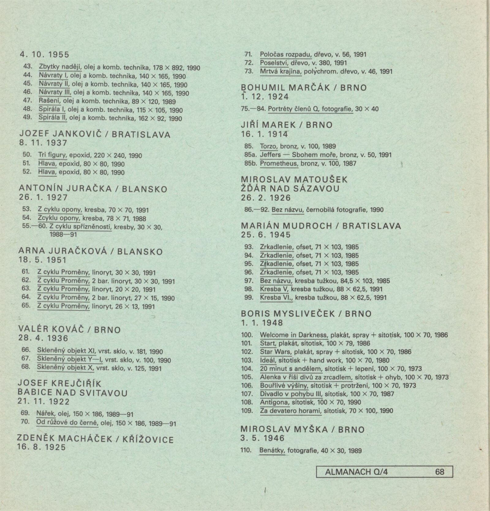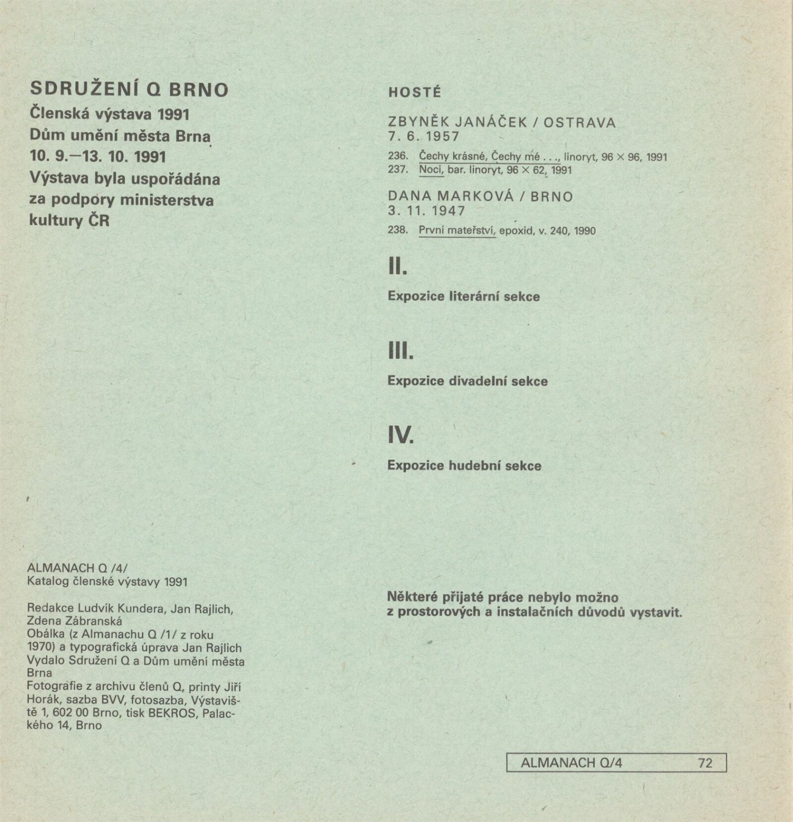 Almanach Q (4). Katalog členské výstavy 1991: Dům umění města Brna, 1. patro, 10. 9. – 13. 10. 1991 / Redakce: Ludvik Kundera, Jan Rajlich, Zdena Zábranská. – Brno: Sdružení Q, 1991. – 48 s., obr., seznam vystavených prací [8] s., DU 909